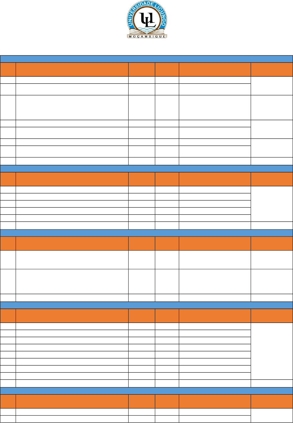 7.1.2. UNIVERSIDADE LICUNGO I. UNIVERSIDADE LICUNGO – QUELIMANE FACULDADE DE CIÊNCIAS E TECNOLOGIA Nr Cursos Regime Vagas Disciplinas de Exame Requisito para Acesso 1 Lic. em Ensino de Geografia L 30 Geografia e História 12 A do SNE (ou equivalente legal)2 Lic. em Ensino de Geografia PL 50 Geografia e Português 3 Lic. em Gestão Ambiental e Desenvolvimento Comunitário (GADEC) a) PL 50 Geografia e Português 12 A, 12 B do SNE (ou equivalente legal) 4 Lic. em Ensino de Biologia (Mocuba) EaD 60 Biologia e Química 12 B do SNE (ou equivalente legal)5 Lic. em Ensino de Química (Mocuba) EaD 60 Biologia e Química 6 Lic. em Ensino de Matamática (Mocuba) EaD 60 Matemática e Física 12B; 12C do SNE (ou equivalente legal)7 Lic. em Educação Visual L 25 Apt. em Desenho e Matemática Sub-Total 335 FACULDADE DE LETRAS E HUMANIDADES Nr Cursos Regime VAGAS Disciplinas de Exame Requisito para Acesso 8 Lic. em Direito L 30 Português e História 12 A do SNE (ou equivalente legal) 9 Lic. em Ensino de Inglês (Mocuba) EaD 60 Inglês e Português 10 Lic. em Ensino de Francês L 30 Francês e Português 11 Lic. em Sociologia L 30 Português e História 12 Lic. em Sociologia PL 50 Português e História Sub-Total 200 FACULDADE DE EDUCAÇÃO Nr Cursos Regime VAGAS Disciplinas de Exame Requisito para Acesso 14 Lic. em Psicologia Social e das Organizações PL 50 Português e Biologia 12 B do SNE (ou equivalente legal) 15 Lic. em Administração e Gestão da Educação (Gúruè) EaD 60 Português e Matemática 12 A, 12 B ou 12 C do SNE (ou equivalente legal) Sub-Total 110 FACULDADE DE ECONOMIA E GESTÃO Nr Cursos Regime VAGAS Disciplinas de Exame Requisito para Acesso 16 Lic. em Contabilidade L 30 Português e Matemática 12 A, 12 B ou 12 C do SNE (ou equivalente legal) 17 Lic. em Contabilidade PL 50 Português e Matemática 18 Lic. em Administração Pública e Autárquica L 30 Português e Matemática 19 Lic. em Administração Pública e Autárquica PL 50 Português e Matemática 20 Lic. em Gestão dos Recursos Humanos L 30 Português e Matemática 21 Lic. em Gestão dos Recursos Humanos PL 50 Português e Matemática 22 Lic. Gestão de Empresas L 30 Português e Matemática 23 Lic. Gestão de Empresas PL 50 Português e Matemática 24 Sub-Total 320 FACULDADE DE CIÊNCIAS AGRÁRIAS Nr Cursos Regime VAGAS Disciplinas de Exame Requisito para Acesso 24 Lic. em Agro-pecuária a) L 30 Biologia e Química 12 B do SNE (ou equivalente25 Lic. em Agro-pecuária a) PL 40 Biologia e Química legal)26 Lic. em Agro-processamento a) L 25 Biologia e Química Sub-Total 95 Total 1060 a). Cursos sujeitos a pagamento de taxa de actividades de campo, laboratório e serviços básicos semestrais a serem definidos II. UNIVERSIDADE LICUNGO – SOFALA FACULDADE DE CIÊNCIAS E TECNOLOGIA Nr Cursos Regime VAGAS Disciplinas de Exame Requisito para Acesso 1 Lic. em Ensino de Geografia a) L 30 Geografia e História 12 A do SNE (ou equivalente legal)2 Lic. em Ensino de Geografia a) PL 50 Geografia e História 3 Lic. em Gestão Ambiental e Desenvolvimento Comunitário (GADEC) a) L 30 Geografia e Português 12 A, 12 B do SNE (ou equivalente legal)4 Lic. em Gestão Ambiental e Desenvolvimento Comunitário (GADEC) a) PL 50 Geografia e Português 5 Lic. em Geologia a) L 27 Física e Química 12 B do SNE (ou equivalente legal) 6 Lic. em Ensino de Biologia L 30 Biologia e Química 7 Lic. em Ensino de Biologia PL 50 Biologia e Química 8 Lic. em Ensino de Química L 30 Biologia e Química 9 Lic. em Ensino de Química (Beira) EaD 60 Biologia e Química 10 Lic. em Estatística e Gestão de Informação L 30 Matemática e Física 12B; 12C do SNE (ou equivalente legal) 11 Lic. em Estatística e Gestão de Informação PL 50 Matemática e Física 12 Lic. em Engenharia de Construção Civil a) L 30 Matemática e Física 13 Lic. em Educação Visual L 25 Apt. em Desenho e Matemática Sub – Total 492 FACULDADE DE LETRAS E HUMANIDADES Nr Cursos Regime VAGAS Disciplinas de Exame Requisito para Acesso 14 Lic. em Ensino de Inglês L 30 Inglês e Português 12 A do SNE (ou equivalente legal) 15 Lic. em Ensino de Inglês PL 50 Inglês e Português 16 Lic. em Ensino de Filosofia L 30 Filosofia e História 17 Lic. em Ensino de Francês L 30 Francês e Português 18 Lic. em Ensino de Português L 30 Português e Inglês 19 Lic. em Antropologia L 30 Português e História 20 Lic. em Jornalismo L 25 Português e História 21 Lic. em Direito PL 50 Português e História 22 Lic. em Ciências Políticas e Governação L 30 Português e História 23 Lic. em Ciências Políticas e Governação PL 50 Português e História 24 Lic. em Sociologia L 30 Português e História 25 Lic. em Sociologia PL 50 Português e História Sub-Total 435 FACULDADE DE EDUCAÇÃO Nr Cursos Regime VAGAS Disciplinas de Exame Requisito para Acesso 26 Lic. em Psicologia Educacional L 30 Português e Biologia 12 B do SNE (ou equivalente legal)27 Lic. em Psicologia Social e das Organizações PL 50 Português e Biologia 28 Lic. em Administração e Gestão da Educação (Beira) EaD 60 Português e Matemática 12 A, 12 B ou 12 C do SNE (ou equivalente legal) Sub-Total 140 FACULDADE DE ECONOMIA E GESTÃO Nr Cursos Regime VAGAS Disciplinas de Exame Requisito para Acesso 29 Lic. em Gestão de Empresas L 30 Português e Matemática 12 A, 12 B ou 12 C do SNE (ou equivalente legal) 30 Lic. em Gestão de Empresas PL 50 Português e Matemática 31 Lic. Em Gestão dos Recursos Humanos L 30 Português e Matemática 32 Lic. Em Gestão dos Recursos Humanos PL 50 Português e Matemática 33 Lic. Em Contabilidade L 30 Português e Matemática 34 Lic. Em Contabilidade PL 50 Português e Matemática Sub-Total 240 Total 1307 a). Cursos sujeitos a pagamento de taxa de actividades de campo, Laboratório e serviços básicos semestrais a serem definidos Resumo de vagas - UniLicungo No Local Vagas 01 Zambézia 1060 02 Sofala 1307 Total 2367