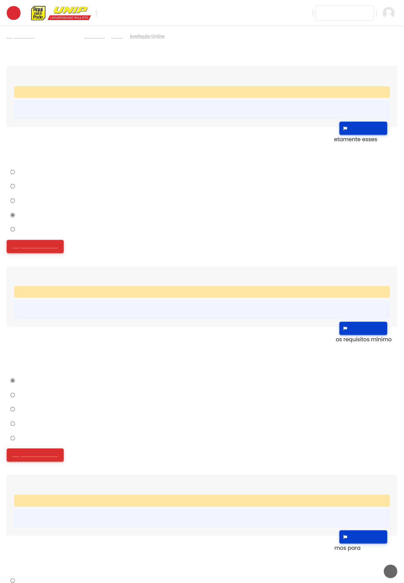 - Minhas disciplinas - - - Bibliotecas Virtuais Página inicial S6-B0226 Geral Avaliação Online A PIC é a pressão resultante da presença de três componentes dentro da caixa craniana. Qual alternativa apresenta corretamente esses componentes? Escolha uma opção: a. Vascular, liquórica e linfática. b. Liquórica, linfática e arterial c. Parenquimatoso, arterial e liquórica. d. Parenquimatoso, liquórica e vascular. e. Parenquimatoso, vascular e linfática. Limpar minha escolha A Resolução – RDC nº 26, de 11 de maio de 2012, altera a Resolução RDC nº 07, de 24 de fevereiro de 2010, que dispõe sobre os requisitos mínimos para o funcionamento de Unidades de Terapia Intensiva e dá outras providências. De acordo com essa RDC, o dimensionamento de profissionais assistenciais de nível superior por leitos ficou: Escolha uma opção: a. Um profissional assistencial no mínimo para cada dez leitos por turnos. b. Um profissional assistencial para cada dez leitos por turnos. c. Um profissional assistencial no mínimo para cada cinco leitos por turnos. d. Um profissional assistencial para cada oito leitos por turnos. e. Um profissional assistencial no mínimo para cada oito leitos por turnos. Limpar minha escolha A RDC-26/2012, do Ministério da Saúde/Agência Nacional de Vigilância Sanitária (MS/ANSIVA), designou os requisitos mínimos para funcionamento de UTI. Analise as alternativas e marque a incorreta. Escolha uma opção: a. Todo paciente grave deve ser transportado com acompanhamento contínuo, no mínimo de um médico e de um enfermeiro, ambos Marcar questão Questão 1 Ainda não respondida Vale 1,00 ponto(s). Marcar questão Questão 2 Ainda não respondida Vale 1,00 ponto(s). Marcar questão Questão 3 Ainda não respondida Vale 1,00 ponto(s). http://www.unipvirtual.com.br/avaunip http://www.unipvirtual.com.br/avaunip/ http://www.unipvirtual.com.br/avaunip/course/view.php?id=3513 http://www.unipvirtual.com.br/avaunip/course/view.php?id=3513#section-0 http://www.unipvirtual.com.br/avaunip/mod/quiz/view.php?id=83738 http://www.unipvirtual.com.br/avaunip/mod/quiz/attempt.php?attempt=5656635&cmid=83738 http://www.unipvirtual.com.br/avaunip/mod/quiz/attempt.php?attempt=5656635&cmid=83738 p g p p com habilidades para o atendimento de urgência e emergência. b. Médicos plantonistas, enfermeiros assistenciais, fisioterapeutas e técnicos de enfermagem devem estar disponíveis em tempo integral para assistência aos pacientes internados na UTI. c. As Unidades de Terapia Intensiva Adulto, Pediátrica e Neonatal devem ocupar salas exclusivas e distintas. d. Todo paciente em UTI deve receber assistência integral e interdisciplinar. e. Somente podem ser coordenadores de enfermagem e fisioterapia profissionais especialistas em terapia intensiva. Limpar minha escolha A hipernatremia ocorre quando as perdas de H2O forem maiores do que a perdas de Na+ ou quando a ingestão de água for insuficiente. Em geral, as consequências são desidratação e hiperosmolaridade, e tardiamente o acúmulo efetivo de Na+, tal como no hiperaldosteronismo. De acordo com o enunciado, assinale os principais sinais e sintomas observados em um paciente com hipernatremia: Escolha uma opção: a. Cãibras, desidratação, mucosas ressecadas, anorexia, hiperosmolaridade. b. Sede, rubor de pele, febre, oligúria, letargia, náusea, hiperosmolaridade. c. Sede, desidratação, cãibras, rubor de pele, oligúria, letargia hiposmolaridade. d. Letargia, oligúria, mucosas ressecadas, pele ruborizada, hiposmolaridade. e. Sede, mucosas ressecadas, rubor de pele, febre, oligúria, hiperosmolaridade. Limpar minha escolha Assinale a opção correta acerca da hemorragia digestiva alta (HDA). Escolha uma opção: a. Embora as varizes esofágicas ocorram na maioria dos pacientes cirróticos, devido à resistência ao fluxo portal, somente a minoria dos casos apresentará sangramento. b. A somatostatina está indicada rotineiramente no tratamento da HDA devido aos seus efeitos redutores do fluxo sanguíneo esplâncnico e da secreção ácida, e seu uso precoce resulta em menor morbimortalidade. c. Em pacientes com instabilidade hemodinâmica, a endoscopia digestiva alta deve ser a primeira medida terapêutica, visando à rápida interrupção do sangramento. d. Embora os inibidores da bomba de prótons sejam eficazes em promover a redução da HDA e da mortalidade, não há comprovação da diminuição da taxa de recorrência de sangramento com o uso desses agentes. e. A infecção por Helicobacter pylori é observada com mais frequência nas úlceras gástricas, que apresentam maior gravidade do sangramento quando comparadas às úlceras duodenais. Limpar minha escolha Marcar questão Questão 4 Ainda não respondida Vale 1,00 ponto(s). Marcar questão Questão 5 Ainda não respondida Vale 1,00 ponto(s). Questão 6 Ainda não respondida http://www.unipvirtual.com.br/avaunip/mod/quiz/attempt.php?attempt=5656635&cmid=83738 http://www.unipvirtual.com.br/avaunip/mod/quiz/attempt.php?attempt=5656635&cmid=83738 http://www.unipvirtual.com.br/avaunip/mod/quiz/attempt.php?attempt=5656635&cmid=83738 As diretrizes para a reanimação cardiopulmonar (RCP) e o atendimento cardiovascular de emergência (ACE), aprovadas em 2010, apresentam mudanças quanto às ações a serem realizadas pelos profissionais da saúde. Assinale a alternativa que contém as principais mudanças: Escolha uma opção: a. Alteração para A-B-C, ênfase nas compressões torácicas com frequência mínima de 90/min, minimização das interrupções nas pressões torácicas, retorno total do tórax pós-compressão e manter compressão cricoide. b. Alteração para C-A-B, ênfase nas compressões torácicas com frequência mínima de 100/min, minimização das interrupções nas compressões torácicas e retorno total do tórax pós-compressão. c. Alteração para C-A-B, ênfase na pressão cricoide, "ver, ouvir e sentir se há respiração", ênfase n
