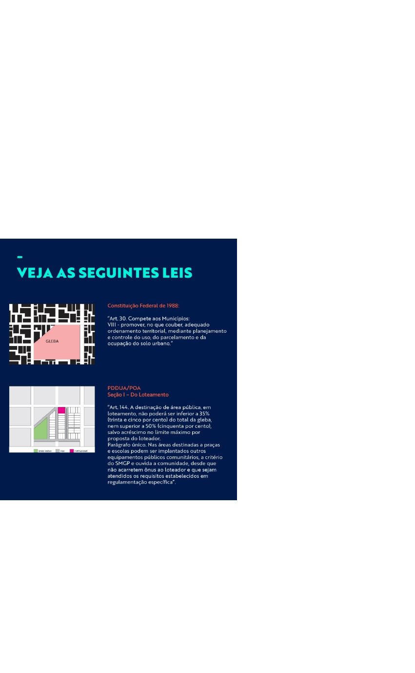 Parcelamento do solo urbano Desafio Você é proprietário de um terreno e vai entrar com o processo para parcelamento do solo na Prefeitura de Porto Alegre. A gleba possui 6.000 m², e deverá contar com a abertura de novas vias, espaços verdes e institucionais, além dos lotes residenciais, foco principal do projeto. O projeto contava com 1000m² de área verde (parques e praças), 3 novas vias - sendo uma delas a continuação de rua existente - além de 38 lotes de frente de 5m e 90m2, 10 lotes de 4m e 90m², e dois terrenos irregulares, com 90m² cada. Ao receber informações do protocolo feito na Secretaria Municipal de Planejamento Urbano, órgão responsável por regulamentar essas intervenções urbanas, viu que o projeto havia sido negado, já que havia erros e aplicações fora das normas. Veja abaixo a gleba e projeto e a legislação vigente. Identifique os erros e diga como corrigi-los, com base nesses dados. Padrão de resposta esperado Seguindo as legislações fornecidas, está correto o Município receber o pedido de loteamento e regulamentá-lo, a fim de promover a urbanização da cidade. Sobre as informações técnicas, o somatório das áreas verdes e vias de circulação deve ser entre 35% e 50%, sendo que nesse projeto é de aproximadamente 3000m², o que fica próximo do limite máximo de ocupação. Talvez, numa análise com dados mais precisos, esse número ultrapassasse a metade da área da gleba. Em relação ao tamanho dos lotes, temos equívocos nas áreas e testadas de lotes mínimos. O mínimo aceito, na legislação municipal de Porto Alegre, para testada de lotes residenciais, é de cinco (5) metros. Em relação à área, que nesse loteamento foi 90m², apresenta valor inferior ao recomendado, que é 150m², . Por isso, para tornar um projeto correto, as áreas verdes e de circulação devem ser diminuídas, dando mais espaço para os lotes, que deverão ser maiores tanto em relação à testada, quanto em relação à área mínima.