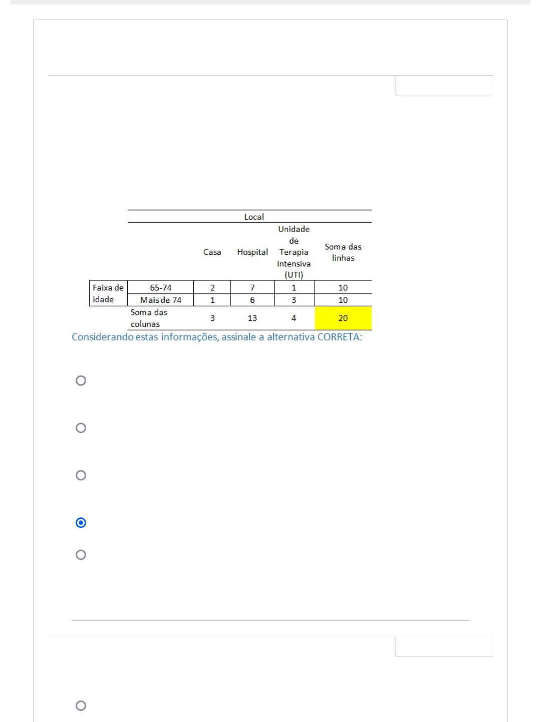 a. b. c. d. e. …PERGUNTA 1 Com base nos estudos do artigo intitulado Where’s cancer patients die (PUBLIC HEALTH REPORTS, 1983, p. 1.973), um grupo de estudantes resolveu repetir o teste para 20 pacientes, com enfoque nos locais dos óbitos e nas duas faixas etárias com maior incidência, sendo que em cada faixa foram avaliados 10 óbitos, a saber: Somente para o nível de significância de 5% a hipótese nula é aceita. Não se rejeita a hipótese nula para o nível de significância de 1%. Somente para o nível de significância de 1% a hipótese nula é aceita. Para os níveis de significância de 1 e 5% a hipótese nula é aceita. Não se rejeita a hipótese nula para o nível de significância de 5%. 0,175 pontos a. PERGUNTA 2 Com relação ao teste exato de Fisher, assinale a alternativa CORRETA: Utiliza-se como comparação ao teste qui-quadrado. 0,175 pontos Firefox https://bb.cruzeirodosulvirtual.com.br/webapps/assessment/take/launch.j... 1 of 4 23/11/2021 08:16 b. c. d. e. A expressão para o cálculo do teste baseia-se na aleatoriedade das combinações possíveis de acordo com as observações. É aplicado quando o número de observações esperadas (E) é menor que 5 e o número de indivíduos estudados é inferior a 20. Aplica-se a um número de indivíduos estudados e inferiores a 5. Aplica-se a um número de observações esperadas e superiores a 20. PERGUNTA 3 0,175 pontos Firefox https://bb.cruzeirodosulvirtual.com.br/webapps/assessment/take/launch.j... 2 of 4 23/11/2021 08:16 a. b. c. d. e. Em 1979, nos Estados Unidos houve um estudo com 445 estudantes universitários (YOUTH AND SOCIETY, 1979, p. 323-334) no qual foram avaliados os usos de maconha pelos alunos e de álcool e drogas psicotrópicas pelos seus pais, chegando-se à seguinte Tabela: Afirmando-se, assim, que: I Ao nível de significância de 5%, há independência entre o uso de álcool e drogas pelos pais e maconha pelos filhos. II Ao nível de significância de 1%, há independência entre o uso de álcool e drogas pelos pais e maconha pelos filhos. III Para ambos os níveis não há independência. É VERDADEIRO o que se afirma em I, apenas. III, apenas. I e II, apenas. I, II e III. II, apenas. PERGUNTA 4 Foram avaliados os períodos de experiência de treinadores do Ensino Médio (homens e mulheres) conforme está no artigo intitulado Sex bias and the vality of believed differences between male and female interscholastic athletic coaches (1990) e a seguir: Carvalho 1,72 0,67 1,55 1,56 1,42 1,23 1,77 0,48 Pinheiro 0,98 1,4 1,33 1,52 0,73 1,2 Considerando os níveis de significância de 1 e 5%, RESPECTIVAMENTE, assinale a alternativa CORRETA: Firefox https://bb.cruzeirodosulvirtual.com.br/webapps/assessment/take/launch.j... 3 of 4 23/11/2021 08:16 b. c. d. e. Não há diferença entre os tempos de experiência entre homens e mulheres para o nível de significância de 5%, apenas. A hipótese nula é rejeitada e, portanto, há diferenças. Não há diferença entre os tempos de experiência entre homens e mulheres para o nível de significância de 1 e 5%. Não há diferença entre os tempos de experiência entre homens e mulheres para o nível de significância de 1%, apenas. Firefox https://bb.cruzeirodosulvirtual.com.br/webapps/assessment/take/launch.j... 4 of 4 23/11/2021 08:16