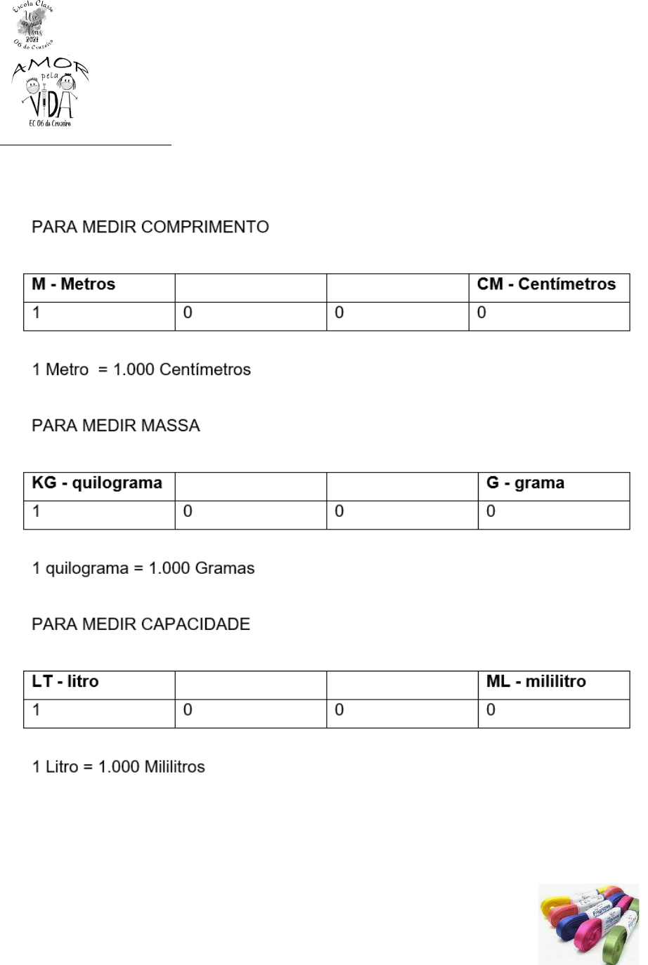 Atividade para o dia 09 de julho de 2021 4º ano PROFESSOR (A):___________________________ANO/TURMA:________ ESTUDANTE:__________________________________________________ OBJETIVOS DA ATIVIDADE: Realizar transformações de unidades de medida, solucionando situações problema; Produzir texto a partir de imagens; Explorar mais sobre a diversidade religiosa existente em nosso país. Antes de solucionar as situações problema, lembre-se de como transformar medidas. Atividades 1) Comprei 350 centímetros de cetim. Minha irmã comprou o dobro. Quantos metros de cetim compramos juntos? Resposta: ____________________________________________________________ Atividade para o dia 09 de julho de 2021 4º ano 2) Comprei 3600 centímetros de tecido para fazer 3 toalhas de mesa do mesmo tama- nho. Quantos metros terá cada toalha? Resposta: ___________________________________________________________ 3) Coloque um (x) no que pode ser medido com Metros: a.( ) tecido b.( ) estradas c.( ) ruas d.( ) feijão e.( ) muros f. ( ) arroz g.( ) linha 4. Seis estudantes do 5º ano se pesaram na balança de uma farmácia próximo a uma escola e fizeram os seguintes registros.: Observando os dados registrados por eles, responda: a) Qual o nome do (a) estudante que possui a maior massa? ______________________________ b) Quais os nomes dos alunos que possuem mais de 30 quilos? ______________________________ c) Qual a diferença entre as medidas de massa de Cleiton e de Ana? ______________________________ Atividade para o dia 09 de julho de 2021 4º ano 5. Rita foi ao supermercado realizar algumas compras. Comprou 5 kg de arroz, 7 kg de carne, 4 kg de feijão, 4 pacotes de macarrão de 500 gramas cada e 4 pacotes de biscoitos de 250 g cada um. Tendo como base as informações acima, responda: a) Quantos quilogramas, em compras, Rita levou para casa? _______________________________ b) Uma sacola suporta 4 kg. De quantas sacolas Rita precisará para carregar suas compras? _______________________________ 6. Observe o gráfico para responder às questões: Agora, responda: a) Que animais possuem massa menor que 2000 kg? _______________________ b) Quais animais possuem massa acima de 2 000 kg?_______________________ c) Que animal possui massa maior que 4 000 kg? __________________________ d) Qual o animal que possui a menor massa? _____________________________ Produção de texto Produzir um texto seguindo a sequência de imagens. Antes de iniciar a produção muita atenção as seguintes orientações: 1-Observar o que está acontecendo na sequência das imagens; 2-Conte o que está acontecendo em cada quadrinho; 3- Por que a história é engraçada? 4-Dê um final engraçado a sua história em quadrinhos 5- Não esqueça do título da sua história - Atividade para o dia 09 de julho de 2021 4º ano Ensino religioso Assista o vídeo abaixo e depois faça um desenho no caderno de desenho mostrando a união das pessoas independente da religião e crie uma frase bem legal para o seu dese- nho. https://www.youtube.com/watch?v=m7MoQFFQdog https://www.youtube.com/watch?v=m7MoQFFQdog