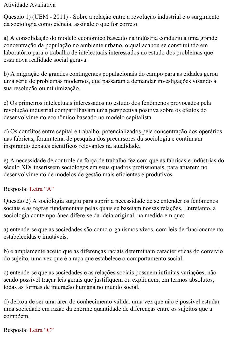 Atividade Avaliativa Questão 1) (UEM - 2011) - Sobre a relação entre a revolução industrial e o surgimento da sociologia como ciência, assinale o que for correto. a) A consolidação do modelo econômico baseado na indústria conduziu a uma grande concentração da população no ambiente urbano, o qual acabou se constituindo em laboratório para o trabalho de intelectuais interessados no estudo dos problemas que essa nova realidade social gerava. b) A migração de grandes contingentes populacionais do campo para as cidades gerou uma série de problemas modernos, que passaram a demandar investigações visando à sua resolução ou minimização. c) Os primeiros intelectuais interessados no estudo dos fenômenos provocados pela revolução industrial compartilhavam uma perspectiva positiva sobre os efeitos do desenvolvimento econômico baseado no modelo capitalista. d) Os conflitos entre capital e trabalho, potencializados pela concentração dos operários nas fábricas, foram tema de pesquisa dos precursores da sociologia e continuam inspirando debates científicos relevantes na atualidade. e) A necessidade de controle da força de trabalho fez com que as fábricas e indústrias do século XIX inserissem sociólogos em seus quadros profissionais, para atuarem no desenvolvimento de modelos de gestão mais eficientes e produtivos. Resposta: Letra “A” Questão 2) A sociologia surgiu para suprir a necessidade de se entender os fenômenos sociais e as regras fundamentais pelas quais se baseiam nossas relações. Entretanto, a sociologia contemporânea difere-se da ideia original, na medida em que: a) entende-se que as sociedades são como organismos vivos, com leis de funcionamento estabelecidas e imutáveis. b) é amplamente aceito que as diferenças raciais determinam características do convívio do sujeito, uma vez que é a raça que estabelece o comportamento social. c) entende-se que as sociedades e as relações sociais possuem infinitas variações, não sendo possível traçar leis gerais que justifiquem ou expliquem, em termos absolutos, todas as formas de interação humana no mundo social. d) deixou de ser uma área do conhecimento válida, uma vez que não é possível estudar uma sociedade em razão da enorme quantidade de diferenças entre os sujeitos que a compõem. Resposta: Letra “C” Questão 3) O autor considerado “pai” da sociologia, Augusto Comte, acreditava que a nova ciência das sociedades deveria igualar-se às demais ciências da natureza que se pautavam pelos fenômenos observáveis e mensuráveis para que assim fosse possível apreender as regras gerais que regem o mundo social do indivíduo. Essa perspectiva ideológica é chamada de: a) Iluminismo. b) Darwinismo. c) Dadaísmo. d) Positivismo. Resposta: Letra “D” Questão 4) Com base na leitura do texto “Sociologia e Senso Comum”, informe por quê é importante fazer uma distinção entre o conhecimento sociológico formal e o senso comum? Resposta: O conhecimento sociológico parte da análise do indivíduo e do espaço ao seu redor, contribuindo para as reflexões entre as classes, as culturas etc. O senso comum é, em seu lugar, um conjunto de conhecimentos empíricos que, conectados, contribuem e contribuíram para o avanço social, dada sua assertividade prática e eficiência social. Diferem-se, no entanto, por conta das características mais científicas que a sociologia possui, aliada aos seus métodos.
