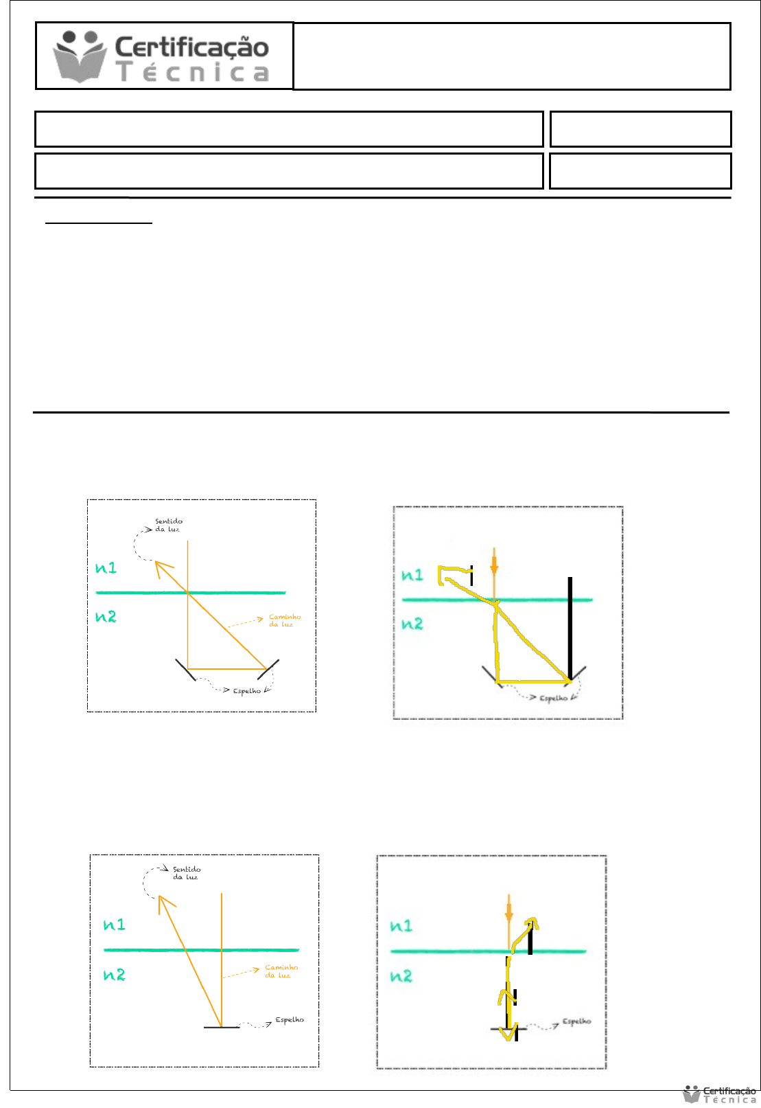 Nivelamento de Física Data: 16/05/2021 Aluno (a): Igor do Nascimento Barbosa Atividade Prática 1 INSTRUÇÕES: · Esta Avaliação contém 2 (duas) questões, totalizando 10 (dez) pontos; · Baixe o arquivo disponível com a Atividade Pratica; · Você deve preencher dos dados no Cabeçalho para sua identificação: · Nome / Data de entrega. · As respostas devem ser digitadas abaixo de cada pergunta; · Ao terminar grave o arquivo com o nome Atividade Prática; · Quando solicitado · Envio o arquivo pelo sistema no local indicado; · Em caso de dúvidas consulte o seu Tutor. Questão 1. Abaixo (à esquerda) mostramos um caso em que a trajetória da luz está errada. Qual(is) o(s) erro(s) apresentado(s)? Desenhe a trajetória correta no desenho à direita. Tem um erro no final do percurso da luz, pois, ao sair do meio 2 para o 1, a luz deveria sofrer refração, coisa que não ocorre. Questão 2. Abaixo (à esquerda) mostramos um caso em que a trajetória da luz está errada. Qual(is) o(s) erro(s) apresentado(s)? Desenhe a trajetória correta no desenho à direita. A luz deveria sofrer refração na primeira troca de meio, além disso, quando ela sofre reflexão, deveria ter um ângulo de saída igual ao de incidência, situação que não se verifica. Lembro que: - A luz, ao incidir sobre uma superfície, os raios são paralelos e se propagam na mesma direção - O limite-ângulo é definido como “o menor ângulo de incidência da luz em uma superfície de separação entre dois meios, à partir dos quais ela é totalmente refletida”. Ele pode ser calculado à partir da lei de Snell-Descartes.