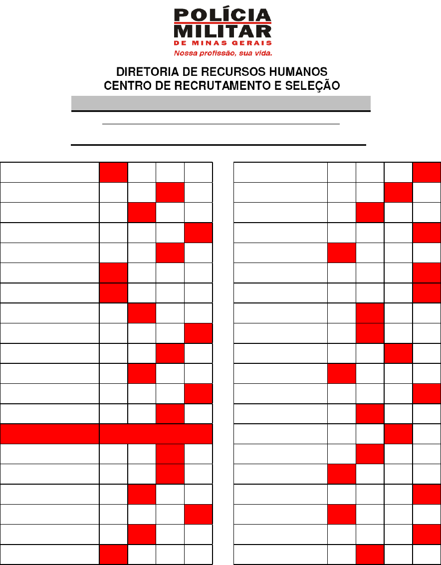 CFSd QPPM/2017- Interior / PROVA TIPO “B” (Edital nº 18/2016, de 30 de dezembro de 2016). GABARITO OFICIAL DEFINITIVO 1ª QUESTÃO A B C D 21ª QUESTÃO A B C D 2ª QUESTÃO A B C D 22ª QUESTÃO A B C D 3ª QUESTÃO A B C D 23ª QUESTÃO A B C D 4ª QUESTÃO A B C D 24ª QUESTÃO A B C D 5ª QUESTÃO A B C D 25ª QUESTÃO A B C D 6ª QUESTÃO A B C D 26ª QUESTÃO A B C D 7ª QUESTÃO A B C D 27ª QUESTÃO A B C D 8ª QUESTÃO A B C D 28ª QUESTÃO A B C D 9ª QUESTÃO A B C D 29ª QUESTÃO A B C D 10ª QUESTÃO A B C D 30ª QUESTÃO A B C D 11ª QUESTÃO A B C D 31ª QUESTÃO A B C D 12ª QUESTÃO A B C D 32ª QUESTÃO A B C D 13ª QUESTÃO A B C D 33ª QUESTÃO A B C D 14ª QUESTÃO ANULADA 34ª QUESTÃO A B C D 15ª QUESTÃO A B C D 35ª QUESTÃO A B C D 16ª QUESTÃO A B C D 36ª QUESTÃO A B C D 17ª QUESTÃO A B C D 37ª QUESTÃO A B C D 18ª QUESTÃO A B C D 38ª QUESTÃO A B C D 19ª QUESTÃO A B C D 39ª QUESTÃO A B C D 20ª QUESTÃO A B C D 40ª QUESTÃO A B C D Belo Horizonte, 26 de maio de 2017 (a) CARLA CRISTINA MARAFELLI, TEN CEL PM CHEFE DO CRS