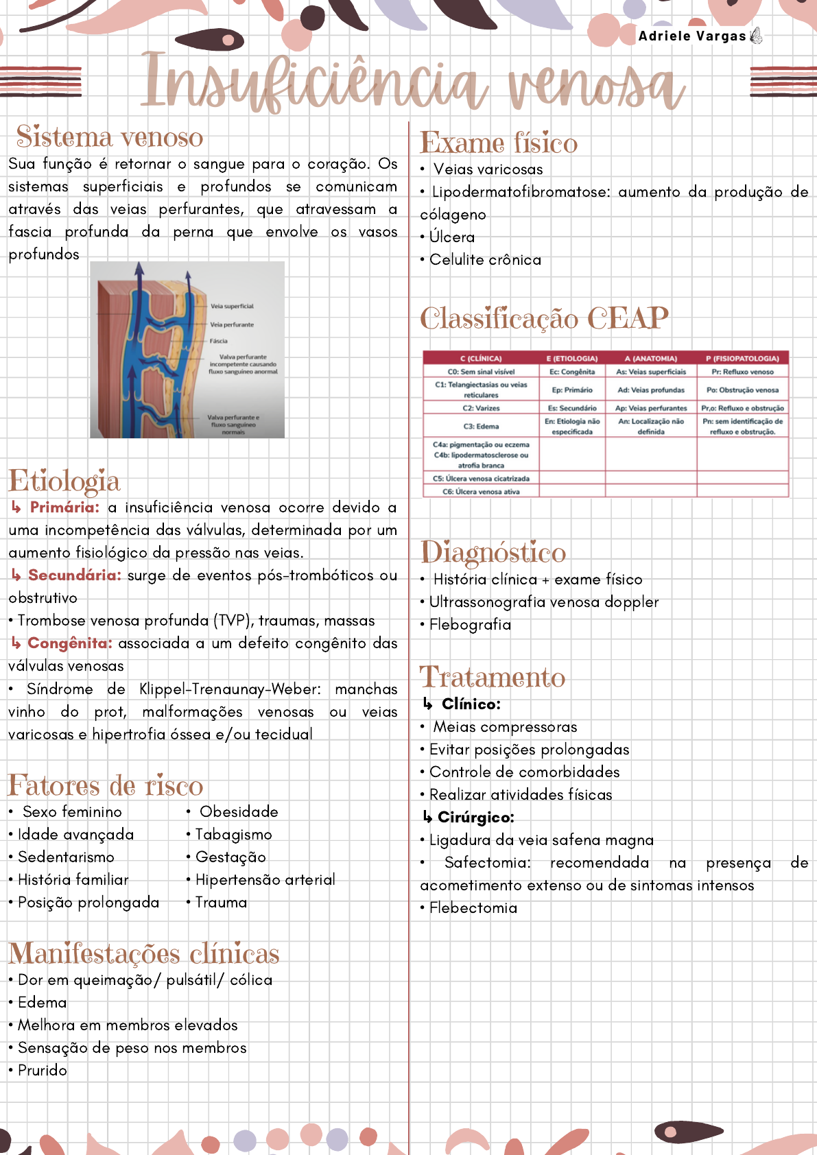 Insuficiência venosaInsuficiência venosa Sua função é retornar o sangue para o coração. Os sistemas superficiais e profundos se comunicam através das veias perfurantes, que atravessam a fascia profunda da perna que envolve os vasos profundos Sistema venoso Exame físico Adriele Vargas ↳ Primária: a insuficiência venosa ocorre devido a uma incompetência das válvulas, determinada por um aumento fisiológico da pressão nas veias. ↳ Secundária: surge de eventos pós-trombóticos ou obstrutivo • Trombose venosa profunda (TVP), traumas, massas ↳ Congênita: associada a um defeito congênito das válvulas venosas • Síndrome de Klippel-Trenaunay-Weber: manchas vinho do prot, malformações venosas ou veias varicosas e hipertrofia óssea e/ou tecidual Etiologia • Veias varicosas • Lipodermatofibromatose: aumento da produção de cólageno • Úlcera • Celulite crônica Diagnóstico Fatores de risco • Sexo feminino • Idade avançada • Sedentarismo • História familiar • Posição prolongada • Obesidade • Tabagismo • Gestação • Hipertensão arterial • Trauma Manifestações clínicas • Dor em queimação/ pulsátil/ cólica • Edema • Melhora em membros elevados • Sensação de peso nos membros • Prurido Classificação CEAP • História clínica + exame físico • Ultrassonografia venosa doppler • Flebografia Tratamento ↳ Clínico: • Meias compressoras • Evitar posições prolongadas • Controle de comorbidades • Realizar atividades físicas ↳ Cirúrgico: • Ligadura da veia safena magna • Safectomia: recomendada na presença de acometimento extenso ou de sintomas intensos • Flebectomia