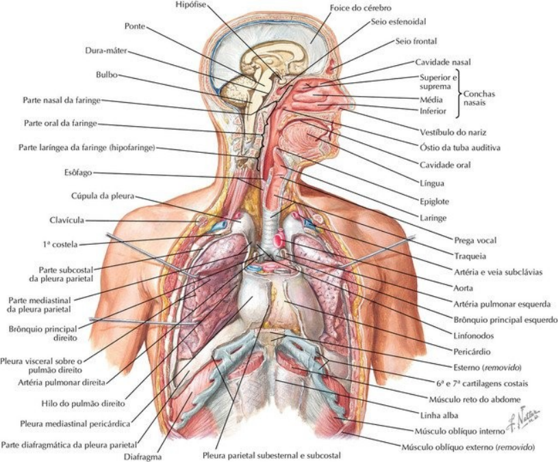 Anatomia e embriologia Sistema respiratório O sistema respiratório é composto pelas estruturas envolvidas na troca de oxigênio e dióxido de carbono entre o sangue e a atmosfera – a chamada respiração externa. A troca de gases entre o sangue dos capilares da circulação sistêmica e os tecidos nos quais esses capilares estão localizados é chamada de respiração interna. O sistema respiratório compreende as seguintes estruturas: nariz externo, nariz interno e seios paranasais; faringe, passagem comum para o ar e alimentos; laringe, onde a voz é produzida, traqueia, brônquios e pulmões. As estruturas acessórias necessárias ao funcionamento do sistema respiratório são as pleuras, o diafragma, a parede torácica e os músculos que levantam e abaixam as costelas na inspiração e expiração. Os músculos da parede anterolateral do abdome também auxiliam na expiração forçada (a contração desses músculos pressiona o conteúdo da cavidade abdominal para cima, contra o diafragma, elevando-o) e são utilizados na respiração “abdominal”. Alguns músculos do pescoço conseguem levantar as costelas, aumentando, dessa forma, o diâmetro anteroposterior do tórax. Em certas circunstâncias, os músculos que fixam os braços na parede torácica também podem ajudar a alterar o volume do tórax. As Figuras 1-1 a 1-16 mostram a anatomia do sistema respiratório e das principais estruturas acessórias. É importante visualizar essas estruturas isoladamente e se familiarizar com seu suprimento sanguíneo e nervoso e também com as relações que estabelecem com as estruturas adjacentes e com a superfície do corpo. Deve-se ter em mente que essas relações estão sujeitas ao mesmo grau de variação individual que afeta todas as estruturas anatômicas. As ilustrações apresentam as situações encontradas com mais frequência, e aqui não se tem a intenção de descrever todas as variações que ocorrem. Neste momento, uma ideia importante e clinicamente valiosa que merece ênfase é a prática de se subdividir cada pulmão em lobos e segmentos com base na ramificação da árvore bronquial. Do ponto de vista de seu desenvolvimento embriológico, bem como de sua função como um órgão da respiração totalmente desenvolvido, o pulmão é a ramificação final do brônquio principal que leva até ele. O conhecimento dessa subdivisão do pulmão é fundamental para anatomistas, fisiologistas, patologistas, radiologistas, cirurgiões e pneumologistas, porque, sem essa separação tridimensional, não há outra maneira de localizar, com precisão, as lesões que surgem no sistema respiratório. Arcabouço ósseo do tórax FIGURA 1-2 O arcabouço ósseo do tórax, ou tórax ósseo, compreende 12 pares de costelas e suas cartilagens, 12 vértebras torácicas e seus discos intervertebrais, além do esterno. As ilustrações também incluem uma clavícula e uma escápula, porque esses ossos servem de pontos de fixação importantes para alguns dos músculos envolvidos na respiração. O esterno é composto de três partes – manúbrio, corpo e processo xifoide. O manúbrio e o corpo estão em planos ligeiramente diferentes que formam no ponto de junção o ângulo esternal – um ponto de referência importante no qual a cartilagem costal da segunda costela se articula com o esterno. A borda superior do manúbrio é ligeiramente côncava, formando o que se chama de incisura jugular (supraesternal). Em geral, as cartilagens costais da primeira à sétima costela articulam-se com o esterno, e essas costelas são denominadas costelas verdadeiras. As cartilagens costais da oitava à décima costelas (costelas falsas) geralmente se fixam na cartilagem da costela de cima, e as extremidades ventrais das cartilagens da décima primeira e décima segunda costelas (costelas flutuantes) não se fixam no esqueleto. Todas as costelas articulam-se dorsalmente com a coluna vertebral de tal modo que as extremidades ventrais (juntamente com o esterno) podem ser levantadas um pouco, como ocorre na inspiração. As articulações das cartilagens costais com o esterno, à exceção da articulação da primeira costela, são articulações sinoviais ou verdadeiras que permitem mais liberdade de movimento que outros tipos de articulação. A face anterior da escápula (a fossa subescapular) encaixa-se na superfície posterolateral do tórax, sobre a segunda até a sétima costela, onde permanece principalmente pela ação dos músculos que se fixam nela. O acrômio da escápula articula-se com a extremidade lateral da clavícula, que age como um suporte que mantém o ângulo lateral da escápula afastado do tórax. Na face posterior da escápula, há uma espinha protuberante que se estende lateralmente até o acrômio. A extremidade medial da espinha, então, se achata, formando uma superfície triangular lisa com a base do triângulo voltada para as vértebras. Essa espinha separa a fossa supraespinal da fossa infraespinal. A escápula tem três margens: superior, lateral e medial ou vertebral. Na margem superior, há uma incisura e, lateralmente a ela, está o processo coracoide que se projeta anteriormente. O ângulo lateral da escápula apresenta uma leve concavidade – a fossa glenoidal – que se articula com a cabeça do úmero. Na extremidade superior da fossa glenoidal, está o tubérculo supraglenoidal e, na extremidade inferior, está o tubérculo infraglenoidal. A clavícula articula-se medialmente com a face superolateral do manúbrio (do esterno) e lateralmente com a borda medial do acrômio (da escápula). Os dois terços mediais da clavícula curvam-se ligeiramente para a frente, e o terço lateral curva-se posteriormente. Inserções musculares presentes nas porções medial e lateral da clavícula deixam a porção média desse osso menos protegida e, portanto, mais sujeita a fraturas. A correspondência entre os pontos de referência ósseos da face ventral do tórax e as vérteb