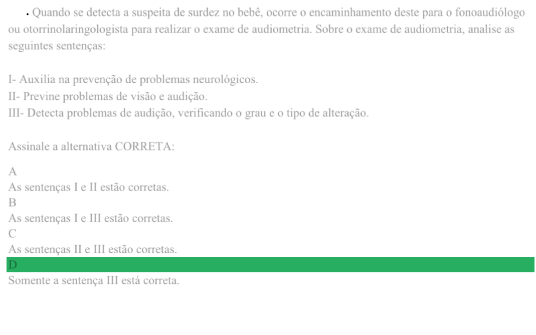 104. Quando se detecta a suspeita de surdez no bebê, ocorre o encaminhamento deste para o fonoaudiólogo ou otorrinolaringologista para realizar o exame de audiometria. Sobre o exame de audiometria, analise as seguintes sentenças: I- Auxilia na prevenção de problemas neurológicos. II- Previne problemas de visão e audição. III- Detecta problemas de audição, verificando o grau e o tipo de alteração. Assinale a alternativa CORRETA: A As sentenças I e II estão corretas. B As sentenças I e III estão corretas. C As sentenças II e III estão corretas. D Somente a sentença III está correta.