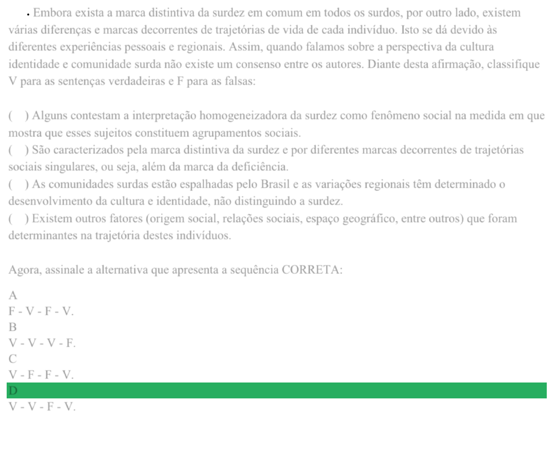 106. Embora exista a marca distintiva da surdez em comum em todos os surdos, por outro lado, existem várias diferenças e marcas decorrentes de trajetórias de vida de cada indivíduo. Isto se dá devido às diferentes experiências pessoais e regionais. Assim, quando falamos sobre a perspectiva da cultura identidade e comunidade surda não existe um consenso entre os autores. Diante desta afirmação, classifique V para as sentenças verdadeiras e F para as falsas: ( ) Alguns contestam a interpretação homogeneizadora da surdez como fenômeno social na medida em que mostra que esses sujeitos constituem agrupamentos sociais. ( ) São caracterizados pela marca distintiva da surdez e por diferentes marcas decorrentes de trajetórias sociais singulares, ou seja, além da marca da deficiência. ( ) As comunidades surdas estão espalhadas pelo Brasil e as variações regionais têm determinado o desenvolvimento da cultura e identidade, não distinguindo a surdez. ( ) Existem outros fatores (origem social, relações sociais, espaço geográfico, entre outros) que foram determinantes na trajetória destes indivíduos. Agora, assinale a alternativa que apresenta a sequência CORRETA: A F - V - F - V. B V - V - V - F. C V - F - F - V. D V - V - F - V.