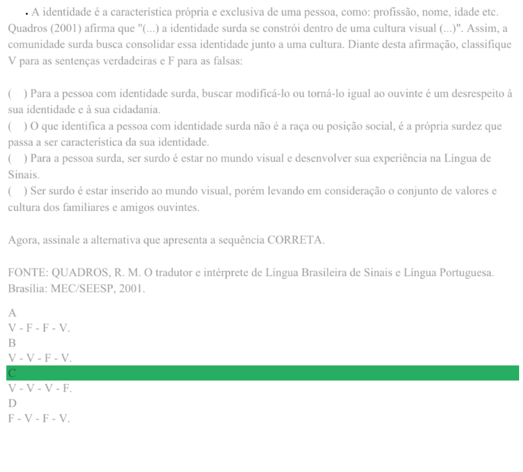 109. A identidade é a característica própria e exclusiva de uma pessoa, como: profissão, nome, idade etc. Quadros (2001) afirma que "(...) a identidade surda se constrói dentro de uma cultura visual (...)". Assim, a comunidade surda busca consolidar essa identidade junto a uma cultura. Diante desta afirmação, classifique V para as sentenças verdadeiras e F para as falsas: ( ) Para a pessoa com identidade surda, buscar modificá-lo ou torná-lo igual ao ouvinte é um desrespeito à sua identidade e à sua cidadania. ( ) O que identifica a pessoa com identidade surda não é a raça ou posição social, é a própria surdez que passa a ser característica da sua identidade. ( ) Para a pessoa surda, ser surdo é estar no mundo visual e desenvolver sua experiência na Língua de Sinais. ( ) Ser surdo é estar inserido ao mundo visual, porém levando em consideração o conjunto de valores e cultura dos familiares e amigos ouvintes. Agora, assinale a alternativa que apresenta a sequência CORRETA. FONTE: QUADROS, R. M. O tradutor e intérprete de Língua Brasileira de Sinais e Língua Portuguesa. Brasília: MEC/SEESP, 2001. A V - F - F - V. B V - V - F - V. C V - V - V - F. D F - V - F - V.