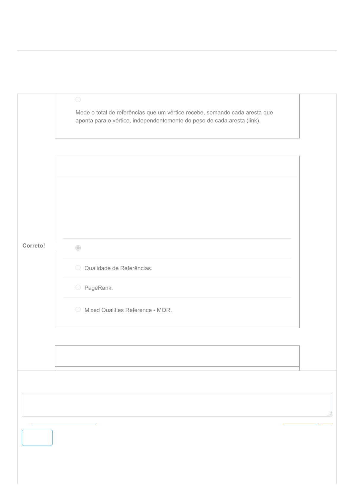 30/11/2021 22:54 PROVA ONLINE: Carolina Costa Souza Alves https://pucminas.instructure.com/courses/1762/assignments/91988/submissions/46471 1/2 Comentário de Mídia Anexar Arquivo Detalhes do envio Nota: 48 / 60 PROVA ONLINE Carolina Costa Souza Alves enviada 30 nov em 22:48 Mede o total de referências que um vértice recebe, somando cada aresta que aponta para o vértice, independentemente do peso de cada aresta (link). 6 / 6 ptsPergunta 5 Medida de importância dada a um vértice P que considera a qualidade dos vértices que apontam para P assim como a qualidade dos vértices em que P aponta. HITS - Hubs e Autoridades. Correto!Correto! Qualidade de Referências. PageRank. Mixed Qualities Reference - MQR. 0 / 6 ptsPergunta 6 Adicionar um Comentário: Salvar 30/11/2021 22:54 PROVA ONLINE: Carolina Costa Souza Alves https://pucminas.instructure.com/courses/1762/assignments/91988/submissions/46471 2/2