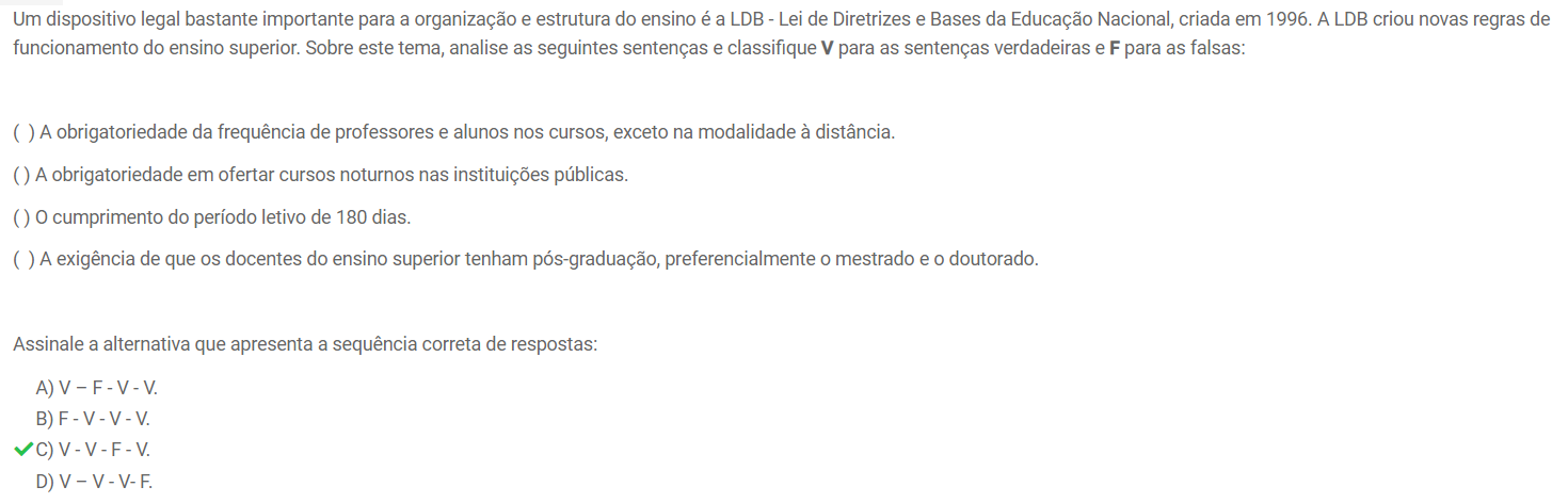 Um dispositivo legal bastante importante para a organização e estrutura do ensino é a LDB - Lei de Diretrizes e Bases da Educação Nacional, criada em 1996. A LDB criou novas regras de funcionamento do ensino superior. Sobre este tema, analise as seguintes sentenças e classifique V para as sentenças verdadeiras e F para as falsas: ( ) A obrigatoriedade da frequência de professores e alunos nos cursos, exceto na modalidade à distância. ( ) A obrigatoriedade em ofertar cursos noturnos nas instituições públicas. ( ) o cumprimento do período letivo de 180 dias. ( ) A exigência de que os docentes do ensino superior tenham pós-graduação, preferencialmente o mestrado e o doutorado. Assinale a alternativa que apresenta a sequência correta de respostas: A) V - F V V. B) F V V V. C) V V F V. D) V - V V-F.