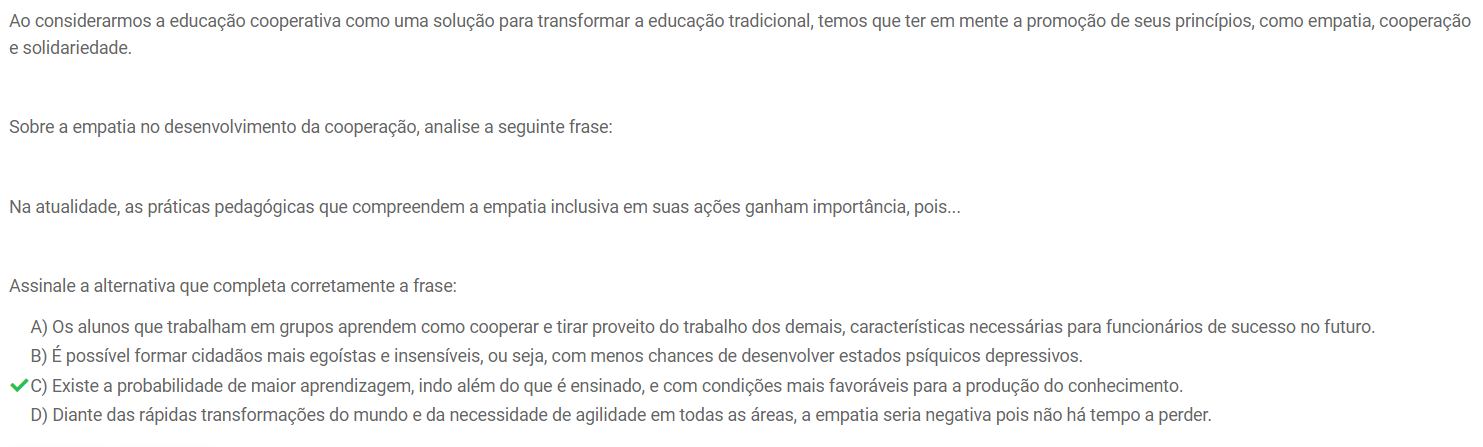 Ao considerarmos a educação cooperativa como uma solução para transformar a educação tradicional, temos que ter em mente a promoção de seus princípios, como empatia, cooperação e solidariedade. Sobre a empatia no desenvolvimento da cooperação, analise a seguinte frase: Na atualidade, as práticas pedagógicas que compreendem a empatia inclusiva em suas ações ganham importância, pois Assinale a alternativa que completa corretamente a frase: A) Os alunos que trabalham em grupos aprendem como cooperar e tirar proveito do trabalho dos demais, características necessárias para funcionários de sucesso no futuro. B) É possível formar cidadãos mais e insensíveis, ou seja, com menos chances de desenvolver estados psíquicos depressivos. C) Existe a probabilidade de maior aprendizagem, indo além do que é ensinado, e com condições mais favoráveis para a produção do conhecimento. D) Diante das rápidas transformações do mundo e da necessidade de agilidade em todas as áreas, a empatia seria negativa pois não há tempo a perder.