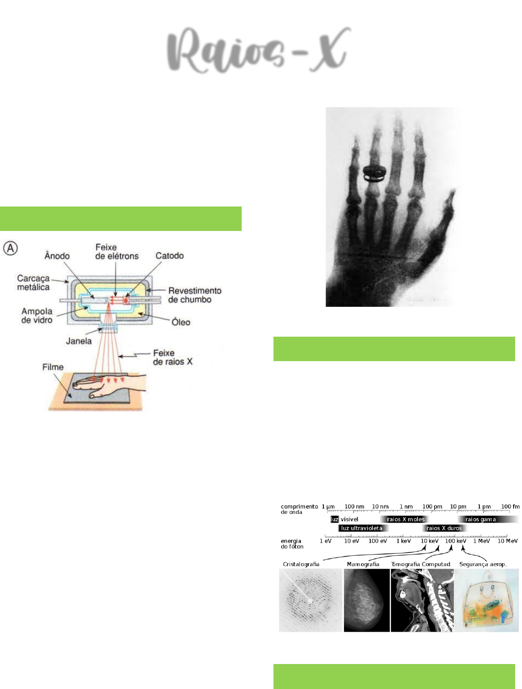 Raios-X Biofísica I Júlia Maria Veras É um tipo de onda eletromagnética que pode atravessar a matéria e interagir com seus átomos. Como são gerados? Figura 1. Mecanismo de geração dos Raios-X 1. No cátodo é aplicada uma alta energia, fazendo-o ficar incandescente. Com esse calor, elétrons são liberados (emissão termiônica); 2. O feixe de elétrons avança para o ânodo devido ao ddp; 3. 99% da energia é liberada em forma de calor e 1% em forma de Raio-X; São obtidos basicamente por dois mecanismos: a) Raio-X orbital: quando o elétron realiza um salto quântico para um orbital de menor energia, sendo a diferença energética emitida como radiação; b) Raio-X de frenagem: elétrons são acelerados acima de uma certa velocidade, chocando-se contra um obstáculo e desacelerando. A energia cinética é liberada como Raio-X; Figura 2. Primeira radiografia da história Propriedades: Podem ser: ✓ Duros: muito energéticos, capazes de penetrar profundamente, atravessando ossos; ✓ Médios; ✓ Moles: pouco energéticos, com baixa capacidade de penetração, atravessando apenas tecidos moles; Figura 3. Comprimento dos tipos de raios-x Aplicações na medicina: Ao serem usados para exames de imagem, a densidade define a opacidade. Quando mais denso o objeto de estudo, mais radiação é absorvida e mais claro será. Figura 4. Escala de radiodensidade Pode-se, também, fazer uso de radiopacos (que podem ser injetados ou ingeridos) para dar contraste em objetos de estudo radiotransparentes (p. ex. vasos sanguíneos); Figura 5. Angiografia, exame de imagem com contraste para analisar os vasos sanguíneos Outros exames de imagem que usam os raios-X são: ✓ Mamografia; ✓ Radiografia; ✓ Fluoroscopia; ✓ Tomografia computadorizada; Podem ser usados na radioterapia, a fim de produzir um dano no DNA de células tumorais. O paciente é deitado na maca e tratado com vários campos de irradiação. Figura 6. Exemplo de radioterapia. REFERÊNCIAS: Aplicações médicas dos Raios-X (unicamp.br) HENEINE, Ibrahim Felippe. Biofísica Básica. São Paulo: Atheneu, 2000. Como funciona o Raio X - YouTube https://portal.ifi.unicamp.br/images/files/extensao/oficinas-fisica/xxvii/Oficina_Raios-X_agosto2011_Mario.pdf https://www.youtube.com/watch?v=FTEX91M-RV4