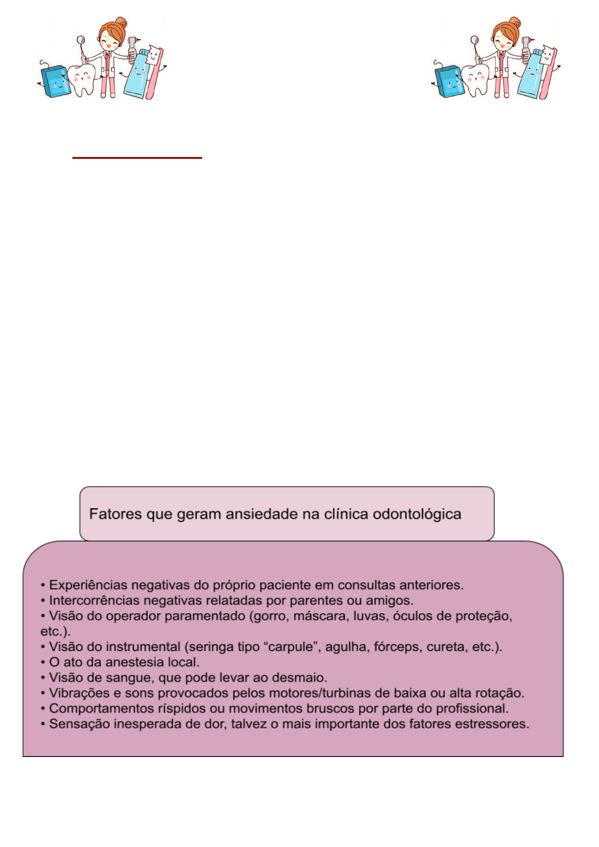 Resum� Odont� Terapêutica medicamentosa- Sedação mínima Sedação mínima É comum o profissional dentista se deparar com o paciente extremamente ansioso, apreensivo, alguns deles tomados de verdadeiro pânico ou pavor ao sentarem na cadeira do dentista. O quadro de ansiedade pode ser identificado pela inquietude do paciente e pela avaliação ou reconhecimento de alguns sinais físicos, como dilatação das pupilas, palidez da pele, transpiração excessiva, aumento da frequência respiratória, palpitação cardíaca, sensação de formigamento ou tremores das extremidades, entre outros. ➧QUANDO CONSIDERAR UM PROTOCOLO DE SEDAÇÃO MÍNIMA Antes de apresentar métodos farmacológicos em pacientes, quais o cirurgião-dentista deve considerar um protocolo de sedação mínima, descritas no quadro abaixo. Resum� Odont� Terapêutica medicamentosa- Sedação mínima ➧A American Dental Association (ADA) estabeleceu novas definições para os diferentes graus de sedação em odontologia, classificada como: ⇛A sedação moderada envolve a combinação de vários agentes sedativos e o uso de sedativos por via parenteral. ⇛A sedação profunda é obtida com altas doses de sedativos por via oral, inalatória ou parenteral. ⇛A ADA define a sedação mínima, ocorre uma discreta depressão do nível de consciência, produzida por método farmacológico, que não afeta a habilidade do paciente de respirar de forma automática e independente e de responder de maneira apropriada à estimulação física e ao comando verbal. ⤥ Embora as funções cognitivas e de coordenação motora se encontrem discretamente afetadas, as funções respiratórias e cardiovasculares permanecem inalteradas. ⇛Na clínica odontológica,bos benzodiazepínicos (BDZ) são os ansiolíticos mais empregados para se obter a sedação mínima por via oral, pela eficácia, boa margem de segurança clínica e facilidade po- sológica. ⇛Mecanismo de ação: os benzodiazepínicos agem nas estruturas do sistema nervoso central (SNC), principalmente no sistema límbico. ⤥Benzodiazepínicos facilitam a ação do ácido gama-aminobutírico (GABA), o neurotransmissor inibitório primário do SNC. pode-se dizer que o GABA age como se fosse um “ansiolítico natural ou fisiológico”, controlando as reações somáticas e psíquicas aos estímulos geradores de ansiedade, como acontece na clínica odontológica. Isso explica a segurança clínica do uso dos benzodiazepínicos, pois sua ação ansiolítica se dá pela potencialização dos efeitos inibitórios de um Resum� Odont� Terapêutica medicamentosa- Sedação mínima neurotransmissor (GABA), produzido pelo próprio organismo. Vantagens do benzodiazepínicos: - controlar a ansiedade, - a redução do fluxo salivar, - reflexo do vômito - relaxamento da musculatura esquelética. ⤥Além disso, quando empregados como pré-medicação em pacientes hipertensos, ajudam a manter a pressão arterial em níveis seguros. ⤥Também são úteis para prevenir intercorrências em pacientes com história de asma brônquica ou distúrbios convulsivos. Efeitos colaterais: Os benzodiazepínicos apresentam baixa incidência de efeitos colaterais, particularmente quando empregados em dose única ou por tempo restrito. A sonolência é o mais comum desses efeitos, principalmente com o uso do midazolam e do triazolam, por conta de sua ação hipnótica (indução do sono fisiológico). ⤥Mesmo quando se empregam pequenas doses de benzodiazepínicos, uma pequena % pode ter efeitos paradoxais (efeitos ao contrário). Esse efeito é mais comum em crianças e idosos,lembrando que a agitação pode favorecer as quedas nos idosos. ⤥Pelo fato de dificilmente produzir esses efeitos, o lorazepam é considerado como o agente ideal para a sedação consciente desse grupo de pacientes. ⤥O midazolam, particularmente, pode provocar alucinações ou fantasias de caráter sexual. Recomenda-se, portanto, que o profissional tenha acompanhia de uma terceira pessoa no ambiente do consultório. Resum� Odont� Terapêutica medicamentosa- Sedação mínima ⤥A ação dos benzodiazepínicos é praticamente limitada ao SNC, embora mínimos efeitos cardiovasculares sejam observados, como a discreta diminuição da pressão arterial e do esforço cardíaco. ⤥No sistema respiratório, podem causar leve redução do volume de ar corrente e da frequência respiratória. Critérios de escolha, dosagem e posologia ⇛Não existem protocolos definitivos para a escolha de um benzodiazepínico para sedação mínima por via oral em odontologia. Assim, alguns critérios devem ser Resum� Odont� Terapêutica medicamentosa- Sedação mínima considerados, como a idade e o estado físico do paciente, o tipo e a duração do procedimento. ⇛Como a duração dos procedimentos odontológicos, em média, não ultrapassa 60 min, o midazolam é o fármaco de escolha para jovens e adultos, pelo rápido início de ação (30 min) e menor duração do efeito ansiolítico (1-2 h). Por apresentar menor incidência de efeitos paradoxais ou amnésia anterógrada, o alprazolam se constitui numa boa alternativa ao midazolam. ⤥ amnésia anterógrada:ex,paciente não irá se recordar da maioria dos procedimentos, alguns traumáticos, que poderiam servir de experiência negativa. - Essa amnésia para alguns profissionais pode ser benéfica ou não. ⇛Apenas dois benzodiazepínicos são atualmente recomendados para uso em crianças: o diazepam e o midazolam, sendo que ambos apresentam vantagens sobre outros agentes sedativos como a prometazina, a hidroxizina e o hidrato de cloral. ⤥ Midazolam parece ser o fármaco de escolha para procedimentos de curta duração em crianças. ⤥ Pacientes geriátricos: triazolam (rápido início de ação e duração curta). Porém não é encontrado no Brasil. - lorazepam (cuja meia-vida plasmática é intermediária entre o triazolam e o diazepam. Tempo de início do efe