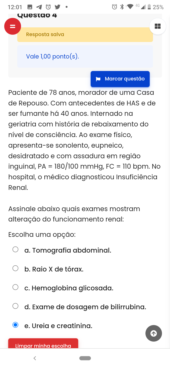 Paciente de 78 anos, morador de uma Casa de Repouso. Com antecedentes de HAS e de ser fumante há 40 anos. Internado na geriatria com história de rebaixamento do nível de consciência. Ao exame físico, apresenta-se sonolento, eupneico, desidratado e com assadura em região inguinal, PA = 180/100 mmHg, FC = 110 bpm. No hospital, médico diagnosticou Insuficiência Renal. Assinale abaixo quais exames mostram alteração do funcionamento renal: a. Tomografia abdominal. b. Raio X de tórax. c. Hemoglobina glicosada. d. Exame de dosagem de bilirrubina. e. Ureia e creatinina.