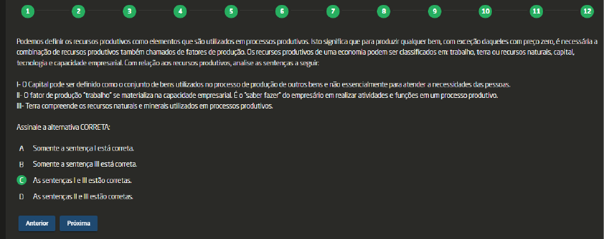 Podemos definir os recursos produtivos como elementos que são utilizados em processos produtivos. Isto significa que para produzir qualquer bem, com exceção daqueles com preço zero, é necessária a combinação de recursos produtivos também chamados de fatores de produção. Os recursos produtivos de uma economia podem ser classificados em: trabalho, terra ou recursos naturais, capital, tecnologia e capacidade empresarial. Com relação aos recursos produtivos, analise as sentenças a seguir: I- O Capital pode ser definido como o conjunto de bens utilizados no processo de produção de outros bens e não essencialmente para atender a necessidades das pessoas. II- O fator de produção "trabalho" se materializa na capacidade empresarial. É o "saber fazer" do empresário em realizar atividades e funções em um processo produtivo. III- Terra compreende os recursos naturais e minerais utilizados em processos produtivos. Assinale a alternativa CORRETA: As sentenças I e III estão corretas.
