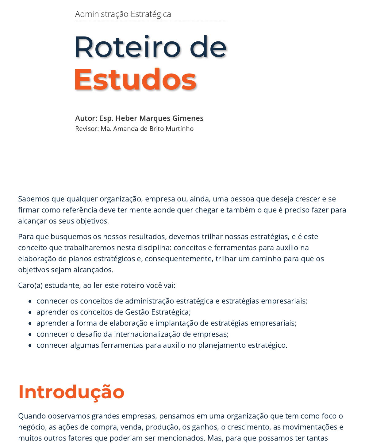 Sabemos que qualquer organização, empresa ou, ainda, uma pessoa que deseja crescer e se �rmar como referência deve ter mente aonde quer chegar e também o que é preciso fazer para alcançar os seus objetivos. Para que busquemos os nossos resultados, devemos trilhar nossas estratégias, e é este conceito que trabalharemos nesta disciplina: conceitos e ferramentas para auxílio na elaboração de planos estratégicos e, consequentemente, trilhar um caminho para que os objetivos sejam alcançados. Caro(a) estudante, ao ler este roteiro você vai: conhecer os conceitos de administração estratégica e estratégias empresariais; aprender os conceitos de Gestão Estratégica; aprender a forma de elaboração e implantação de estratégias empresariais; conhecer o desa�o da internacionalização de empresas; conhecer algumas ferramentas para auxílio no planejamento estratégico. Introdução Quando observamos grandes empresas, pensamos em uma organização que tem como foco o negócio, as ações de compra, venda, produção, os ganhos, o crescimento, as movimentações e muitos outros fatores que poderiam ser mencionados. Mas, para que possamos ter tantas Administração Estratégica Roteiro deRoteiro de EstudosEstudos Autor: Esp. Heber Marques Gimenes Revisor: Ma. Amanda de Brito Murtinho interações, devemos parar um pouco e pensar: como alcançar esse movimento? Como gerar um crescimento sustentável? Em qual local manter as instalações? Que produto/serviço adotar? Qual valor entregar aos clientes? O que as empresas que deram certo têm em comum? O fato é que podemos a�rmar: essas empresas têm um caminho marcado por planejamento, com resultados esperados e alvos a serem atingidos. Se tais alvos não forem alcançados, poderão retornar e refazer suas metas, voltando a trilhar a caminhada rumo ao seu objetivo. Tudo isso pode ser chamado de estratégia. Conceitos de Administração Estratégica e Estratégias Empresariais A administração estratégica pode ser de�nida como uma organização das ideias e dos caminhos que uma empresa deve percorrer para que os resultados sejam alcançados. Podemos associar o início do uso desse termo às atividades bélicas, do grego strategia, que signi�ca a ação de coordenar ou liderar os movimentos a �m de obter vantagem. Assim, Sobral e Peci (2013, p. 207) a�rmam que administração estratégica é um “processo formal de determinação de objetivos e metas básicas de longo prazo de uma empresa e adoção de cursos de ação e alocação de recursos necessários para alcançar esses objetivos”. Além disso, esse conceito pode ser estabelecido como um conjunto de ações que devem ser executadas de forma contínua, almejando os resultados determinados. Já para Certo (2010, p. 4), “A administração estratégica é de�nida como o processo contínuo e circular que visa manter a organização como um conjunto adequadamente integrado ao seu ambiente”. A aplicação é mais complexa do que a de�nição. Isso acontece porque dependemos dos envolvidos nos processos, a começar pelo nível estratégico (em que são de�nidas as estratégias), passando pelo nível tático (departamentos das empresas ou áreas negociais) e, por �m, o nível operacional (nível mais baixo da hierarquia), no qual as tarefas serão executadas. Maximiano (2011) apresenta alguns passos para que possamos entender melhor o funcionamento do planejamento estratégico: a) análise da situação estratégica da empresa; b) análise do ambiente; c) análise interna; d) elaboração do plano estratégico da organização. Pensando de forma mais prática, podemos conceituá-los a partir das seguintes ações: Análise estratégica da empresa: Veri�car a aplicação da estratégia em utilização, os objetivos e processos. Análise do ambiente: Analisar o ambiente em que a empresa está envolvida, o tipo de mercado, os clientes e concorrentes. Análise interna: Veri�car a identidade da empresa, como estão ocorrendo os seus processos internos e como está o ambiente organizacional. Elaboração do plano: Elaborar o novo planejamento, de�nir os objetivos e o que fazer para alcançar o alvo determinado. É o passo mais importante! Com base nesses conceitos, podemos de�nir a estrutura do planejamento estratégico, determinando os passos que serão seguidos e sempre visando aos resultados. Quais são as ameaças que nos cercam? Como podemos identi�car as oportunidades que irão surgir? Quais são os nossos pontos fortes e fracos? Quais são os nossos objetivos? Conceitos de Gestão Estratégica O segundo passo que uma organização deve dar é a gestão estratégica. O primeiro é a elaboração de um planejamento estratégico, e a gestão estratégica entra para executar o gerenciamento das ações de�nidas anteriormente pelo planejamento. Mas o que a gestão realizará? Barney e Hesterly (2011, p. 4) evidenciam: Embora seja difícil saber com certeza se uma empresa está seguindo a melhor estratégia, é possível reduzir a probabilidade de erros. A melhor maneira de fazer isso é escolher a estratégia da empresa de forma cuidadosa e sistemática, além de acompanhar o processo de administração estratégica. O processo de administração estratégica é um conjunto sequencial de análises e escolhas que podem aumentar a probabilidade de uma empresa escolher uma boa estratégia, isto é, uma estratégia que gere vantagens competitivas. LIVRO Administração estratégica e vantagem competitiva: conceitos e casos Autores: Jay B. Barney e William S. Hesterly Editora: Pearson Ano: 2011 Comentário: O livro apresenta temas contemporâneos e essenciais sobre a questão da administração estratégica e a vantagem competitiva, apontando conceitos e questões práticas que contribuem para que pro�ssionais e pesquisadores da área possam alcançar melhores resultados. É uma obra fundamental também para estudantes que precisam se aprofundar nas q