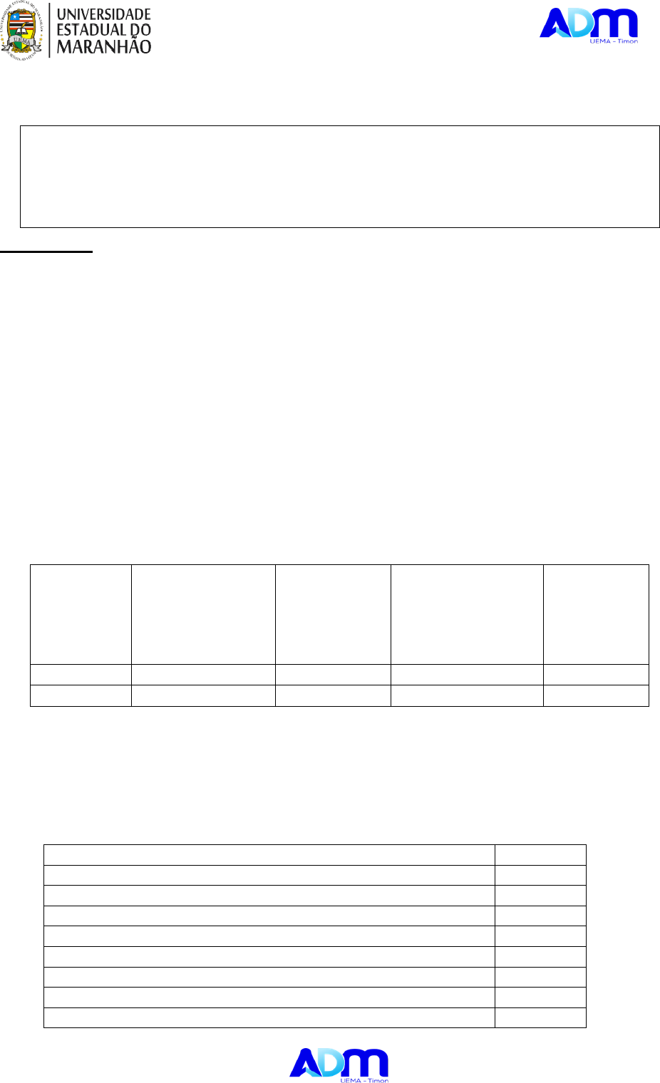 CAMPUS TIMON Departamento de Administração Curso de Administração Bacharelado AATTIIVVIIDDAADDEE 0088 I – IDENTIFICAÇÃO 1. CURSO: Administração - Bacharelado 2. DISCIPLINA: Contabilidade Gerencial e de Custos 3. PROFESSOR(A): M.ª Joselita Silva Chantal 4. CARGA HORÁRIA: 60hs QUESTÕES: EXERCÍCIO DE FIXAÇÃO II – CRITÉRIO DE RATEIO 1. A empresa Tico e Teco apresentou os seguintes gastos no período de janeiro de 20XX: Supervisão da fábrica R$ 23.000,00 Mão-de-obra do produto X R$ 220.000,00 Honorários da diretoria R$ 8.000,00 Mão-de-obra do produto Y R$ 95.000,00 Material indireto R$ 12.000,00 Matéria-prima do produto X R$ 160.000,00 Energia elétrica da administração R$ 4.000,00 Matéria-prima do produto Y R$ 190.000,00 Manutenção de máquinas R$ 5.600,00 Energia elétrica da fábrica R$ 8.900,00 Outros dados conhecidos: PRODUTO Nº DE REQUISIÇÕES DE MATERIAL CONSUMO DE ENERGIA ELÉTRICA Nº DE FUNCIONÁRIOS Nº HORAS MÁQUINA Produto X 350 4.500 kwh 22 5.500 Produto Z 250 4.100 kwh 19 4.500 Determine o custo unitário de cada produto, rateando os custos indiretos, utilizando a base de rateio que mais se identifique com o mesmo. Sabe-se que foram produzidas 15.000 unidades do produto X e 10.000 unidades do produto Y. 2. A empresa Docinho da Vovó fabrica dois produtos, Doce de coco e doce de abóbora. Em determinado período, apresentou os seguintes gastos: GASTOS R$ Aluguel da fábrica 1.080,00 Matéria prima do produto – Doce de Coco 550,00 Aluguel das máquinas da produção 920,00 Mão de obra direta – Doce de Abóbora 1.600,00 Salário dos funcionários do departamento financeiro 900,00 Matéria prima – Doce de Abóbora 620,00 Depreciação de máquinas de corte de produção 1.100,00 Mão de obra direta – Doce de Coco 850,00 Depreciação dos veículos utilizados nas entregas dos produtos 360,00 A produção foi de 500 unidades de doce de coco e de 300 unidades de doce de abóbora. Qual o valor do custo unitário de cada produto, sabendo-se que os custos indiretos são distribuídos aos produtos com base no volume de produção?