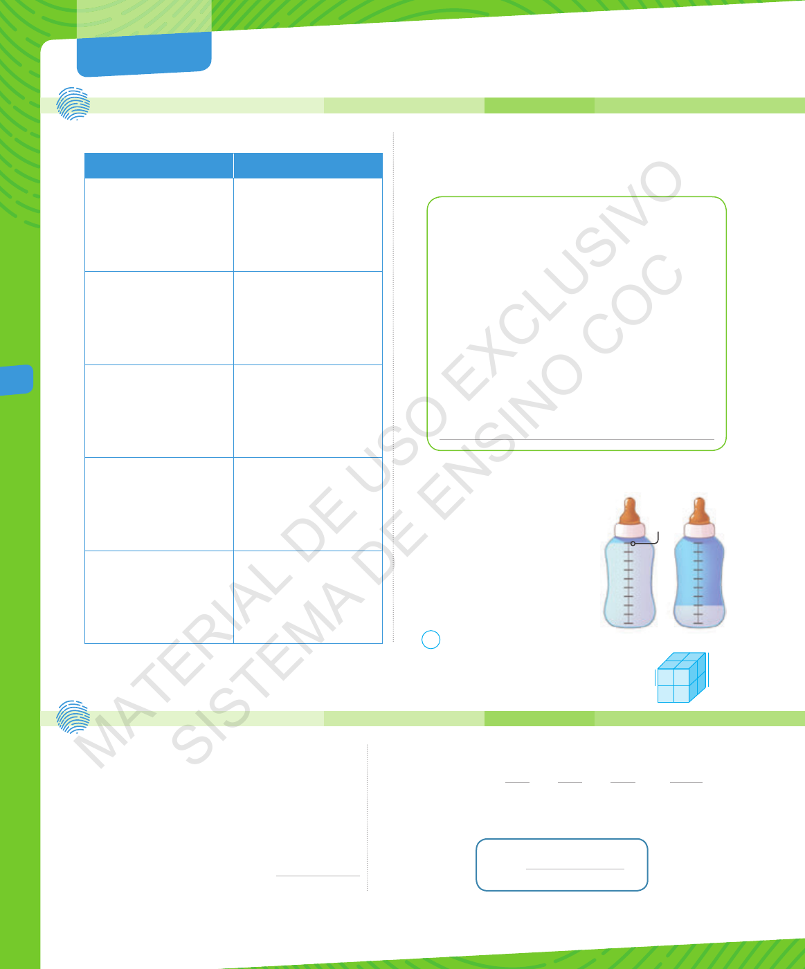 CA P ÍT U LO 2 4 68 CAPÍTULO 24 6. Se duplicarmos todas as arestas de um cubo que tem 1 m de aresta, conseguiremos um novo cubo, maior que o pri- meiro. Qual será o volume, em m³, do novo cubo? 7. OBMEP Na figura, vemos a mamadei- ra de Zezé antes e depois de ele mamar. Quantos mililitros ele mamou? a. 125 b. 130 c. 145 d. 160 e. 175 Módulo 171 | Litro – Múltiplos e submúltiplos 1. Na cena de abertura deste módulo, Rafael ouve com atenção a explicação do engenheiro sobre a constru- ção da piscina. Ele disse que a piscina terá 12 m³ de volume, e capacidade para 12 000 litros. Dessa relação, é possível concluir que a medida de 1 m³ corresponde a 1 000 litros. Verifique e confirme essa relação com- pletando o esquema seguinte. A medida de 1 metro corresponde a decímetros. 1 m³ = L 5. Complete as equivalências entre m³ e dm³ na tabela a seguir. m³ dm³ 1 400 27 000 20 3,5 Exercícios propostos Então: 1 m³ = 1 m · 1 m · 1 m = dm · dm · dm = dm³ Mas, 1 dm³ = 1 L. Logo: Exercícios de aplicação 75 250 mL mL O exercício 1 procura explorar mais detalhadamente a relação entre litro e metro cú- bico mostrada na cena de abertura do módulo. Desenvolver o exercício juntamente com os alunos, assegurando-se de que eles completaram corretamente as lacunas. 10 10 10 10 1 000 1 000 Se duplicarmos as arestas que medem 1 m cada uma, o novo cubo terá uma aresta de 2 m. Logo, seu volume será de 8 m³. V = 2 x 2 x 2 = 2³ = 8 7. A primeira mamadeira (na ilustração) marca 250 mL, enquanto a segunda marca 75 mL. Para saber quanto Zezé mamou, basta fazer a subtração 250 – 75 = 175. Assim, Zezé mamou 175 mililitros. O volume será de 8 m³. Sobre a ideia indicada no exercício 6, é importante representar a situação por meio de desenho ou de material concreto, como o material dourado. Assim, os alunos podem perceber de forma mais signifi cativa a seguinte situação: 5. Dar atenção especial ao decímetro cúbico (dm³), pois ele será utilizado na comparação com unidades de capacidade (litro). 1 000 0, 4 27 0,02 3 500 2m 1m 055a098_CO EF 06 INFI 121 3B LV 09 MI DMUL MAT_G12_p4.indd 68 18/07/19 11:03 MA TE RI AL D E US O EX CL US IV O SI ST EM A DE E NS IN O CO C 69 M AT EM ÁT IC A 2. Em uma fábrica de suco, um lote de 1 800 litros de suco de laranja será todo engarrafado em embalagens contendo 600 mililitros cada uma. Qual é o total de embalagens que receberão suco? a. 300 b. 3 000 c. 30 000 d. 300 000 e. 3 000 000 3. Na organização de uma festa, Rafaela fez uma estimativa de que cada pessoa consumiria 400 mL de suco. No super- mercado onde foi comprar o suco, havia apenas garrafas contendo 2 L. Considerando que um total de 60 pessoas devem estar presentes na festa e que cada garrafa de suco custa 8,90 reais, calcule a. a quantidade de garrafas que deverá comprar; 4. Complete as equivalências entre unidades de medida de capacidade. a. 2 kL = L b. 3 500 mL = L c. 0,578 L = mL d. 43 daL = L e. 1,24 L = mL f. 3 mL = L b. o gasto que terá com a compra do suco. Considerando que 1 L = 1 000 mL, temos: 1 800 L = 1 800 000 mL 1 800 000 ÷ 600 = 3 000 Portanto, 3 000 garrafas receberão suco. 60 · 400 mL = 24 000 mL = 24 L 24 ÷ 2 = 12 12 · 8,90 = 106,80 Ela deverá comprar 12 garrafas. Deverá gastar 106,80 reais. 2 000 3,5 578 430 1 240 0,003 055a098_CO EF 06 INFI 121 3B LV 09 MI DMUL MAT_G12_p4.indd 69 18/07/19 11:03 MA TE RI AL D E US O EX CL US IV O SI ST EM A DE E NS IN O CO C CA P ÍT U LO 2 4 70 5. Carmem precisa fazer uma receita em que se utilizam 3,5 litros de creme de leite. Ela conseguiu encontrar, no mercado, apenas embalagens com 250 mililitros cada uma. Quantas embalagens Carmem deverá comprar? 6. Complete a equivalência das diferentes unidades de volu- me e capacidade. a. 5 cm³ = mL b. 4,7 m³ = L c. 2 dm³ = L d. 2 000 cm³ = mL e. 0,375 m³ = L f. 0,5 m³ = L 8. Uma cozinheira preparou 5 garrafas de café, cada qual com 1,5 L. Esse café será servido para funcionários de um escri- tório em xícaras com capacidade total de 50 mL cada uma. Se todas as xícaras foram preenchidas completamente, quantas xícaras de café serão servidas no total? a. 15 b. 150 c. 300 d. 1 500 e. 3 000 CAPÍTULO 24 Exercícios propostos 7. Depois de gastar 23 m³ de água em um mês, Paulo estabe- leceu com sua família que, para o próximo mês, o consumo não deveria ultrapassar 80% do valor atual. Por isso, des- perdício de água ao escovar os dentes ou barbear-se deve ser evitado. Quantos litros, no mínimo, a família de Paulo deverá economizar no próximo mês? Sobre o exercício 7, é muito importan- te discutir o texto em classe. Mostrar aos alunos que economizar água é uma atitude nobre, pois, além de re- duzir o gasto fi nanceiro, contribui para manter as reservas de água potável em nosso planeta, sendo este um bem vital para a sobrevivência humana. 5 4 700 2 2 000 375 500 23 m³ = 23 000 L 80% de 23 000 = 0,8 · 23 000 = 18 400 23 000 – 18 400 = 4 600 3,5 L = 3 500 mL 3 500 : 250 = 14 8. Total de café = 5 · 1,5 L = 7,5 L = 7 500 mL 7 500 ÷ 50 =150 Portanto, serão servidas 150 xícaras no total. Ela deverá comprar 14 embalagens com 250 mililitros cada uma. A família de Paulo deverá economizar 4 600 litros de água no próximo mês. 055a098_CO EF 06 INFI 121 3B LV 09 MI DMUL MAT_G12_p4.indd 70 18/07/19 11:03 MA TE RI AL D E US O EX CL US IV O SI ST EM A DE E NS IN O CO C