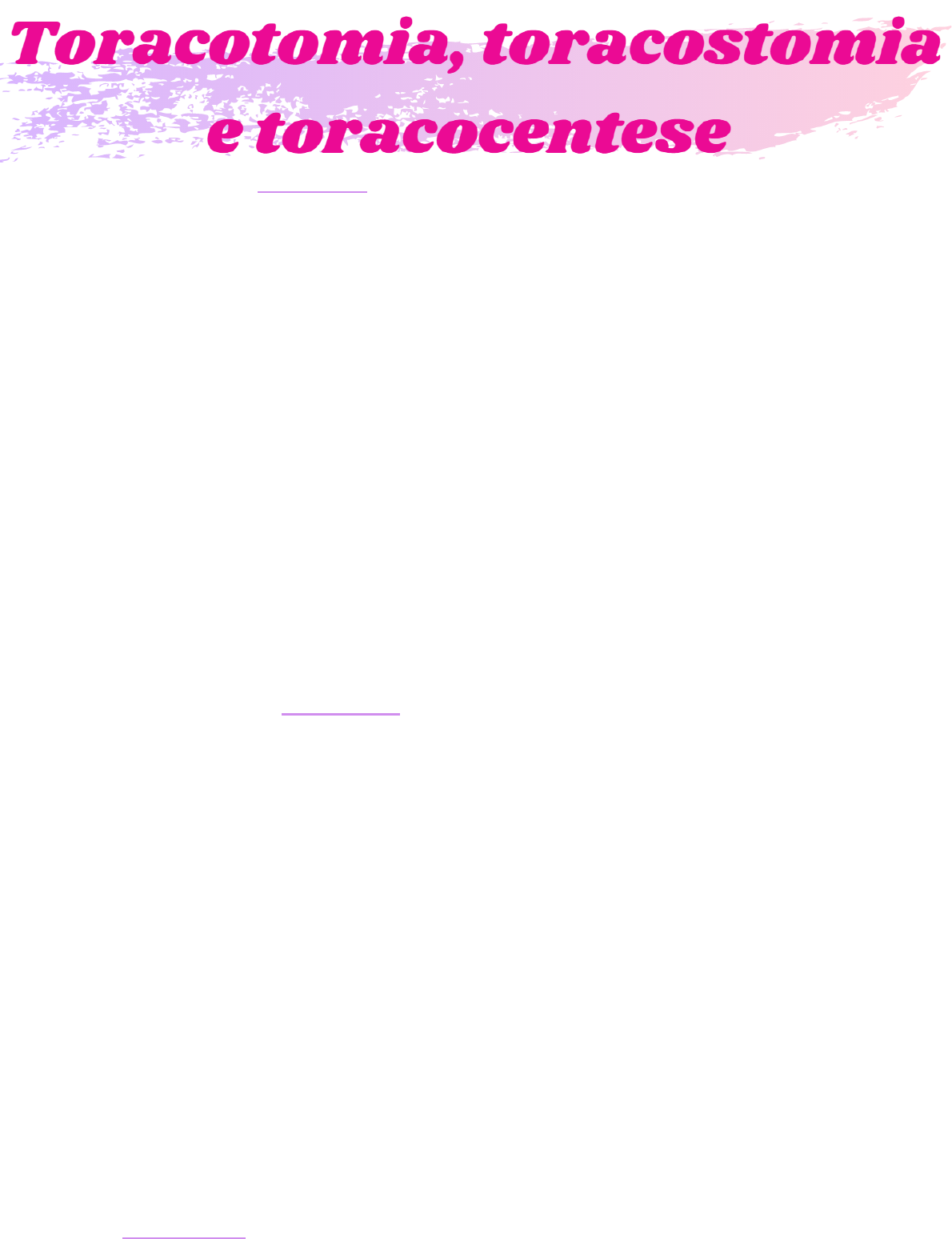 Toracotomia: cirurgia no pulmão, incisão no tórax • Efetuada para avaliar e tratar problemas pulmonares quando os procedimentos não invasivos não são diagnósticos ou tem pouca probabilidade de serem definitivos • Principais indicações: Lobectomia e Pneumectomia (comumente feitas para tratar câncer de pulmão) • Contraindicações: anticoagulação ou distúrbio hemorrágico que não pode ser corrigido, isquemia cardíaca aguda, instabilidade ou insuficiência dos principais sistemas de órgãos • Há 3 abordagens possíveis o Toracotomia anterior ou lateral limitada: realiza-se incisão intercostal de 6 a 8 cm para abordar as estruturas anteriores o Toracotomia posterolateral: dá acesso à pleura, ao hilo, ao mediastino e a todo o pulmão o Incisão esternal separadora (esternotomia mediana): quando se deseja acessar ambos os pulmões, como na cirurgia de redução volumétrica dos pulmões o OBS: Pacientes submetidos à toracotomia limitada necessitam de dreno de tórax por 1 a 2 dias e, em muitos casos, podem deixar o hospital em 3 a 4 dias Toracostomia: orifício, usado para drenagem • Inserção de um dreno no espaço pleural para retirar ar ou líquido do tórax • Indicações: o Pneumotórax que é recorrente, persistente, traumático, grande, sob tensão ou bilateral o Pneumotórax em paciente sob ventilação com pressão positiva o Grande derrame pleural sintomático ou recorrente o Enfisema ou derrame parapneumônico complicado o Hemotórax o Quilotórax • Contraindicações o Absolutas: nenhuma o Relativas: coagulopatia ou distúrbio hemorrágico (pode requerer hemoprodutos ou fatores de coagulação) • O tubo deve ser colocado sobre a borda superior do arco costal para evitar danos ao feixe neurovascular que está na borda inferior de cada arco costal • O local de inserção pode variar com base no ar ou líquido a ser drenado. Para pneumotórax, normalmente insere-se o tubo no 4º espaço intercostal e, para outras indicações, no 5º espaço intercostal, na linha axilar média ou linha axilar anterior. Toracocentese – é uma punção com agulha: diagnóstico, de alívio, descompressiva • É aspiração por agulha de líquidos de um derrame pleural • Pode ser feita para diagnóstico e/ou tratamento • Indicações o Diagnóstica: quase todo paciente com derrame pleural recente ou etiologia incerta e ≥ 10 mm de espessura por tomografia computadorizada (TC), ultrassonografia ou radiografia em decúbito lateral o Terapêutica: aliviar sintomas em pacientes com dispneia causada por grande derrame pleural • Contraindicações o Absolutas: nenhuma o Relativas: Anticoagulação ou distúrbio hemorrágico; Localização incerta de líquido; volume de líquido mínimo; Alteração da anatomia da parede torácica; Celulite ou herpes-zóster no local da punção da toracocentese; Pneumopatia suficientemente grave para tornar as complicações capazes de colocar a vida em risco; Paciente com tosse descompensada ou não cooperante • Posicionamento o É melhor efetuada com o paciente sentado e levemente inclinado para frente, com os membros superiores apoiados. o A toracocentese na posição reclinada ou em supinação (p. ex., em um paciente em ventilação mecânica) é possível, mas é mais bem realizada usando ultrassonografia ou TC para orientar o procedimento. Bibliografia MSD, Manual. Toracocentese. Disponível em: https://www.msdmanuals.com/pt-br/profissional/dist%C3%BArbios-pulmonares/como-fazer-procedimentos-pulmonares/como- fazer-toracocentese?query=c.Toracocentese. Acesso em: 25 nov. 2021. MSD, Manual. Toracostomia. Disponível em: https://www.msdmanuals.com/pt-br/profissional/dist%C3%BArbios-pulmonares/como-fazer-procedimentos-pulmonares/como- fazer-toracostomia-cir%C3%BArgica-para-coloca%C3%A7%C3%A3o-de-dreno-de-t%C3%B3rax. Acesso em: 25 nov. 2021. SANAR. McBurney e outras incisões abdominais. Disponível em: https://www.sanarmed.com/mcburney-e-outras-incisoes-abdominais-sanar-me-socorre-colunistas. Acesso em: 25 nov. 2021. MSD, Manual. Toracotomia. Disponível em: https://www.msdmanuals.com/pt-br/profissional/dist%C3%BArbios-pulmonares/procedimentos-pulmonares-diagn%C3%B3sticos- e-terap%C3%AAuticos/toracotomia. Acesso em: 25 nov. 2021. PEREIRA JÚNIOR, Gerson Alves. ABORDAGEM GERAL TRAUMA ABDOMINAL. Disponível em: https://www.saudedireta.com.br/docsupload/13322852274_abordagem_geral_trauma_abdominal.pdf. Acesso em: 25 nov. 2021.