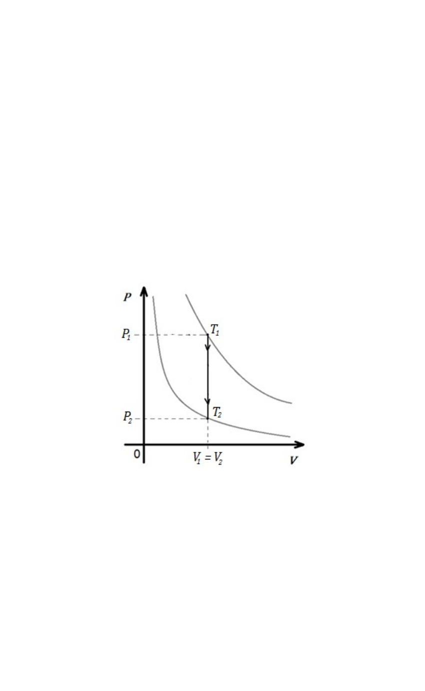 2. Processo isovolumétrico ou isocórico É um processo que ocorre a volume constante. Não existe troca de energia na forma de trabalho entre o sistema e o ambiente, W=0. As variáveis de estado, pressão e temperatura podem variar. Poderão acontecer trocas de energia na forma de calor, entre o sistema e o ambiente. Por exemplo, o sistema absorverá calor do ambiente, e mantendo o volume constante, acontecerá um aumento tanto da pressão quanto da temperatura causando a variação da energia interna do sistema. Analisando a equação da primeira lei da termodinâmica, sendo o trabalho igual a zero, temos: U2−U1=△U=Q A energia adicionada na forma de calor ficará dentro do sistema aumentando a energia interna do sistema. A figura a seguir mostra graficamente, no diagrama PV, o processo quando o volume do sistema permanece constante, entre os estados 1 e 2. Diagrama PV mostrando o processo 1 - 2 a volume constante. Para transformar o sistema do estado 1 para o estado 2, a pressão foi reduzida, e a temperatura passou da isoterma T1 para isoterma T2, ou seja, a temperatura diminuiu, porém, o volume continua o mesmo, constante, pois V1 é igual a V2. Processos que ocorrem com o volume constante são chamados de isocóricos, ou isovolumétricos. 3. Processo isobárico Um processo isobárico é um processo que ocorre a pressão constante. Num processo isobárico nenhuma das grandezas, energia interna, calor e trabalho será igual a zero, logo poderá acontecer troca de energia tanto em forma de calor como em forma de trabalho. As variáveis de estado volume e temperatura podem variar. O trabalho realizado será dado por: W=P(V2−V1) O diagrama PV da figura a seguir representa um processo isobárico entre os estados 1 - 2. Neste processo, o gás no estado 1 sofre expansão, aumento do volume, até o estado 2. A temperatura neste caso também aumenta, passando da isoterma T1 para a isoterma T2. Diagrama PV mostrando o processo 1 - 2 a pressão constante. 4. Processo isotérmico Um processo isotérmico é um processo que ocorre a temperatura constante. Neste caso, as variáveis de estado pressão e volume podem variar havendo troca de energia, tanto em forma de calor, como em forma de trabalho, porém não acontecerá a variação da energia interna. U2−U1=△U=0 Q=W Repare no gráfico a seguir que, ao variar do estado 1 para o estado 2, a pressão do gás diminuiu, mas o volume aumentou. Veja também que o processo ocorreu sobre a isoterma T1=T2, ou seja, a temperatura não variou, é um processo isotérmico. Diagrama PV mostrando o processo 1 - 2 a temperatura constante.