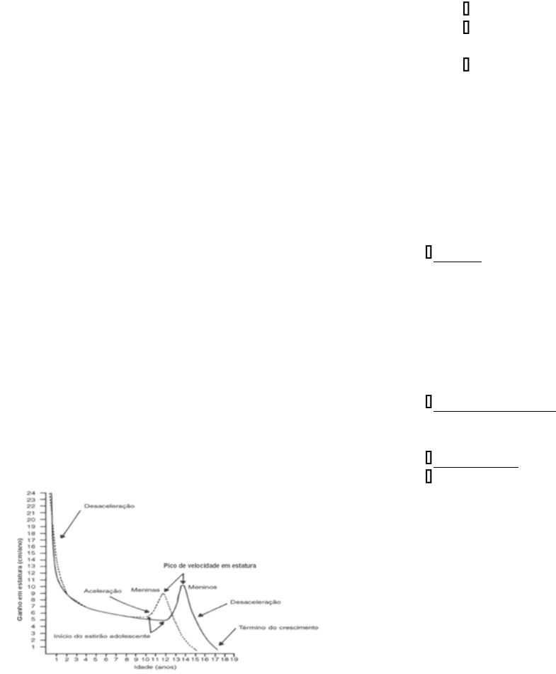 O crescimento somático humano é influenciado por fatores intrínsecos e extrínsecos. → A estatura final é resultado da combinação de múltiplos fatores, entre eles a interação entre hormônios circulantes e a respostabilidade do tecido, e fatores nutricionais, ambientais e condições de saúde. → Processo gradativo, que inicia no período embrionário intraútero e até a vida adulta. → Importante indicador de saúde: vai sinalizar como está a saúde física, mental e a qualidade do ambiente em que a criança vive. → Apesar de existir um genótipo que controla o crescimento em estatura, os fatores ambientais são muito importantes para determinar a altura final, isso é visto principalmente em países em desenvolvimento, onde a pobreza e seus efeitos são a principal causa de baixa estatura, acometendo até 30% das crias, desnutrição falta de acesso a agua (afeta o crescimento antes e depois do nascimento). → Crescimento e desenvolvimento Os hormônios estão intrinsecamente relacionados ao crescimento, principalmente o eixo somatotrófico, que é compreendido pelo hormônio do crescimento GH e também pelo fator de crescimento semelhante a insulina IGF, mas também tem participação de outros hormônios, tireoideanos, insulina, esteroides sexuais. • Período embrionário- caracterizado pela maior taxa de crescimento de toda a vida 1. Os primeiros anos após o nascimento – 1ano- 25cm, e depois essa taxa de crescimento vai gradativamente diminuindo. 2. Novo pico de crescimento por volta dos 7 anos, porém ainda menor. 3. Estiram puberal – puberdade, crescimento de 8 a 12 cm num ano, forte influência dos hormônios sexuais. 4. Ao longo da vida, temos 4 períodos críticos para o crescimento somático •O aumento da estatura não é o único fator do aumento somático, toda essa influência hormonal também vai variar a composição corporal, exemplo: o feto, grande quantidade de gordura, que vai diminuindo, e durante a puberdade a diferença de porcentagem de gordura começa a moldar entre homens e mulheres. Ambiente e genoma materno Estado materno na gravidez: nutrição, fumo e fluxo arterial uterino, doença, falta de oxigênio. Crescimento placentário: fluxo placentário, produção de hormônios . afeta relação mãe e feto Crescimento intrauterino, é influenciado por hormônios diferentes do que do resto da vida. • Conforme o feto vai se desenvolvendo, as suas glândulas vão produzindo hormônios, que também vão influenciar em seu crescimento. • Fatores que influenciam o crescimento intrauterino Crescimentos e hormônios intraútero - Hormônios que mais influenciam no crescimento INSULINA- percebesse numa hipersecreção de insulina pelo feto, no caso de mães diabéticas estão sempre hiperglicêmicas, e essa glicemia passa pela placenta e vai para o nenê, e, portanto, ele também fica hiperglicêmico, entretanto, o pâncreas dele consegue trabalhar, produzindo muita insulina, para manter o feto noroglicemico. Mas as mãe não, por isso, os bebes de mãe diabéticas mal controlada durante a gestação, nascem grandes para a idade gestacional. Hormônios tireoidianos (SNC e esqueleto, mas não crescimento em si) – não influencia tanto no peso final da gestação. Glicocorticoides (maturação dos órgãos fetais) O Gh não influencia tanto no crescimento, mas pode afetar outras alterações com sua falta: exemplo hipoglicemia neonatal, icterícia neonatal, e menino, micropenis. Pensar se tem uma doença hipofisaria já congênita. Hormônios do crescimento Página 1 de Fisiologia O crescimento é resultado, principalmente, pela proliferação e da subsequente diferenciação da cartilagem epifisária do crescimento. • Período crescimento pós-natal Imagem de raio x Esse processo de crescimento de cartilagem ele é regulado por diversos fatores hormonais o eixo GH-IGF, a insulina, hormônios tireoidianos, e esteroides sexuais. → O crescimento somático linear ocorre pelo processo denominado ossificação endocondral, no qual a estrutura cartilaginosa é substituída por tecido mineralizado de maior resistência. → A cartilagem de crescimento está situada nas epífises de ossos longos e ela é formada, principalmente, por colágenos do tipo 2, 9 e 10, tem uma zona de repouso, que também é chamada de germinativa contem condrocitos em repouso e essas células desempenham um papel crucial no orientação das colunas de condrocitos adjacentes, que vai mostrar qual é a direção do crescimento ósseo, há cima dessa zona, temos as células em repouso, que entram na zona proliferativa, rica em matriz e os condrocitos entram em divisão celular em direção longitudinal, para promover esse crescimento. → Ao tempo os condrocitos perdem a capacidade de se dividir e inicia uma diferenciação, tornando-se pre hipertróficos, e começão a secretar colágeno do tipo 1, mais resistente, essa zona é caraterizada pelo aumento da contração intracelular de cálcio, essencial para a produção de vesículas de matriz , as quais vão secretar fosfato de cálcio, hidroxoapatita, e metapoliteinase, resultando em mineralizacaqo das vesículas e da matriz adjacente. Esse processo de mineralização atrai vasos para a região, e ai acaba calcificando essa cartilagem e virando um osso adulto → O GH conhecido como somatotrofina ou hormônio somatotrofico, é uma cadeia polipepididica, constituída de 191 AA, e como funciona → Produzido pelas células somatotróficas→ Hipotálamo vai liberar GHRH que vai estimular os somatotroficos da hipófise a produzirem e liberarem o GH. → A secreção de GH é pulsátil e intermitente, e ocorre, principalmente, no sono profundo de ondas lentas. → O GH circula no plasma ligado a uma proteína GHPP, ligação fraca → GH- Somatotrofina A maior parte do GH, 70% dele, vai estimular a produção de IGF1, principalmente no fígado. → O IGF1 vai lá no hipotálamo e na hipófise fazer o feedback negativo, 