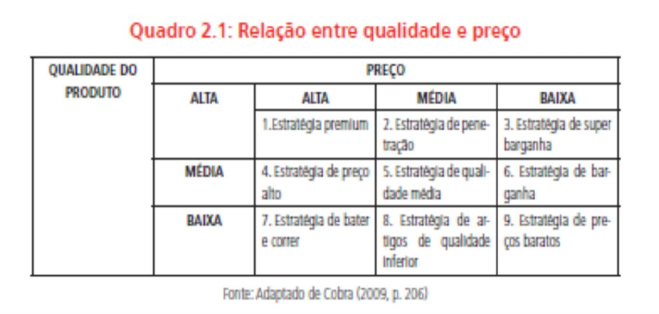 Preço ( aula 12-05 ) Estratégias preço-qualidade No momento de decisão do preço, deve-se levar em conta a qualidade do produto ofertado, segundo Cobra (2009), podendo-se empregar o quadro abaixo para ajudar na decisão de preço. “O preço é a quantidade de dinheiro, bens ou serviços que devem ser trocados para se adquirir a propriedade ou uso de um produto” (CHURCHILL e PETER, 2000, p.314). Veja agora, a definição de cada item que compõe o quadro: • Estratégia premium - A qualidade percebida do produto é alta e por isto o preço pode ser alto. A empresa pode empregar uma estratégia de preço premium, pois o consumidor dará uma porção a mais de dinheiro para comprar o produto. • Estratégia de penetração - A qualidade percebida do produto é alta e, por isto, sugere-se que o preço seja médio, um preço um pouco abaixo do normal. • Estratégia de valor super barganha - A qualidade do produto é percebida como alta, mas a preço baixo, o que significa uma rápida introdução do produto no mercado, com condições vantajosas ao distribuidor. • Estratégia de preço alto - O produto possui qualidade média e preço alto, o que pode significar uma tentativa de valorizar o produto e procurar uma rápida lucratividade. • Estratégia de qualidade média ou comum - É quando o preço praticado é médio de acordo com a qualidade do produto que objetiva uma parcela justa de mercado, nem mais nem menos. • Estratégia de barganha - É quando a empresa oferece produto de qualidade média a um preço baixo, o que pode significar barganha com distribuidores e consumidores. • Estratégia de bater e correr - É quando a empresa quer tirar uma vantagem inicial e sair rapidamente do mercado, pois um produto com preço alto e qualidade baixa é ação predatória. • Estratégia de artigos de qualidade inferior - O preço médio para produto de baixa qualidade só pode estar associado a uma política de tirar vantagem da imagem marca. • Estratégia de preços baixos - É quando os produtos são de baixa qualidade com uma estratégia de preço baixo para vender em alta quantidade. Cada empresa deve empregar a estratégia que entender ser mais importante para atrair aos seus clientes, lembrando que deve diversificar as estratégias para sempre surpreender. Também é preciso ter em mente qual o objetivo da empresa para que o profissional de marketing possa escolher a melhor das opções a ser empregada. Objetivos de preços do profissional de Marketing O profissional de marketing deve levar em conta os objetivos traçados pela empresa para optar pelas as decisões de preço a serem empregadas. Churchill e Peter (2000) nos sinalizam que, para isto, devemos analisar: • Segmentação e posicionamento - Deve apoiar os esforços de posicionamento do produto nos mercados-alvos, ou seja, deve analisar qual seu mercado-alvo para identificar qual preço este mercado pode e quer pagar. Uma forma de se descobrir isso é através da realização de uma pesquisa de mercado. • Vendas e lucros - Deve conseguir alcançar o nível desejado de vendas e o nível projetado de lucros e para isto deve decidir qual o volume de venda pretendido e quais os lucros esperados com os preços pretendidos. • Competitividade - A empresa deve estabelecer o seu preço para competir em termos de preço com relação à participação de mercado. • Sobrevivência - O preço estabelecido deve possibilitar a sobrevivência da organização para que cubram os seus custos e sobre lucro nas transações. • Responsabilidade social - Alcançar um padrão de responsabilidade social. A empresa pode desenvolver posições básicas de valor relacionadas com os níveis de preço, como mostra o quadro abaixo: A empresa deve ter em mente como é o produto oferecido ao mercado para melhorar a posição de valor que deve explorar ao se comunicar com esse mercado. Conforme os autores Kotler (1998) e Churchill e Peter (2000), os preços podem ser selecionados dependendo do objetivo de preço que a empresa deseja alcançar e, aí, então, estabelecem-se as estratégias: • Sobrevivência - É a estratégia de estabelecer o preço para cobrir os custos do produto. • Maximização do lucro - É a estratégia que estabelece o preço que dê mais lucro para a empresa. • Preço de penetração de mercado - É a estratégia de praticar preço baixo que visa atrair o mercado-alvo para um novo produto. • Desnatamento de mercado - É a estratégia de praticar um preço inicialmente alto para recuperar rapidamente os custos de desenvolvimento de um novo produto, mas que será baixado gradativamente depois. • Liderança de produto/qualidade - É a estratégia de praticar um preço baseado em quanto maior a qualidade maior o preço. Para a empresa ter sucesso, é necessário analisar o seu negócio e como ela pode ser mais competitiva no mercado em que atua. De acordo com Churchill e Peter (2000), a empresa também pode determinar o preço de seus produtos baseados em custos, podendo empregar alguns dos tipos apresentados abaixo: • Custos fixos - São praticados quando os custos permanecem iguais ao longo de uma ampla faixa de quantidade produzida. • Custos variáveis - São empregados quando os custos mudam de acordo com a quantidade produzida. • Markup - É empregado ao acrescentar uma porcentagem padrão ao custo do produto a fim de chegar a um preço de venda • Precificação pela taxa de retorno - É a prática de adicionar uma taxa de retorno desejada aos custos totais para definição do preço de venda. • Análise do ponto de equilíbrio - É a técnica que determina o volume de vendas necessário para cobrir todos os custos a um preço específico. • Ponto de equilíbrio - É o o nível de vendas em que as receitas totais são iguais aos custos totais. É importante que a empresa tenha o seu fluxo de caixa sempre em dia para poder aplicar essa teoria em seu negócio. Nas estratégias de preços