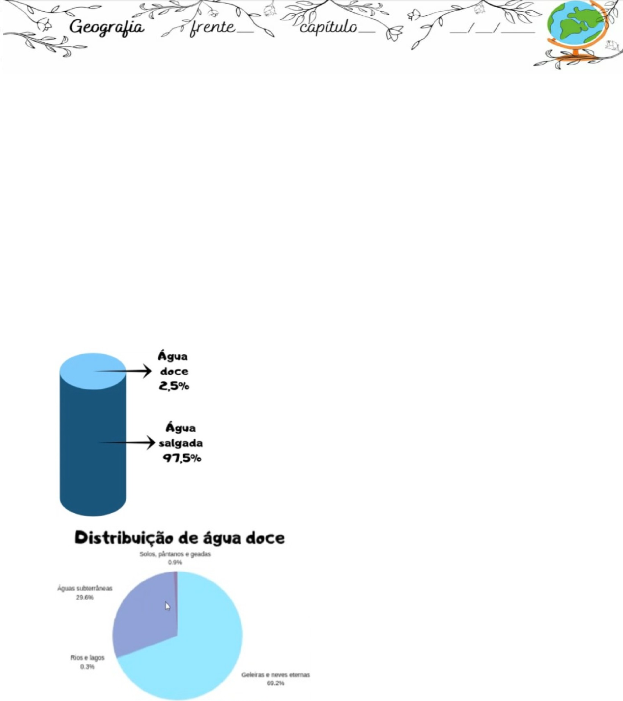 O planeta água Importância da água: · Além da beleza e dos atrativos turísticos, rios e mares são importantes fontes de hidratação e alimentação para os seres vivos de forma geral, incluindo o ser humano. Distribuição da água: · O planeta possui 71% da sua superfície coberta por água. A água no mundo: · Abastecimento da população- 12% · Indústria- 19% · Agricultura- 56%, no Brasil- 70% Uso da água: · O consumo de água vem aumentando nas ultimas décadas, devido ao crescimento populacional no mundo. Água e conflitos: · Com a crise hídrica que vem ocorrendo no mundo, vem se tornando cada vez mais constante os conflitos. · Só o Brasil possui 63 acordos e tratados internacionais sobre uso e gestão dos recursos hídricos transfronteiriços. Consumo per capta de água: · De acordo com a OMS, 110 litros de água é a média ideal para um indivíduo saciar a sede, cuidar da higiene e preparar os alimentos, porem o consumo é desigual. · Cada brasileiro consome em média 5,559 mil de água por dia · O consumo exagerado e desregulado pode gerar escassez. Sua disponibilidade é o que garante a sobrevivência de toda a vida na terra e o próprio futuro da humanidade. Pegada ecológica: · Refere-se a quantidade de terra e água que seria necessária para sustentar as gerações atuais, tendo em conta todos os recursos materiais e energéticos gastos por uma determinada população. Os rios: · É um fluxo de água continuo e corrente que pode ser cauduloso ou não. Tipos de rios: · Podem ser de planalto ou planícies. Os primeiros são formados devido aos desníveis do relevo entre a nascente e a foz, ou seja, apresentam grandes declives e são ótimos para a produção de energia elétrica. · Rios perenes- quando drenam a água o ano todo. · Rios intermitentes- temporários secando durante os períodos de estiagem. Esses são muito comuns em regiões áridas e semiáridas. · Rios meandrantes- percurso sinuoso, cheio de curvas de um rio. Curso dos rios: · Montante- direção a nascente. · Jusante- direção a foz. · Alto curso- rio próximo a nascente. · Médio curso- no centro sua inclinação diminui. · Baixo curso- trecho mais próximo da foz. · Bacia hidrográfica- área drenada por uma rede hidrográfica (rio principal e afluentes). Rios transfronteiriços: · São aqueles que estão entre o domínio territorial de mais de uma fronteira e região autônoma. Talvegue: · É o ponto que define a linha de fronteira entre países que possuem um rio no limite de seus territórios. · Corresponde a linha de menor altitude dentro de um vale ou curso de água e de maior profundidade. Tipo de regime: · Pluvial- o volume das águas do rio depende da água das chuvas. · Nival: o volume das águas do rio depende do derretimento das neves ou das geleiras. · Pluvionival ou mista: o volume das águas aumenta com a combinação da água das chuvas e dos degelos. Tipos de foz: · Estuário- um estuário é um ambiente aquático de transição entre um rio e o mar. · Delta- quando o rio desemboca no mar ou oceano através de redes, quando há uma ramificação e o surgimento de vários canais a partir do mesmo rio em direção a foz. · Mista- apresenta tanto a foz do tipo delta quanto a foz do tipo estuário, ou seja, apresenta ramificações bem como um canal único de desembocadura. Tipos de drenagem: · Exorreica- quando o Rio nasce no interior do continente e segue um sentido para fora do continente, desaguando no mar. · Endorreica- quando um rio não atinge o mar, desembocando em um lago, por exemplo. · Arreica- o rio não tem direção e desaparece em algum ponto por evaporação ou infiltração. · Criptorreica- ocorre quando os rios são subterrâneos e acaba por surgir em fontes ou permanecer em cavernas. Águas subterrâneas: · Parte do ciclo hidrológico que flui no subsolo e corresponde as águas encontradas em fendas e espaços do solo. · Aquíferos ou lençol freático. Aquíferos: · É uma formação geológica que contém água e permite que quantidades significativas dessa água se movimentem no seu interior em condições naturais. · Confinado- tem uma camada de rocha ou argila impenetrável acima dele · Não confinado- fica abaixo de uma camada permeável do solo. Hidrografia no Brasil: · A maioria dos rios são perenes, apresentam regime de alimentação pluvial, com predominância de drenagem exorreica e de planalto com grande potencial para geração de energia, porém a distribuição desses recursos hídricos é desigual. Conceitos de bacia hidrográfica: · Microbacia- rio ou ribeirão. · Mesobacia- formados por divisores naturais de elevação relativa do relevo. · Macrobacia- conjuntos de bacias que alimentam um rio maior, que normalmente desagua no oceano. Diferença entre mares e oceanos: · Mar- são as águas salgadas que banham os continentes. Essas águas recebem diretamente a influência terrestre, que modifica a composição das substâncias nelas dissolvidas, altera as suas propriedades e os seus movimentos. · Oceano- são as águas salgadas afastadas da costa e não influênciada diretamente pela terra (Atlântico, Índico, Ártico, Pacífico e Antártico). Tipos de mares: · Costeiros ou abertos- comunicam amplamente com os oceanos. · Fechados ou isolados- não apresentam comunicação natural com os oceanos, podendo ser considerados como lagos. Correntes oceânicas: Dessalinização: · Processos físico-químicos de retirtada do excesso de sal e outro minerais da água. Salinidade máxima- mar morto: · O mar morto tem esse nome devido a grande quantidade de sal por ele apresentada, dez vezes superior à dos demais oceanos, o que torna impossível qualquer forma de vida em suas águas. Congelamento: · Nas altas latitudes, em razão das baixas temperaturas, há o congelamento superficial das águas oceânicas, formando as banquisas, e a fragmentação das banquisas formam os floesbergs. Coloração: · Depende