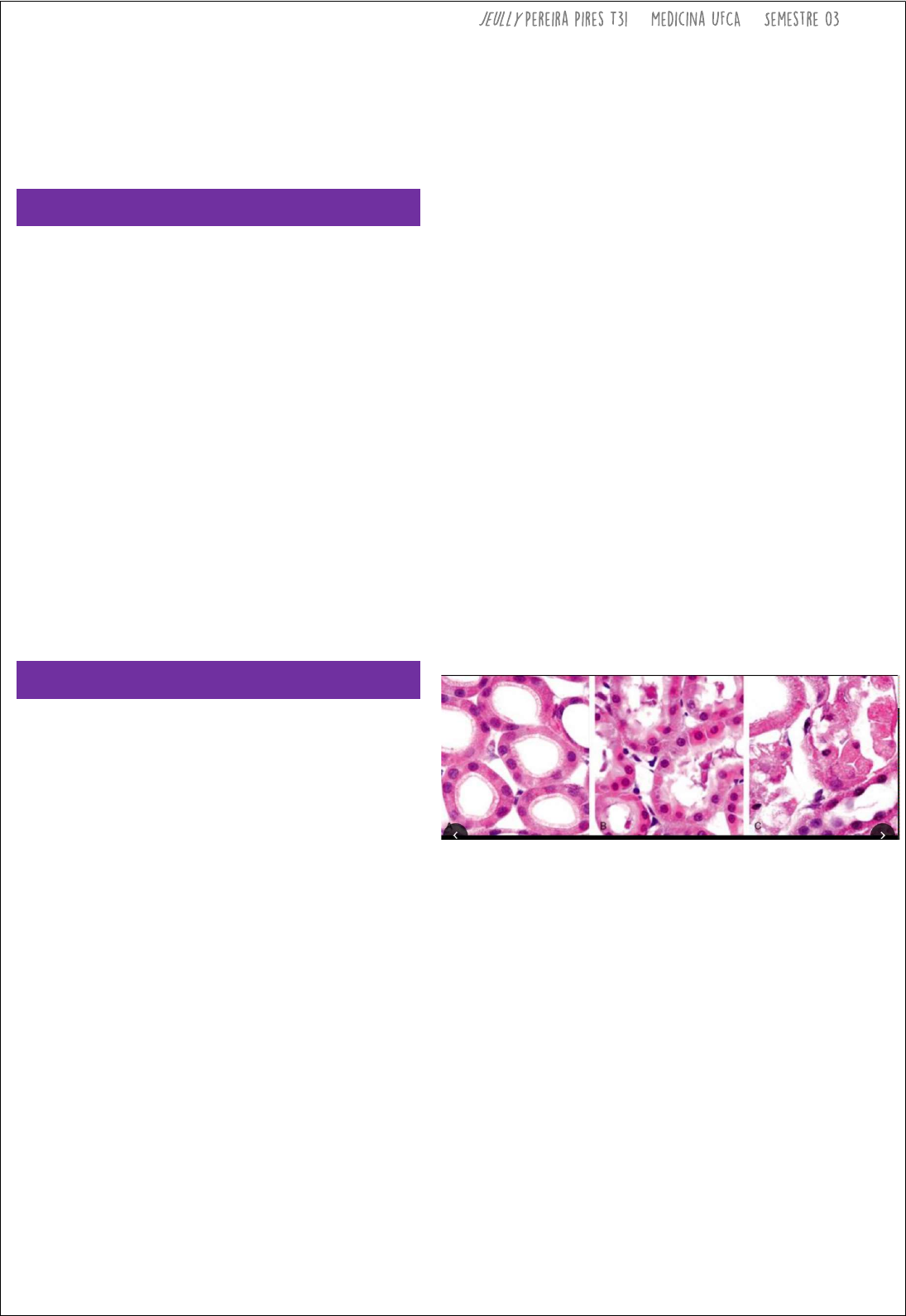 – – Morte celular Introdução - Termo utilizado par morte celular e morte teci- dual; - Tipos de morte: 1. Necrose 2. apoptose; - Oncose; - Autofagia: processo de adaptação, redução da quantidade de organelas. → atrofia - Autólise: processo de decomposição. As enzimas decompõe todos os componentes da célula; - Heterólise: enzimas de outras células promovem a decomposição celular; Necrose - Processo patológico causado pela ação degenera- tiva progressiva de enzimas(atua dentro e fora da célula); - Considerações: A. Membranas celulares(rupturas) B. ↓pH C. Tempo de evolução - Alterações morfológicas → vão apa- recendo ao longo do tempo; - Alterações bioquímicas( ↑permeabili- dade da membrana) Obs: após 6h o cadáver atinge um nível de acidez que neutraliza quase a totalidade dos microrga- nismo. Obs: toda célula morta acaba entrando em decom- posição. Contudo, a necrose ocorre quando há cir- culação sanguínea. A célula morre, mas o orga- nismo está vivo. No IAM uma parte do coração sofre necrose, a outra entrará em autólise mas não sofre necrose. A necrose desencadeia uma res- posta inflamatória. - Evolui em etapas: aparência normal → alterações morfológicas → Causas: 1. Físicas 2. Químicas 3. Fisico-químicas 4. Biológicas → Patogênese: 1. Depende da causa 2. Em geral: lesão do DNA, desnaturação proteica e dano mitocondrial. → Alterações morfológicas A: Céls. mortas, mas não sofreram necrose (fixa- das no estado natural); B: Presença de debris(restos celulares); citoplasma vacuolizados(aspecto de espuma/água com gás); sofreram injúria; muitas células vivas; citoplasma eosinofílico; representa injúria celular; C: representa morte celular - necrose; – – - Alterações nucleares: Condensação de cromatina no centro do núcleo – tamanho diminuído – Pyknosis Degradação da cromatina sem rompimento da ca- rioteca – núcleo c/ tamanho normal – perde a cor(desbotada) – Karyolysis Fragmentação do núcleo sem degeneração do nú- cleo por endonuclease – Karyorrhexis Obs: aparecem de maneira variadas no processo de injúria celular - Alterações citoplasmáticas: Hialinização → brilho/eosinofílico/vermelho Vacuolização Figuras mielínicas Estruturas amorfas → depósitos de cálcio, lipí- deos.... A: B: hialinização; vacuolização; mudança da arquite- rura do tecido; Mitocôndria sofre tumefação Deposição de cálcio – ocorre muita frequência lo- cais com muito lipídios; acumula de forma aleató- ria(E) Padrões morfológicos da necrose Necrose coagulativa Mantém o citoesqueleto Restos nucleares Exemplo da necrose do túbulo renal Ex: Isquemia - ↓atividade enzimática(du- radoura) Necrose liquefativa Destrói o arcabouço celular Ex: processos inflamatórios - ↑atividade enzimática(+rápida) → principalmente No SNC a isquemia causa necrose lique- fativa, pois o citoesqueleto é mais frágil. Tecido flácido e líquido Necrose gangrenosa Necrose que atinge a extremidade de um membro Gangrena Classificada de acordo com aspectos ma- croscópicos - Mão isquêmica → + escura; sem movi- mento; perde sensibilidade; pode não ter infecção – gangrena seca(trombose arte- rial) - Necrose isquêmica da mão – colônia de bactérias – gangrena úmida(diabetes me- litus) Obs: Costridium perfrigens – gangrena gasosa(produz gás) – – Necrose gordurosa/adiponecrose/este- atonecrose Ação de enzimas Superposição de cálcio Causada: trauma, pancreatite(enzimas podem extravasar na cavidade abdominal → lipase pode reagir com a gordura me- sentérica(mesocolon e mesentério) → ne- crose gordurosa) Necrose caseosa Latim: queijo=caseum Padrão de necrose encontrada na tubercu- lose pulmão parecido com o queijo cottage Necrose fibrinoide Componente da casquinha de ferida(as- pecto hialino-eosinofílico) Tecido sofreu uma desnaturação proteica e a proteína ficou histologicamente pare- cida com a fibrina Encontrada na parede vascular → vascu- lites(principalmente nas autoimunes) Necrose gomosa Treponema palidum– sífilis(01:03:29) – bouba, Pinta Subst. pegajosa – goma → Necrose coagulativa → Necrose liquefativa → Necrose caseosa – – Necrose gordurosa - parte branca → necrose gordurosa na parte do meentério → Necrose fibrinoide Trombose Coagulação anormal Considerações sobre a grangrena Definição: Necrose de um tecido ou órgão, em consequência de aporte sanguíneo insuficiente. Pode abrigar infecções e recebe nomes diferentes, dependendo de suas características (gangrena úmida, gangrena gasosa, etc.). A: gangrena seca – picada de cobra cascavel B: gangrena úmida – DM Necrose seca Necrose úmida – debridamento – – larvas medicinais INDICAÇÃO Seriado House - 1a temporada: Episódio 21 – “Três histórias” - 2a temporada: Episódio 12 – “Distrações” → Diferenças entre a necrose a apoptose Apoptose - Acomete céls. individuais; - as bolhas não se rompe; - Existem situações que ocorrem em doença e em outras é um processo fisiológico de doenças; → PERGUNTAS: 1. Você já se perguntou por que não se cresce infinitamente? 2. Por que nossa pele é sempre da mesma es- pessura? 3. Por que não temos entupimento dos vasos por linfoproliferação nas respostas imu- nes? 4. Por que nosso intestino não se obstrui por proliferação celular? 5. Por que envelhecemos e morremos? → DEFINIÇÃO: Via de morte celular induzida por enzimas que degradam o DNA e proteínas do núcleo e citoplasma. O termo “morte celular programada” foi elaborado para denotar a morte de células espe- cíficas durante o desenvolvimento de um orga- nismo. → Momentos da apoptose: I. Destruição durante a embriogênese, II. Involução dependente de hormônio III. Deleções em populações proliferativas(me- dula óssea), IV. Em células do sistema imune e T citotóxicas, V. Células que já cumpriram seu propósito, VI. a