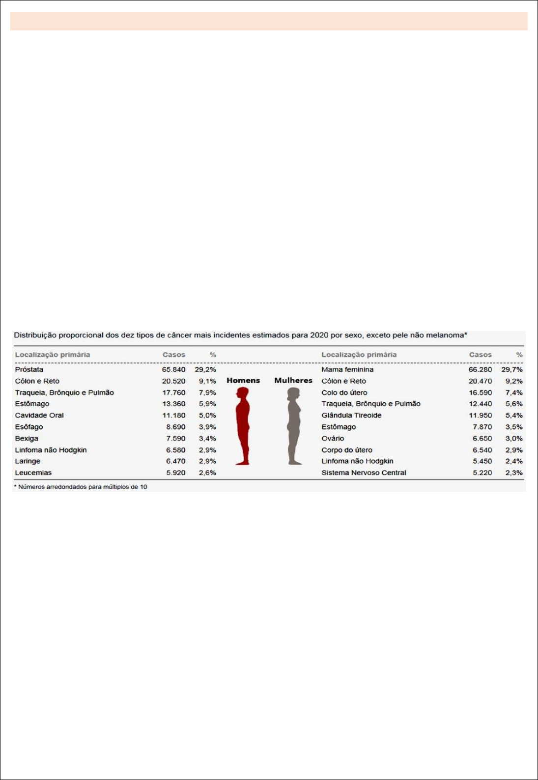 RESUMO - CADERNO DE ATENÇÃO PRIMÁRIA – RASTREAMENTO: DICIPLINA: PROGRAMA DE ATENÇÃO PRIMÁRIA À SAÚDE Critérios para um programa de rastreamento – orientações do Ministério da Saúde: 1. A doença deve representar um importante problema de saúde pública que seja relevante para a população, levando em consideração os conceitos de magnitude, transcendência e vulnerabilidade; 2. A história natural da doença ou do problema clínico deve ser bem conhecida; 3. Deve existir estágio pré-clínico (assintomático) bem definido, durante o qual a doença possa ser diagnosticada; 4. O benefício da detecção e do tratamento precoce com o rastreamento deve ser maior do que se a condição fosse tratada no momento habitual de diagnóstico; 5. Os exames que detectam a condição clínica no estágio assintomático devem estar disponíveis, aceitáveis e confiáveis; 6. O custo do rastreamento e tratamento de uma condição clínica deve ser razoável e compatível com o orçamento destinado ao sistema de saúde como um todo; 7. O rastreamento deve ser um processo contínuo e sistemático. Tipos de câncer mais incidentes no Brasil estimados para 2020. Fonte: INCA, 2021: COMPORTAMENTOS E HÁBITOS PARA PREVENÇÃO DO CÂNCER: Não fumar - prevenir o câncer, principalmente os de pulmão, cavidade oral, laringe, faringe e esôfago. Alimentação saudável – preferir alimentos minimamente processados. Manter o peso corporal adequado. Atividade física . Amamentação - O aleitamento materno é a primeira ação de alimentação saudável. A amamentação até os dois anos ou mais, sendo exclusiva até os seis meses de vida da criança, protege as mães contra o câncer de mama e as crianças contra a obesidade infantil. A partir de seis meses da criança, deve- se complementar a amamentação conforme a dica sobre Alimentação saudável e proteção contra o câncer. Mulheres entre 25 e 64 anos devem fazer o exame preventivo do câncer do colo do útero a cada três anos. Vacine contra o HPV as meninas de 9 a 14 anos e os meninos de 11 a 14 anos. Vacine contra a hepatite B- prevenção do câncer de fígado Redução da ingesta de álcool. Evite comer carnes processadas – conservantes e processados aumentam a chance de surgir câncer colorretal – o sal aumenta as chances de desenvolver câncer de estomago. Evite a exposição ao sol entre 10h e 16h, e use sempre proteção adequada, como chapéu, barraca e protetor solar, inclusive nos lábios. Evite exposição a agentes cancerígenos no trabalho - a elaboração de planos para evitar o adoecimento dos trabalhadores. Também é fundamental a implementação de leis que obriguem e fiscalizem a substituição dos agentes causadores câncer no trabalho por outros mais saudáveis, quando já houver esta alternativa. DETECÇÃO PRECOCE DE CÂNCER: Sinais de alerta: RASTREAMENTO DE CÂNCER DE COLO DO ÚTERO: Recomenda-se fortemente o rastreamento de câncer do colo do útero de mulheres sexualmente ativas e que tenham cérvice. – Grau de recomendação A É feito em mulheres com idade entre 25 a 64 anos a cada 3 anos após dois exames normais anuais consecutivos. Recomenda-se contra (não fazer) o rastreamento de rotina de câncer de colo de útero em mulheres maiores de 65 anos que tiveram um rastreamento com Papanicolau normal e que não fazem parte de grupo de alto risco para esse câncer. Grau de recomendação D. Recomenda-se contra (não fazer) o rastreamento de câncer do colo do útero em mulheres que realizaram histerectomia total. Grau de recomendação D. RASTREAMENTO DO CÂNCER DE MAMA: Recomenda-se o rastreamento de câncer de mama bianual por meio de mamografia para mulheres entre 50 a 74 anos. Grau de recomendação B. A decisão de começar o rastreamento bianual com mamografia antes dos 50 anos deve ser uma decisão individualizada, levando em consideração o contexto da paciente, os benefícios e os malefícios. Grau de recomendação C. RASTREAMENTO DO CÂNCER DE CÓLON E RETO: Recomenda-se o rastreamento para o câncer de colón e reto usando pesquisa de sangue oculto nas fezes, colonoscopia ou sigmoidoscopia, em adultos entre 50 e 75 anos. Os riscos e os benefícios variam conforme o exame de rastreamento. Grau de recomendação A. Recomenda-se contra (não fazer) o rastreamento de rotina para o câncer de cólon e reto em adutos entre 75 e 85 anos. Pode haver considerações que suportem o rastreamento desse câncer individualmente. Grau de recomendação C. Recomenda-se contra (não fazer) o rastreamento de câncer de cólon e reto em pacientes de 85 anos ou mais. Grau de recomendação D. RASTREAÇÃO DO CÂNCER DE PRÓSTATA: O nível de evidência ainda é insuficiente para tecer recomendações a favor ou contra a adoção do rastreamento para o câncer de próstata em homens assintomáticos com idade inferior a 75 anos. Não há evidências que essa prática seja eficaz, ou as evidências são pobres e conflitantes e a relação custo-benefício não pode ser determinada. Grau de recomendação I. Recomenda-se a não adoção do rastreamento de câncer de próstata em homens assintomáticos com idade superior a 75 anos, uma vez que existe nível adequado de evidência mostrando que essa estratégia é ineficaz e que os danos superam os benefícios. Grau de recomendação D. RECOMENDAÇÃO DE CÂNCER DE PELE: As evidências ainda são insuficientes para se avaliar os benefícios e malefícios para a recomendação do exame de toda a pele do corpo por um médico de atenção primária ou pela própria pessoa, a fim do diagnóstico precoce de melanoma, câncer espinocelular e basocelular na população geral. Grau de recomendação I. RASTERAMENTO DE CÂNCER DE BOCA: As evidências ainda são insuficientes para a recomendação contra ou a favor do exame rotineiro de adultos parar o câncer de boca. Grau de recomendação I. Referências: Brasil. Ministério da Saúde. Secretaria de Atenção à Saúde