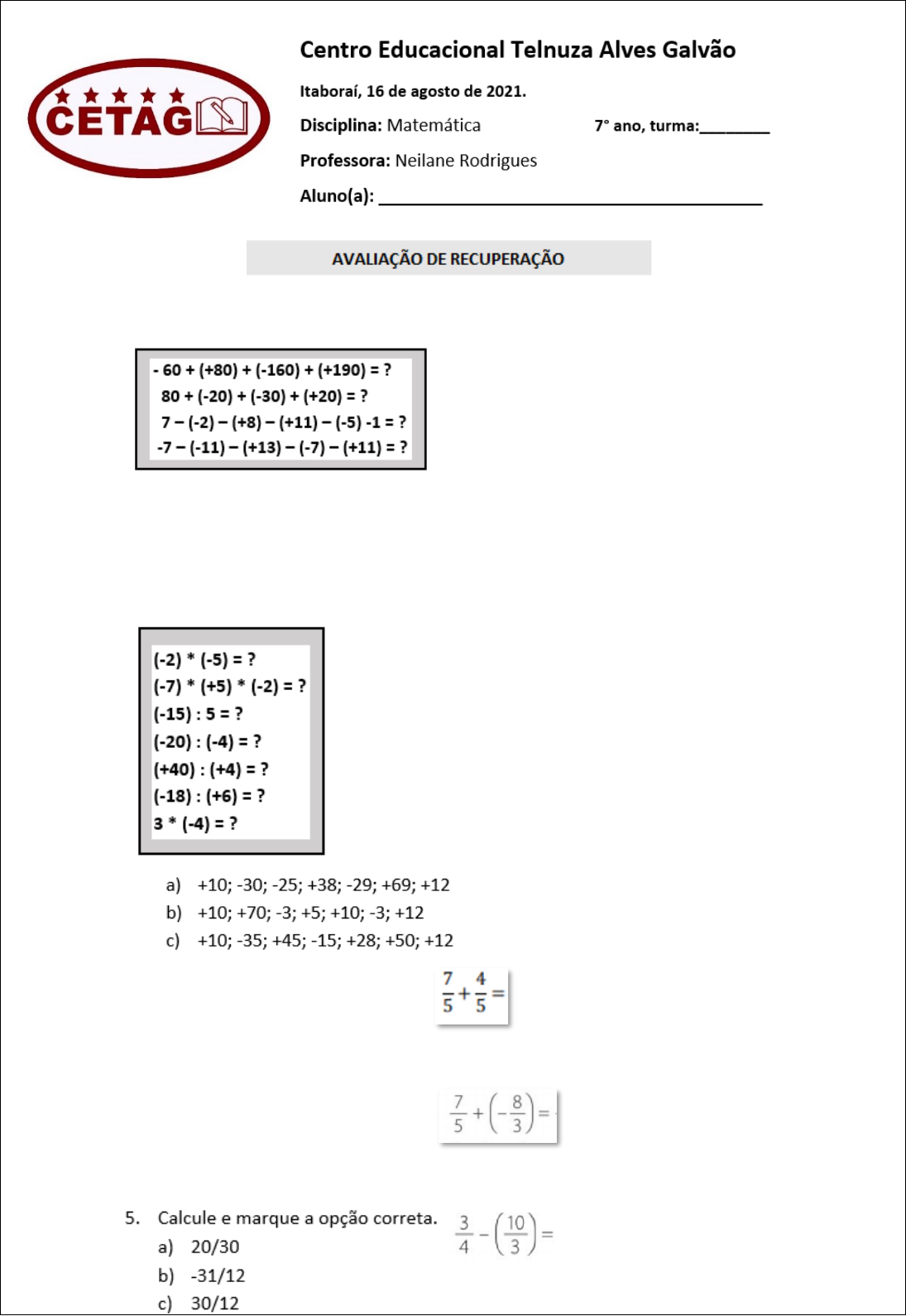 1 1. Calcule e marque a opção correta. a) +50; +50; -6; -13 b) 64; -50; -10; 20 c) +50; -20; +30; -10 2. Calcule e marque a opção correta. 3. Calcule e marque opção correta. a) 2/10 b) 5/10 c) 11/5 4. Calcule e marque a opção correta. a) 11/20 b) 19/15 c) -19/15 2 Gabarito 1: A Gabarito 2: B Gabarito 3: C Gabarito 4: C Gabarito 5: B