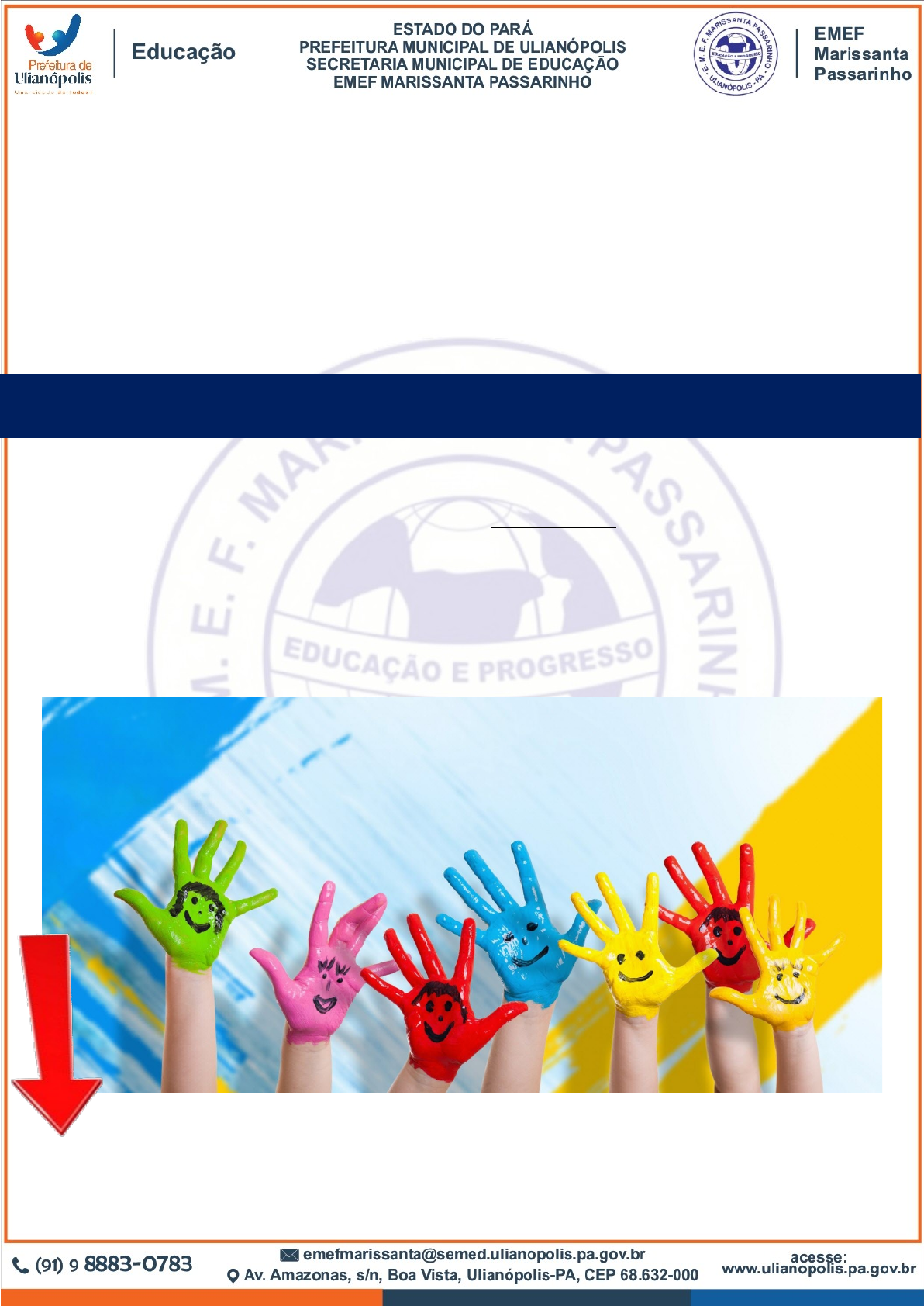 ESCOLA MUNICIPAL DE ENSINO FUNDAMENTAL MARISSANTA PASSARINHO DIRETOR: JOÃO RAMOS DE ALMEIDA LOPES COORDENADORA: ANA ROSA RAMOS DE SOUSA PROFESSOR: JOHN PABLO DE SOUSA PINHEIRO 5° ANO B (VESPERTINO) BLOCO DE ATIVIDADES Nº 08 2° SEMESTRE DE 2021 Período de 13/10/21 a 15/10/21 Devolução dia: 15/10/2021 Quem acredita sempre alcança! SEU NOME ULIANÓPOLIS-PA 2021 ALUNO(A): OS JOVENS PERGUNTAM: Como posso me sair bem estudando em casa? Muitos jovens hoje estão estudando numa “sala de aula” diferente: em casa. Você está nessa situação? O que você pode fazer para se sair bem? Veja o resumo de algumas dicas. RESUMO: COMO POSSO ME SAIR BEM ESTUDANDO EM CASA? → Faça uma programação. Se você não tem uma rotina de estudo, crie uma e se esforce para seguir essa programação. → Seja disciplinado. Aprenda a cumprir suas responsabilidades, mesmo quando você não está a fim. → Prepare um lugar para estudar. O lugar onde você estuda precisa ser confortável — mas não confortável demais. Não deixe por perto nada que possa distrair você. → Aprenda a se concentrar. Concentre-se no assunto que você está estudando e não tente fazer outras coisas ao mesmo tempo. → Pare de vez em quando. Parar um pouco para fazer uma atividade física ou alguma outra coisa que você gosta te dá mais energia para continuar estudando depois. Leia o artigo completo acessando JW.ORG > Ensinos Bíblicos > Adolescentes > Os jovens também perguntam > Escola > Como posso me sair bem estudando em casa? Ou clique no link: https://www.jw.org/pt/ensinos-biblicos/adolescentes/perguntam/estudar-em-casa/ Ah!! E embora o responsável possa auxiliar nas atividades, elas devem ser feitas pelo aluno, Fazer atividade pelo aluno prejudica o aprendizado dele e impede o professor de identificar as dificuldades e de contribuir para sanar elas. E lembre, você sempre pode contar com a ajuda de seu professor, não tenha medo ou vergonha de perguntar. Atenciosamente, Prof. John Pablo (91) 9 8432-0082 | @johnpablolibras OBSERVAÇÃO 1 Se você não estiver no grupo de whatsapp da turma, entre em contato comigo imediatamente. OBSERVAÇÃO 2 Não se esqueça de colocar seu nome em cada página, mesmo que já tenha colocado na capa do bloco. CRONOGRAMA SEMANAL DE AULAS DATA HORÁRIO DISCIPLINA HAB. BNCC CONTEÚDO BLOCO 08 4ª FEIRA 13/10/2021 1°, 2° e 3° Língua Portuguesa EF05LP05 Trava-Línguas 4° História EF05HI02 Jogo dos 7 erros e Advinhas 5ª FEIRA 14/10/2021 1°, 2° e 3° Matemática EF05MA19 Multiplicação e divisão. 4° Geografia EF05GE01 Tecnologias 6ª FEIRA 15/10/2021 1° Arte EF15AR03 Parlendas 2° Ensino Religioso EF05ER06 Preservação das narrativas orais – Direitos e Deveres 3° Educação Física EF35EF01 Brincadeiras e jogos – SER CRIANÇA LÍNGUA PORTUGUESA 4ª FEIRA PROFESSOR: JOHN PABLO DE SOUSA PINHEIRO ANO: 5º B TURMA: F5T901 ALUNO(A): CH: 180 MIN. HABILIDADE(S): EF05LP15 DATA: 13/10/2021 CONTEÚDO: Ortografia · Com base no que estudamos nos últimos blocos e em sala, resolva as questões abaixo: TRAVA-LÍNGUA No trava-língua, o grande desafio é repetir as frases sem “travar”. A brincadeira, além de divertida, auxilia na capacidade de domínio da pronúncia, uma vez que estes desafios também são exercícios. VAMOS LER “Três pratos de trigo para três tigres tristes.” “O rato roeu a roupa do rei de Roma.” “A rainha com raiva resolveu remendar.” “Um limão, mil limões, um milhão de limões”. “Num ninho de mafagafos, cinco mafagafinhos há! Quem os desmafagafizá-los, um bom desmafagafizador será.” “O padre pouca capa tem, porque pouca capa compra.” “A Iara agarra e amarra a rara arara de Araraquara.” “O pinto pia, a pipa pinga. Pinga a pipa e o pinto pia. Quanto mais o pinto pia mais a pipa pinga.” “O que é que Cacá quer? Cacá quer caqui. Qual caqui que Cacá quer? Cacá quer qualquer caqui.” “A aranha arranha a rã. A rã arranha a aranha. Nem a aranha arranha a rã. Nem a rã arranha a aranha.” “O doce perguntou pro doce: Qual é o doce mais doce que o doce de batata-doce? O doce respondeu pro doce que o doce mais doce que o doce de batata-doce É o doce de doce de batata-doce.” Após você fazer a brincadeira do trava-língua, escolha um deles, copie abaixo e ilustre: ________________________________________________________________________________________________________________________________________________________________________________________________________________________________________________________________________________________________________________________________________________________________________________ Agora desenhe o trava-língua escolhido: HISTÓRIA 4ª FEIRA PROFESSOR: JOHN PABLO DE SOUSA PINHEIRO ANO: 5º B TURMA: F5T901 ALUNO(A): CH: 60 MIN. HABILIDADE(S): EF05HI02 DATA: 13/10/2021 CONTEÚDO: Jogo dos 7 erros e Advinhas MATEMÁTICA 5ª FEIRA PROFESSOR: JOHN PABLO DE SOUSA PINHEIRO ANO: 5º B TURMA: F5T901 ALUNO(A): CH: 180 MIN. HABILIDADE(S): EF05MA19 DATA: 14/10/2021 CONTEÚDO: Multiplicação e divisão. MULTIPLICAÇÃO · Com base no que estudamos nos últimos blocos e em sala, resolva as questões abaixo. RESOLVA AS MULTIPLICAÇÕES ABAIXO. CONFORME O MODELO (Multiplique o numero ao centro, pelo número acima e coloque o resultado nos espaços em branco). GEOGRAFIA 5ª FEIRA PROFESSOR: JOHN PABLO DE SOUSA PINHEIRO ANO: 5º B TURMA: F5T901 ALUNO(A): CH: 60 MIN. HABILIDADE(S): EF05GE01 DATA: 14/10/2021 CONTEÚDO: Tecnologias LIVRO DIDÁTICO DE GEOGRAFIA · Com base na leitura e observação das imagens na página 50, resolva as questões 03, 04 e 05 (página 49). Questão 03: Quais transformações na paisagem, provocadas pelo uso da tecnologia, você observa nas fotografias da página anterior? ____________________________________________________________________________________________________________________________________________________________________________________________