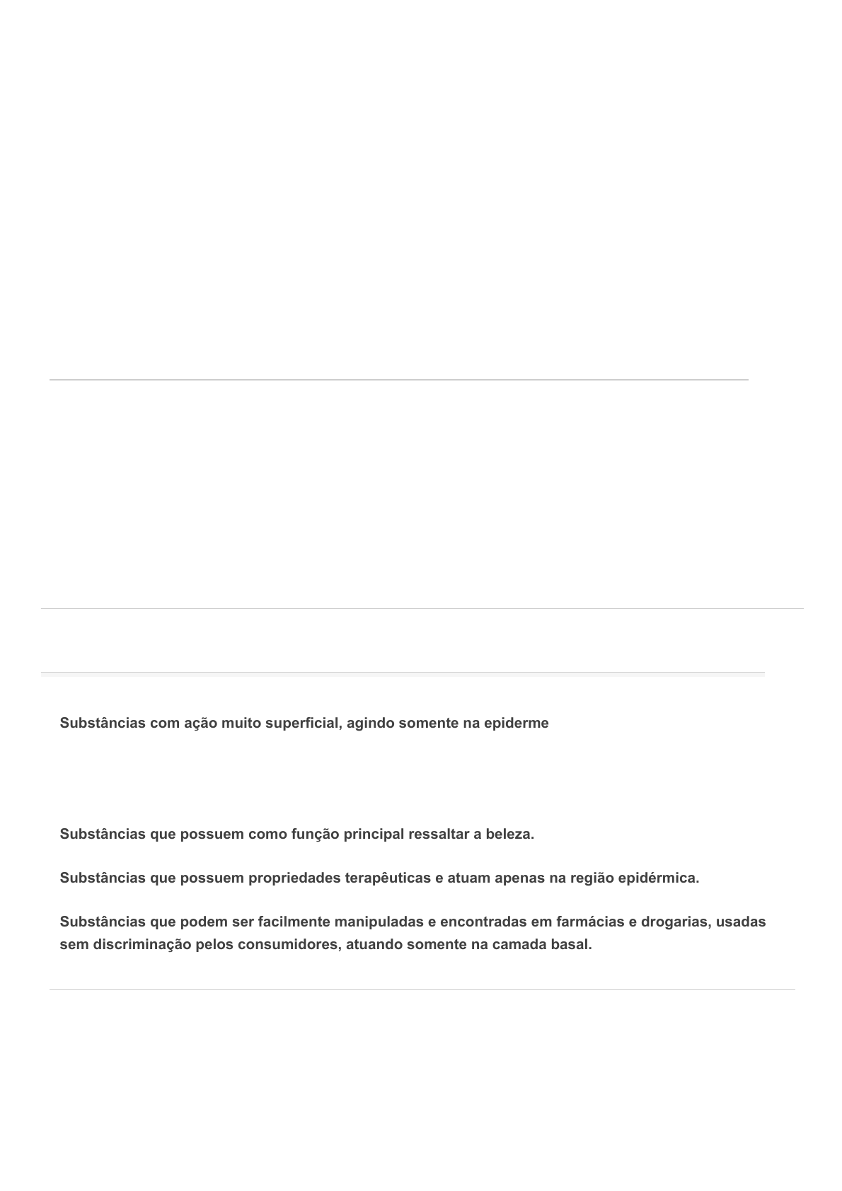 02/12/2021 17:14 Comentários https://sereduc.blackboard.com/ultra/courses/_73986_1/grades/assessment/_4384294_1/overview/attempt/_15961172_1/review/inline-feedback?… 1/6 Conteúdo do exercício Ocultar opções de resposta Pergunta 1 -- /1 Dentro do estudo da cosmetologia, é comum o profissional se deparar com as palavras dermocosméticos, cosmecêuticos e cosméticos. Sendo assim, levando em consideração as características e definição de cosmecêuticos, assinale a alternativa CORRETA. Substâncias com ação muito superficial, agindo somente na epiderme Resposta correta Cosméticos com leve ação medicamentosa e que têm em sua fórmula ingredientes com moderadas propriedades terapêuticas. Substâncias que possuem como função principal ressaltar a beleza. Substâncias que possuem propriedades terapêuticas e atuam apenas na região epidérmica. Substâncias que podem ser facilmente manipuladas e encontradas em farmácias e drogarias, usadas sem discriminação pelos consumidores, atuando somente na camada basal. Pergunta 2 -- /1 10/10 Nota final Enviado: 02/12/21 17:07 (BRT) 02/12/2021 17:14 Comentários https://sereduc.blackboard.com/ultra/courses/_73986_1/grades/assessment/_4384294_1/overview/attempt/_15961172_1/review/inline-feedback?… 2/6 Ocultar opções de resposta Ocultar opções de resposta As emulsões são compostos que contêm duas substâncias imiscíveis entre si. Entretanto, para que a mistura ocorra, é necessária a presença de um agente que estabilize ambas as substâncias. Sendo assim, assinale a alternativa que corresponde, corretamente, ao tipo de substância utilizada para isso. Umectantes Resposta corretaTensoativo Espessantes Flavorizantes Gelificantes Pergunta 3 -- /1 Alguns cosméticos auxiliam na reparação e correção da pele, atuando nas imperfeições da pele e seus anexos. Sendo assim, assinale a alternativa que corresponde, corretamente, a um exemplo de cosmético reparador/corretor. Emulsões Hidratantes Talcos Resposta corretaDespigmentantes Argilas Pergunta 4 -- /1 02/12/2021 17:14 Comentários https://sereduc.blackboard.com/ultra/courses/_73986_1/grades/assessment/_4384294_1/overview/attempt/_15961172_1/review/inline-feedback?… 3/6 Ocultar opções de resposta Ocultar opções de resposta Os cosméticos estão divididos de acordo com sua função, formulação, forma cosmética e grau de risco, de acordo com as especificações da Agência Nacional de Vigilância Sanitária, a ANVISA. Sendo assim, levando em consideração a função de um sabonete, assinale a alternativa que corresponde CORRETAMENTE ao seu tipo cosmético. Resposta corretaHigienizante Demaquilante Firmante Hidratante Reparador Pergunta 5 -- /1 Os ativos firmantes são utilizados com o objetivo de estimular a produção de colágeno e elastina da pele, bem como prevenir e melhorar os sinais do envelhecimento cutâneo, agindo na sustentação do tecido. Sendo assim, assinale a alternativa que NÃO corresponde, corretamente, a um tipo de ativo firmante. Resposta correta Aquaporine Raffermine Tensine Argireline DMAE 02/12/2021 17:14 Comentários https://sereduc.blackboard.com/ultra/courses/_73986_1/grades/assessment/_4384294_1/overview/attempt/_15961172_1/review/inline-feedback?… 4/6 Ocultar opções de resposta Ocultar opções de resposta Pergunta 6 -- /1 Com relação ao grupo de risco dos cosméticos estabelecido pela ANVISA, temos duas categorias: risco de nível 1, ou mínimo, e grupo de risco 2, ou risco potencial. Sendo assim, levando tais categorias em consideração, assinale a alternativa que contém corretamente um exemplo do grupo de risco 2. Sais de banho Creme hidratante Perfumes Pasta dental Resposta corretaTinturas de cabelo Pergunta 7 -- /1 As emulsões, devido a suas características, apresentam normalmente mais de uma fase, sendo uma interna e outra externa. Sendo assim, levando em consideração as combinações entre água (A) e óleo (O) nas emulsões, assinale a alternativa INCORRETA com relação à formulação das emulsões Resposta corretaO/O/ A/O A/O/A O/A/O O/A 02/12/2021 17:14 Comentários https://sereduc.blackboard.com/ultra/courses/_73986_1/grades/assessment/_4384294_1/overview/attempt/_15961172_1/review/inline-feedback?… 5/6 Ocultar opções de resposta Ocultar opções de resposta Pergunta 8 -- /1 Devido à sua forma cosmética, os produtos em géis são bastante utilizados por pessoas de pele mista, oleosa e acneica. Suas características e mecanismo de ação, com os ativos cosméticos, também auxiliam na escolha do consumidor. Sendo assim, levando em consideração as características dos géis, assinale a alternativa INCORRETA. Possuem partículas dispersas em seu solvente. A suspensão das substâncias são hidratáveis. É uma mistura espessa e de grande viscosidade. Cria uma película com a evaporação da parte líquida, mantendo o ativo na pele. Resposta corretaApresenta boa permeabilidade no tecido cutâneo. Pergunta 9 -- /1 Os cosméticos estão cada vez mais sendo desenvolvidos com altas tecnologias, favorecendo a entrega dos ativos no tecido-alvo, permitindo uma maior eficácia e resposta ao uso dos produtos. Por isso, o uso de lipossomas nas formulações, assim como outras tecnologias, auxilia nesse processo. Sendo assim, levando em consideração as características dos lipossomas, assinale a alternativa INCORRETA. Não sofrem desestruturação ao passar pelos óstios. Se mantém estáveis sem alterações ambientais. Libera os ativos de forma gradativa. Resposta corretaSão resistentes a tensoativos. 02/12/2021 17:14 Comentários https://sereduc.blackboard.com/ultra/courses/_73986_1/grades/assessment/_4384294_1/overview/attempt/_15961172_1/review/inline-feedback?… 6/6 Ocultar opções de resposta Apresentam atividade por horas após a aplicação. Pergunta 10 -- /1 Para que os cosméticos consigam permear seus ativos, em primeiro lugar, é necessário transpor a barreira lipídica cutânea. Sendo assim, assina