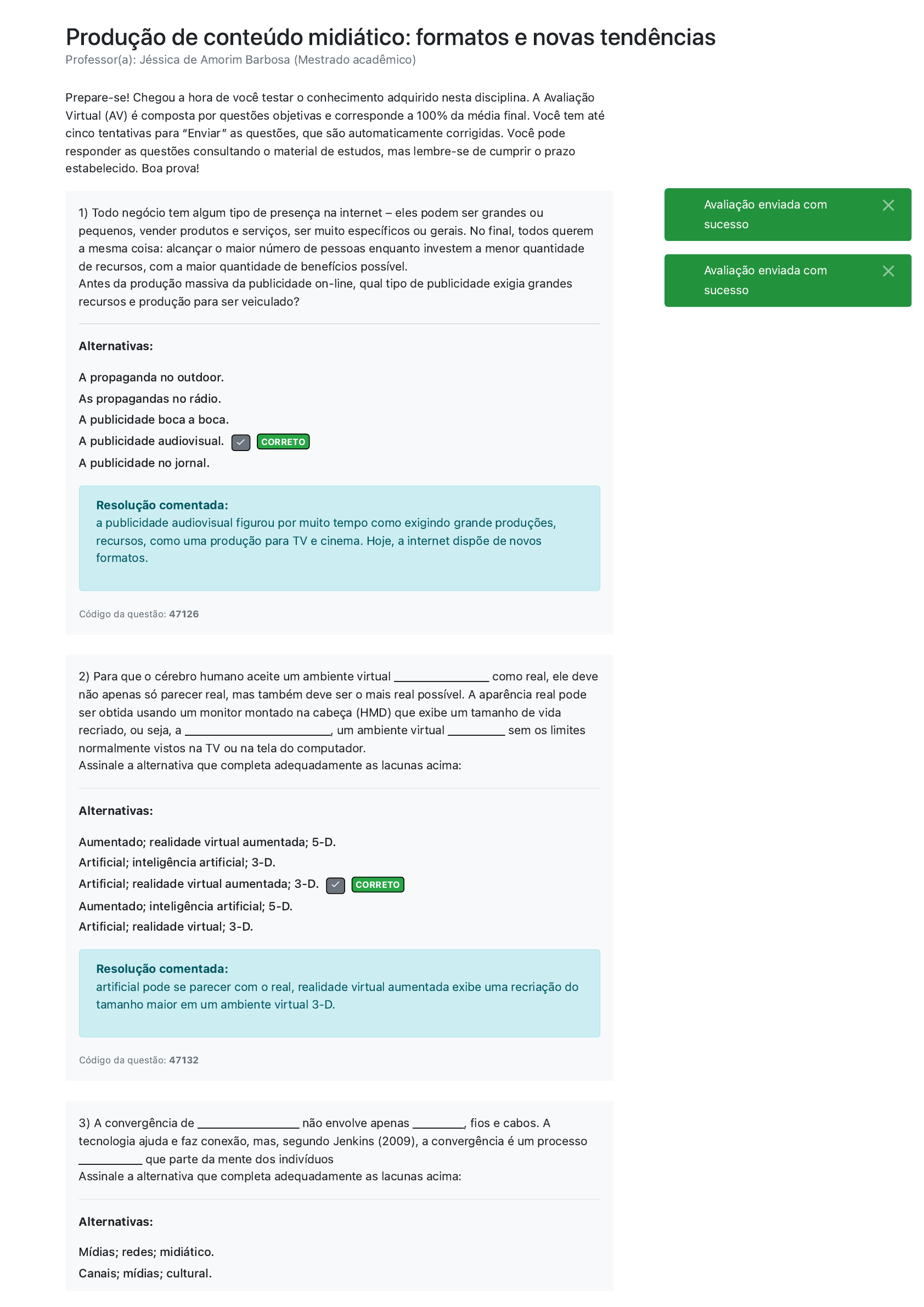 Produção de conteúdo midiático: formatos e novas tendências Professor(a): Jéssica de Amorim Barbosa (Mestrado acadêmico) 1) 2) 3) Prepare-se! Chegou a hora de você testar o conhecimento adquirido nesta disciplina. A Avaliação Virtual (AV) é composta por questões objetivas e corresponde a 100% da média final. Você tem até cinco tentativas para “Enviar” as questões, que são automaticamente corrigidas. Você pode responder as questões consultando o material de estudos, mas lembre-se de cumprir o prazo estabelecido. Boa prova! Todo negócio tem algum tipo de presença na internet – eles podem ser grandes ou pequenos, vender produtos e serviços, ser muito específicos ou gerais. No final, todos querem a mesma coisa: alcançar o maior número de pessoas enquanto investem a menor quantidade de recursos, com a maior quantidade de benefícios possível. Antes da produção massiva da publicidade on-line, qual tipo de publicidade exigia grandes recursos e produção para ser veiculado? Alternativas: A propaganda no outdoor. As propagandas no rádio. A publicidade boca a boca. A publicidade audiovisual. CORRETO A publicidade no jornal. Código da questão: 47126 Para que o cérebro humano aceite um ambiente virtual _______________ como real, ele deve não apenas só parecer real, mas também deve ser o mais real possível. A aparência real pode ser obtida usando um monitor montado na cabeça (HMD) que exibe um tamanho de vida recriado, ou seja, a _______________________, um ambiente virtual _________ sem os limites normalmente vistos na TV ou na tela do computador. Assinale a alternativa que completa adequadamente as lacunas acima: Alternativas: Aumentado; realidade virtual aumentada; 5-D. Artificial; inteligência artificial; 3-D. Artificial; realidade virtual aumentada; 3-D. CORRETO Aumentado; inteligência artificial; 5-D. Artificial; realidade virtual; 3-D. Código da questão: 47132 A convergência de ________________ não envolve apenas ________, fios e cabos. A tecnologia ajuda e faz conexão, mas, segundo Jenkins (2009), a convergência é um processo __________ que parte da mente dos indivíduos Assinale a alternativa que completa adequadamente as lacunas acima: Alternativas: Mídias; redes; midiático. Canais; mídias; cultural. Resolução comentada: a publicidade audiovisual figurou por muito tempo como exigindo grande produções, recursos, como uma produção para TV e cinema. Hoje, a internet dispõe de novos formatos. Resolução comentada: artificial pode se parecer com o real, realidade virtual aumentada exibe uma recriação do tamanho maior em um ambiente virtual 3-D. Avaliação enviada com sucesso c h e c k Avaliação enviada com sucesso c h e c k 4) 5) Mídias; redes; cultural. CORRETO Canais; redes; cultural. Mídias; computadores; midiático. Código da questão: 47107 Sobre as particularidades e o funcionamento dos aplicativos de redes sociais, classifique como verdadeiro ou falso: ( ) Os primeiros vídeos do Snapchat têm o tempo máximo de 15 segundos. ( ) Blogs devem privilegiar o texto escrito em detrimento das imagens. ( ) O Facebook foi o sistematizador da hashtag. ( ) O Twitter possui um espaço restrito para publicação de, no máximo, 280 caracteres com espaço. ( ) Um blog post deve ter pelo menos cinco intertítulos. Assinale a alternativa que contenha a sequência correta: Alternativas: V – V – V – V – F. F – V – V – V – F. F – V – F – V – F. V – F – F – F – V. V – V – F – V – F. CORRETO Código da questão: 47119 Sobre os reality shows mais conhecidos e citados em nossa Leitura Fundamental, considere as seguintes afirmações: ( ) Big Brother é uma criação americana. ( ) O programa Survivor foi o reality show pioneiro na televisão mundial. ( ) No Limite ficou por 15 anos no ar. ( ) MasterChef escolhe seus participante por meio de audições antes de começar o programa. ( ) A Casa dos Artistas estreou no mesmo ano de BBB. Assinale a alternativa que contenha a sequência correta: Alternativas: V – V – F – V – V. F – V – V – V – F. F – V – F – F – F. F – V – F – V – F. CORRETO V – V – F – V – F. Código da questão: 47114 Resolução comentada: A convergência é algo muito mais “simples” do que a nomenclatura supõe. Jenkins diz que, quando vemos uma pessoa na rua e a consideramos parecida com algum artista de TV, é um momento de convergência. Associamos a imagem do artista com a da pessoa e fazemos essa conexão em nossa mente. Resolução comentada: foi o Twitter o sistematizador da hashtag e não há limite ou regra para número de intertítulos em um blogpost. Resolução comentada: Big Brother é holandês, No Limite ficou no ar por nove anos e a Casa dos Artistas estreou no ano seguinte ao BBB. Avaliação enviada com sucesso c h e c k Avaliação enviada com sucesso c h e c k 6) 7) 8) Com a banda larga e o surgimento de __________________________ como o YouTube, hoje não é preciso equipamentos caros e toda uma infraestrutura para produzir __________. Com __________________ e poucos recursos, é possível produzir conteúdo audiovisual de qualidade. Assinale a alternativa que completa adequadamente as lacunas acima: Alternativas: Mídias digitais; conteúdo; câmera. Redes sociais; conteúdo; câmera. Plataformas digitais; conteúdo; celular. Plataformas digitais; vídeos; celular. CORRETO Mídias digitais; vídeos; câmera. Código da questão: 47122 Sobre a publicidade on-line, considere as seguintes afirmações: I. Os gastos com publicidade na internet atingiram 137,53 bilhões de dólares em 2017. II. Os blogs corporativos são os campeões em anúncios on-line. III. Publicidade nos mecanismos de busca não funciona. IV. Os anúncios on-line para Facebook devem ter, no mínimo, 200 mp. V. Um dos métodos de publicidade na internet mais utilizados é o Search Engine Marketing (SEM). São verdadeiras: Alternativas: I – II – IV. II
