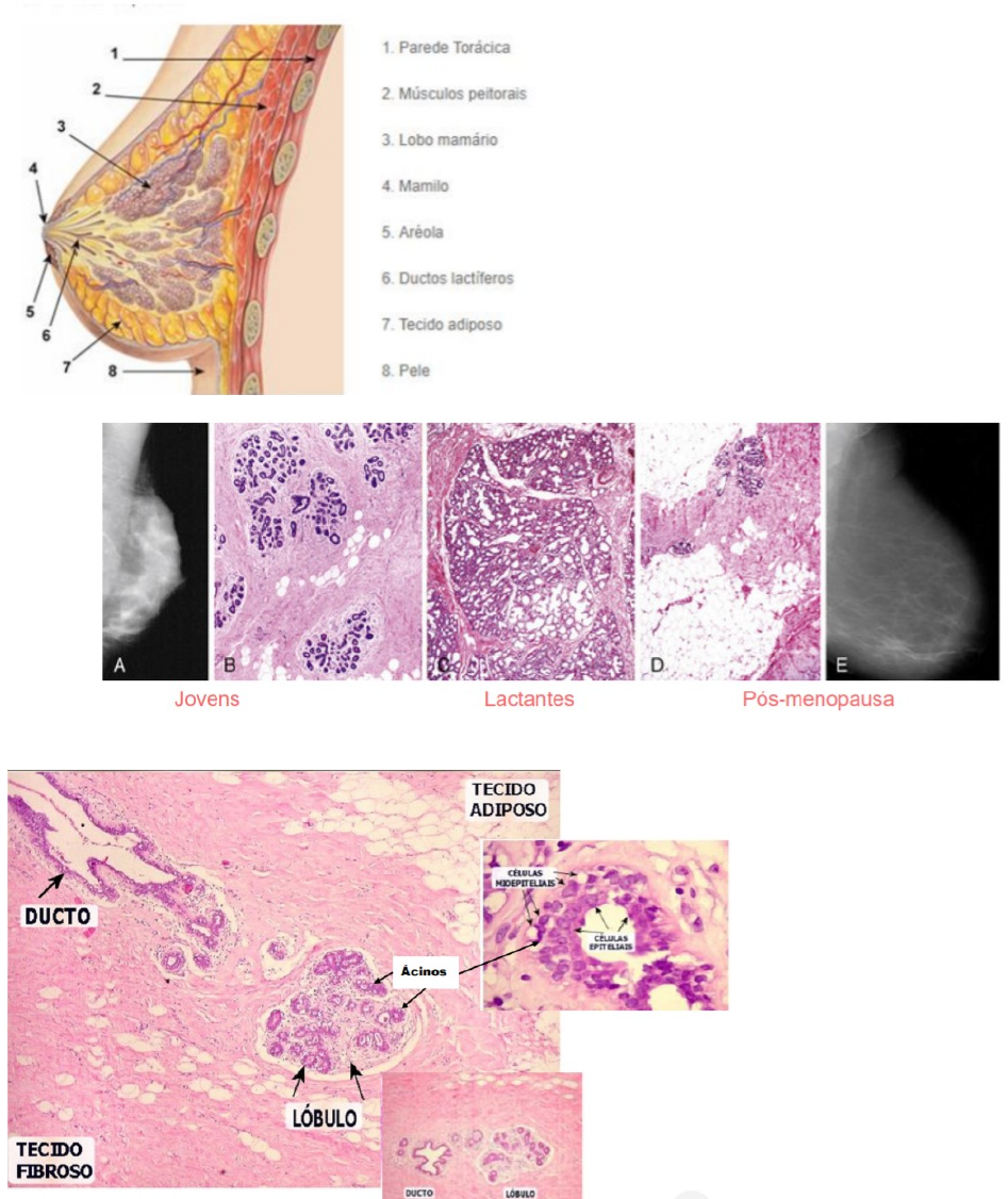 Processos Fisiopatológicos – II Neoplasia Mamária Maligna Desmoplasia: formação de tecido conjuntivo fibroso. Características gerais das mamas: - Puberdade: crescimento das mamas em função do crescimento do tecido glandular e da deposição aumentada de tecido adiposo. - Ciclo menstrual: aumento do volume mamário devido a retenção de líquido e do desenvolvimento do tecido glandular. - Gravidez: crescimento de glândulas mamárias e secreção de leite. - Menopausa: o tecido mamário sofre atrofia, sendo substituído gradativamente por tecido adiposo. - A drenagem linfática da mama ocorre preferencialmente para a axila (97%), e o restante drena para a cadeia mamária interna (3%). - Pacientes que apresentam mamografia com predomínio de tecido fibroglandular (mamas densas) tem maior risco de desenvolver o câncer de mama e, nessa situação, a mamografia tem menor sensibilidade (mamas densas dificultam a avaliação das lesões mamárias) o predomínio glandular ou de tecido fibroso é hereditário. Epidemiologia: - Câncer mais comum entre mulheres. Fatores de risco: - 99% mulheres. - Idade avançada: incidência aumenta após 30 anos (pico 70 a 80 anos). - Idade de menarca: inferior a 11 anos aumenta risco (maior número de ovulações). - Mutações hereditárias: 5 a 10% (mulheres com a mutação herdada tem 90% de chance de desenvolver o CA). - Parentes de primeiro grau: 15 a 20%. - Raça/etnia: brancas não hispânicas. - Idade de nascimento do primeiro filho antes dos 20 anos diminui risco. - Doença mamária benigna. - Exposição estrogênica: reposição hormonal aumenta risco. - Densidade mamária: aumenta 4 a 6x o risco (devido a dificuldade de identificação). - Radiação. - Carcinoma contralateral ou de endométrio: aumenta risco 1%. - Dieta: álcool. - Sedentarismo. - Obesidade (síntese estrogênio gordura). - Amamentação. - Tóxicos ambientais. Etiopatogenia - Subtipos biológicos: Receptor de estrogênio (RE). Receptor do fator de crescimento epidérmico humano 2 (HER). - 50 a 65%: RE positivo e HER2 negativo. - 10 a 20%: RE positivo/negativo e HER2 positivo. - 10 a 20%: RE negativo e HER2 negativo. - Câncer de mama é uma proliferação clonal que se origina de células com várias mutações genéticas, que são adquiridas por influência de exposições hormonais ou genes suscetíveis herdados. Hereditário: - Mutações de genes supressores tumorais (10%). - Aproximadamente 12% dos casos de câncer de mama ocorrem devido à hereditariedade de um gene ou genes suscetíveis. - A probabilidade de uma etiologia hereditária aumenta quando existem parentes de primeiro grau afetados, idade precoce, múltiplos cânceres ou membros da família com outros cânceres específicos. - SUPEREXPRESSÃO - HER2 - receptor epidérmico humano 2 (do fator de crescimento) - cromossomo 17. Esporádico: - Exposição a estrogênios. - Progressão de lesões proliferativa 80 a 90% - Os principais fatores de risco para o câncer de mama esporádico são aqueles relacionados à exposição hormonal: gênero, idade da menarca e menopausa, história reprodutiva, amamentação e estrogênios exógenos. · Adenocarcinoma de mama: Etiopatogenia: mecanismos moleculares. - CDIS = carcinoma ductal in situ. Etiopatogenia: · Carcinoma Ductal In Situ (CDIS): -Proliferação clonal de células epiteliais malignas, limitadas aos ductos e lóbulos pela membrana basal. - A maioria é identificada como um resultado de calcificações associadas a secreções ou necrose; menos comumente, fibrose periductal envolvendo alguns casos de CDIS forma uma densidade mamográfica ou massa palpável. - Dividido em comedocarcinoma e não comedocarcinoma. CDSI do tipo comedocarcinoma: pode produzir alguma nodularidade, mas geralmente é detectado na mamografia como áreas de calcificações agrupadas, lineares e com ramificações. Definido por duas características: células neoplásicas com núcleo pleomórfico de alto grau e áreas de necrose central. A e B. Comedocarcinoma. A. Imagem radiológica revela calcificações lineares e ramificadas dentro do sistema ductal. B. Proliferação de alto grau associada a grandes áreas centrais de necrose e calcificações preenchendo vários ductos. CDSI do tipo não comedocarcinoma: pode apresentar vários padrões, porém sem núcleo de alto grau e necrose central. O cribiforme pode ter espaços arredondados em meio a ductos ou um padrão sólido. O micropapilífero é reconhecido pelas protrusões bulbares sem eixos fibrovasculares, frequentemente arranjadas em complexos padrões intraductais. Em outros casos, o CDIS produz verdadeiras papilas, com núcleos fibrovasculares desprovidos de células mioepiteliais. As calcificações também podem ser observadas na forma não comedocarcinoma do CDIS, associadas à necrose focal ou a secreções intraluminais. C e D. Não comedocarcinomas. C. CDIS cribriforme. Note os espaços arredondados regulares (“cortador de biscoito”) contendo secreções e calcificações. D. CDIS micropapilífero. As projeções papilíferas não exibem eixos fibrovasculares. Doença de Paget: manifestação rara do CA de mama (de 1 a 4% dos casos). Se apresenta como uma erupção eritematosa unilateral com crosta escamosa. A presença de prurido é comum. Células neoplásicas (células de Paget) se disseminam pelo sistema ductal, através dos seios galactíferos, para a pele do mamilo, sem infiltrar a membrana basal. As células neoplásicas rompem a barreira epitelial normal, permitindo que o fluido extracelular seja exteriorizado pela superfície do mamilo. As células de Paget são facilmente detectadas pela biópsia do mamilo ou em preparados citológicos do exsudato. Uma massa palpável está preenta em 50 a 60% dos casos. São frequentemente pouco diferenciados, RE negativos com superexpressão de HER2. O prognóstico depende das características do carcinoma subjacente. · Carcinoma Lobular in Situ (CLIS): - O CLIS é uma p