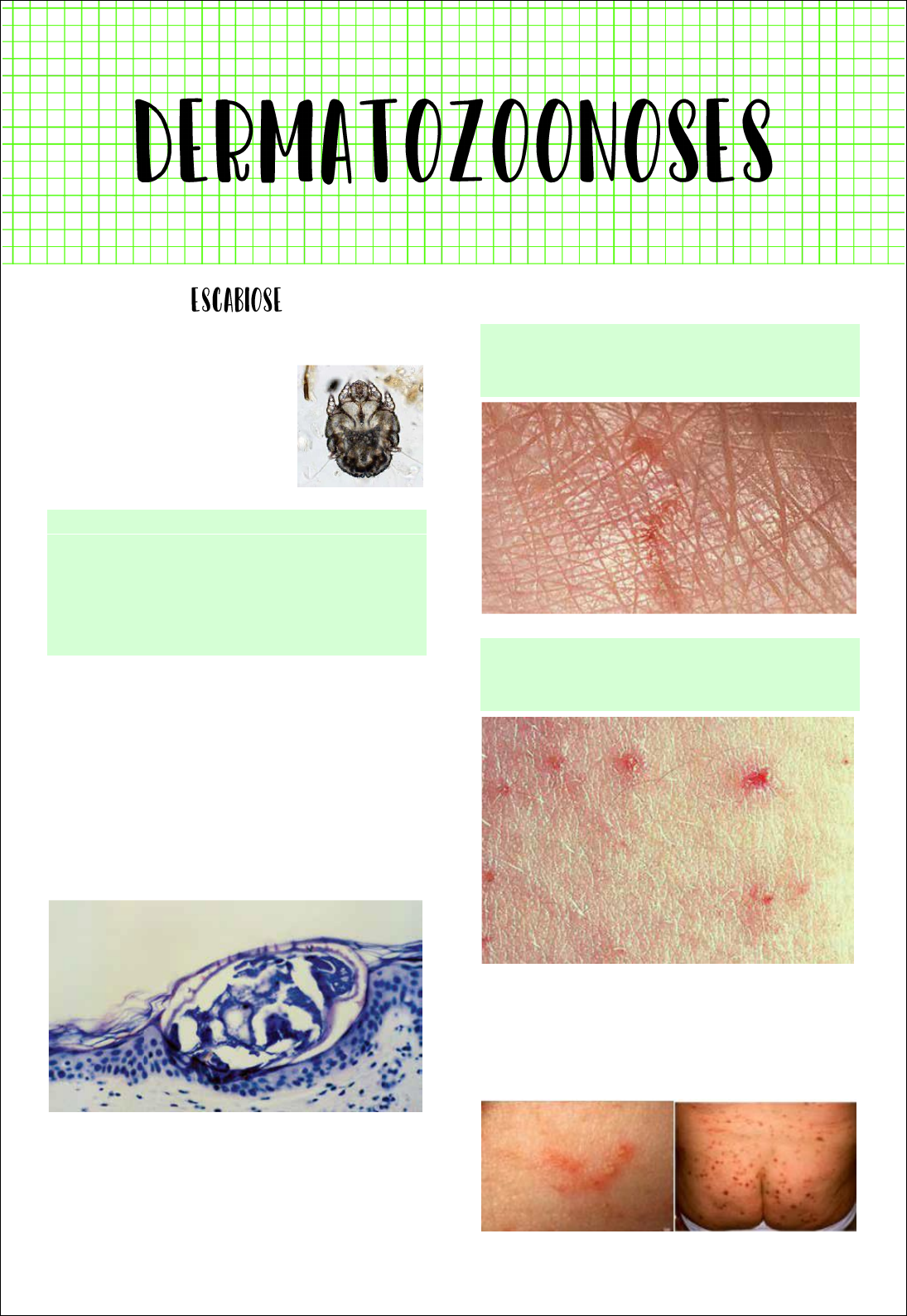 Brenda Gouveia Ramos Doença popularmente conhecida como sarna. Ácaro Sarcoptes scabei: são ectoparasitas que necessitam de um hospedeiro para se reproduzir. Ciclo biológico homem é de 15 dias. A fêmea fecundada penetra a pele através da camada córnea, ocorre escavação de túnel e geralmente a noite e deposita 2 a 3 ovos por dia, num período de 1-2 meses. O macho não penetra a pele, ele fecunda a fêmea ainda na superfície. Transmissão: contato direto, pode ser contato sexual e através de fômites (lençóis, toalhas, roupas). O parasite sobrevive apenas algumas horas fora da pele, portanto a forma de transmissão por roupas e etc é uma exceção. Doença muito pruriginosa, principalmente no período noturno por conta da deposição dos ovos. “O erro da histologia de escabiose é ela existir” o diagnóstico é clinico, não é necessária histologia. . Pequenas saliências lineares (sulco), com vésico-pápula perlácea em uma das extremidades. Devido ao prurido intenso, ocorrem escoriações que são porta de entrada para infecções secundárias, como Piodermites. Distribuição característica: Espaços interdigitais nas mãos, axilas, genitália e pés. São áreas mais quentes, com suor e duplamente cobertas por roupas. Brenda Gouveia Ramos HIV/SIDA: Clínica mais exuberante e disseminada, lesões com centenas de organismos. O período de incubação varia de 2 a 28 dias, se já houve contato, a resposta de hipersensibilidade leva menor tempo para ocorrer, é mais intensa. Formas atípicas: Higiene adequada Manifestações clínicas são mínimas, podem passar despercebidas e o parceiro não tem as mesmas queixas. RN e criança Face, couro cabeludo, região palmo-plantar Lesões eczematosas, urticadas, bolhosas. Idosos Menor resposta inflamatória; Lesões no tronco, prurido é o principal sintoma Confunde com prurido senil. Iatrogenia Uso de corticóides tópicos, sitemicos e anti histamincos = mascara as características da lesão. Sarna Nodular Lesões pápulo-nodulares, pruriginosas em região genital, inguinal e axilar, principalmente bolsa testicular. Permanecem após o tratamento. Ocorre por reação de sensibilidade aos produtos de degradação do parasita. Diagnostico Clinicamente sugerido por: prurido noturno, sintomas semelhantes em familiares, presença de sulcos e pela localização das lesões (mãos, axilas, genitália e pés). Exame direto – KOH. Por ter baixa sensibilidade, geralmente o diagnóstico se dá por prova terapêutica (Sintomas típicos). Tratamento Permetrina = loção ou creme 5% Loção a noite e no dia seguinte renovar após banho (10-12h); Repetir após 7 dias; Lavar pijamas e roupas de cama após uso da medicação; Pode ser usado em crianças, adultos, gestantes A família deve ser tratada para evitar recidiva. Ivermectina = 6mg por 30kg/peso Dose única. Repetir após 7 dias; Medicamento de escolha em caso de super- infecção e em situações que não é possível aplicar medicação de uso tópico – queimados, pênfigo, por exemplo. Brenda Gouveia Ramos Adultos e crianças > 5 anos. Imunocomprometidos devem tomar 2 doses. Prurido após tratamento: Corticoides tópicos e anti-histamínico. Nunca usar sabonetes escabicidas: provocam dermatite irritativa. Conhecida popularmente como “bicho geográfico”. Causada por Ancylostoma braziliensis: Parasita de cães e gatos, suas fezes contaminam o solo (terreno arenoso), as larvas infectantes penetram a pele. Contaminação: contato com solo contaminado com fezes de cães e gatos, geralmente praia, campo de futebol, parquinho. O parasita não tem capacidade de completar o ciclo biológico no intestino, causa lesão restrita à pele. Lesões lineares, salientes, eritematosas, “serpenginosas”, pode ter vesículas ou bolhas. Um lado é mais inflamatório (a cabeça), o outro lado é menos inflamatório. Muda a conformação ao longo do dia, o paciente irá relatar que a lesão está se deslocando. Brenda Gouveia Ramos Locais mais comuns: pés e mãos, pernas e nádegas (crianças). Diagnóstico essencialmente clínico pela manifestação típica. Dificuldade diagnóstica: super-infestação. Tratamento De acordo com a quantidade de lesões A partir de 2 lesões – tratamento sistêmico