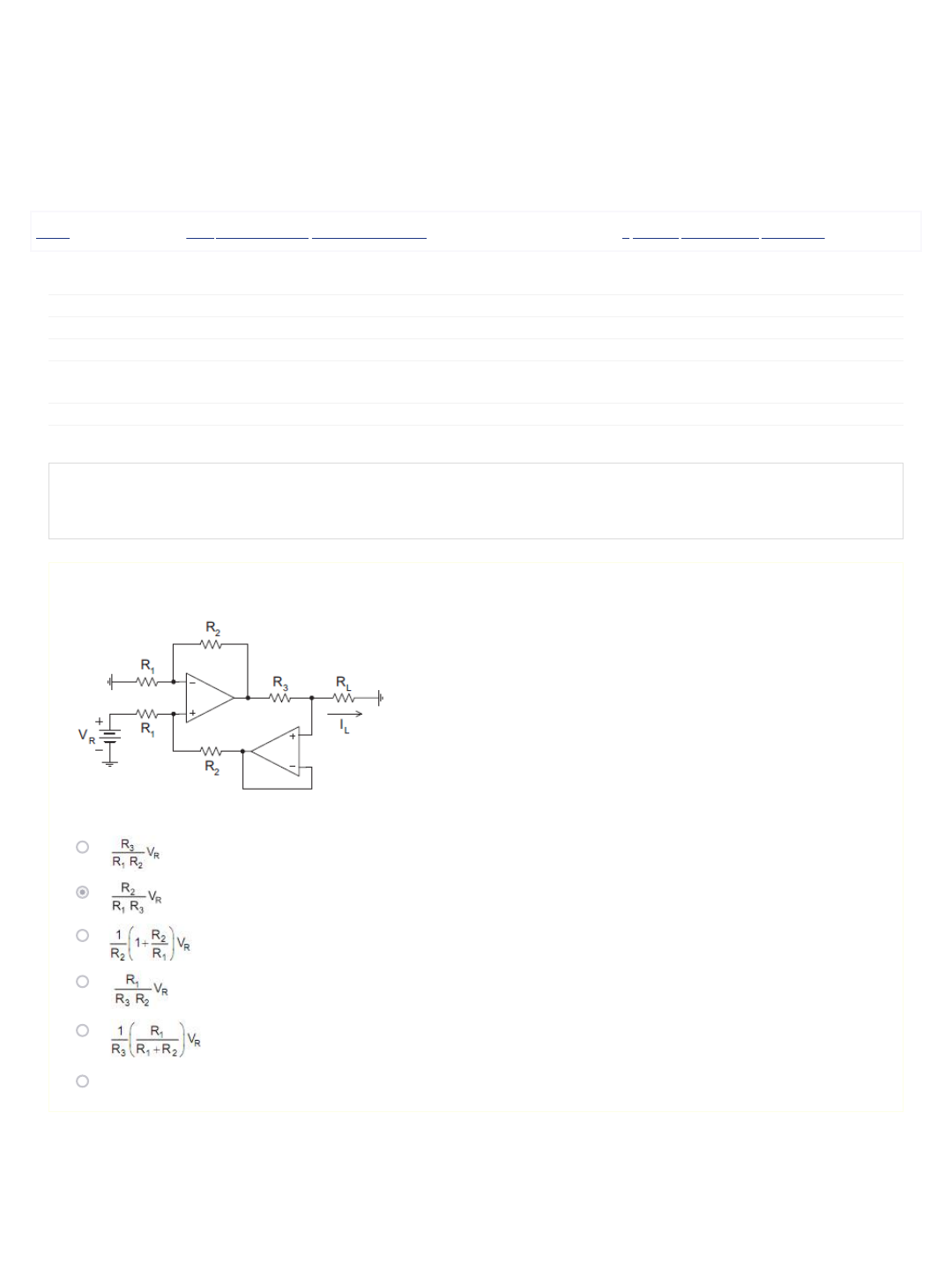 Painel / Meus cursos / 2021/2 - Eletrônica Aplicada - G480-0005 / 1 dezembro - 7 dezembro / Q03 - Amplificadores Operacionais Iniciado em quarta, 8 Dez 2021, 12:36 Estado Finalizada Concluída em quarta, 8 Dez 2021, 12:46 Tempo empregado 9 minutos 25 segundos Notas 7,0/8,0 Avaliar 8,8 de um máximo de 10,0(88%) Questão 1 Correto Atingiu 1,0 de 1,0 O circuito da figura tem por objetivo produzir uma corrente I que independa do valor da resistência de carga R . Considerando-se os amplificadores operacionais ideais, a expressão para a corrente I é: a. b. c. d. e. f. Nenhuma das alternativas. L L L Q03 - Amplificadores Operacionais: Revisão da tentativa https://graduacao.ftec.com.br/mod/quiz/review.php?attempt=353907&c... 1 of 5 08/12/2021 12:46 https://graduacao.ftec.com.br/course/view.php?id=10242 https://graduacao.ftec.com.br/course/view.php?id=10242 https://graduacao.ftec.com.br/my/ https://graduacao.ftec.com.br/my/ https://graduacao.ftec.com.br/course/view.php?id=10242 https://graduacao.ftec.com.br/course/view.php?id=10242 https://graduacao.ftec.com.br/mod/quiz/view.php?id=675920 https://graduacao.ftec.com.br/mod/quiz/view.php?id=675920 Questão 2 Correto Atingiu 1,0 de 1,0 Questão 3 Correto Atingiu 1,0 de 1,0 No circuito de amplificadores operacionais a seguir, qual é o valor da tensão de saída V se e = e = e = 1 V? a. 3 V b. 0,5 V c. Nenhuma das alternativas. d. 1 V e. 2 V f. 2,5 V 2 a b c Amplificadores operacionais são dispositivos eletrônicos versáteis e utilizados em uma infinidade de aplicações. A figura mostra um amplificador não-inversor. Sendo a tensão Vin = 12 V, R1 = 60 Ω e R2 = 120 Ω, assinale a alternativa CORRETA com o valor de Vout. a. -24 V b. Nenhuma das alternativas c. 18 V d. 36 V e. 15 V Q03 - Amplificadores Operacionais: Revisão da tentativa https://graduacao.ftec.com.br/mod/quiz/review.php?attempt=353907&c... 2 of 5 08/12/2021 12:46 Questão 4 Correto Atingiu 1,0 de 1,0 Questão 5 Correto Atingiu 1,0 de 1,0 Os circuitos I e II da Figura representam duas aplicações práticas usando-se amplificadores operacionais. Quais são, respectivamente, essas aplicações? a. Diferenciador e Integrador b. Integrador e Diferenciador c. Integrador e Amplificador inversor d. Integrador e Amplificador logaritmo e. Nenhuma das alternativas. f. Diferenciador e Amplificador não inversor Os amplificadores operacionais apresentam importantes características, dentre as quais se destaca a seguinte: a. O ganho de tensão de malha aberta é extremamente menor do que o ganho de malha fechada, podendo ser zero. b. A impedância de entrada é muito baixa, podendo diminuir ainda mais se for usado em sua entrada um transistor de efeito de campo (FET). c. A impedância de saída é muito alta, podendo, no entanto, diminuir se um transistor de efeito de campo (FET) for usado em sua saída. d. Os ganhos de tensão de malha aberta e os de malha fechada são sempre iguais, independentemente do circuito de realimentação externo ao amplificador. e. A impedância de entrada é alta, podendo aumentar muito mais se um transistor de efeito de campo (FET) for usado em sua entrada. f. Nenhuma das alternativas. Q03 - Amplificadores Operacionais: Revisão da tentativa https://graduacao.ftec.com.br/mod/quiz/review.php?attempt=353907&c... 3 of 5 08/12/2021 12:46 Questão 6 Correto Atingiu 1,0 de 1,0 Dado o circuito com amplificadores operacionais apresentado, quando a tensão do sinal de entrada for Vin = - 50 mV, a saída Vout corresponderá a a. 50 V b. 2,5 V c. 5 V d. Nenhuma das alternativas. e. 0,5 V f. 2,0 V Q03 - Amplificadores Operacionais: Revisão da tentativa https://graduacao.ftec.com.br/mod/quiz/review.php?attempt=353907&c... 4 of 5 08/12/2021 12:46 Questão 7 Correto Atingiu 1,0 de 1,0 Questão 8 Incorreto Atingiu 0,0 de 1,0 Considerando o circuito com amplificadores operacionais abaixo e sabendo que os amplificadores estão devidamente alimentados com tensões simétricas, determine o valor da saída do circuito baseado na tensão de VCC. a. -Vcc/4 b. Vcc/2 c. Vcc/4 d. -Vcc/2 e. Nenhuma das alternativas f. -Vcc A figura mostra um circuito amplificador de tensão, com entrada v e saída v . Considerando que todos os componentes utilizados no circuito sejam ideais e que os amplificadores operacionais estejam sempre fora da região de saturação, julgue o item que se segue. O módulo do ganho total do amplificador é igual a 6. Escolha uma opção: Verdadeiro Falso i o Q03 - Amplificadores Operacionais: Revisão da tentativa https://graduacao.ftec.com.br/mod/quiz/review.php?attempt=353907&c... 5 of 5 08/12/2021 12:46