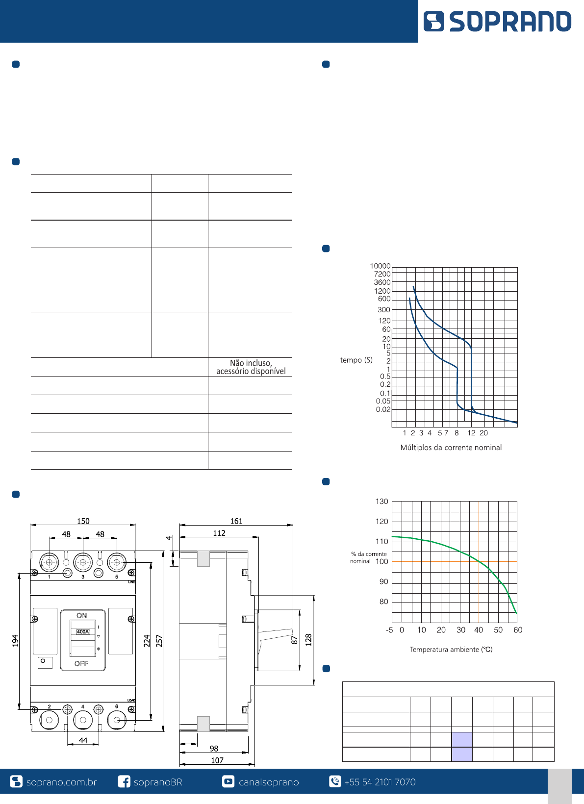 Ficha Técnica - Linha DL400-H - Disjuntor em Caixa Moldada NBR IEC 60947-2 Códigos e Descrição do Produto Dados Técnicos Curva de Atuação Dimensões do Produto 05105.3300.31 Disjuntor DL400-H - 300A 05105.3315.31 Disjuntor DL400-H - 315A 05105.3350.31 Disjuntor DL400-H - 350A 05105.3400.31 Disjuntor DL400-H - 400A Tensão de Isolamento - Ui Disparador de Sobrecorrente Capacidade de Interrupção em Serviço - Ics Largura Máxima do Barramento Conectores p/ Cabos Barramentos Auxiliares Barreiras Isolantes entre Fases Parafusos de Fixação - Disjuntor Parafusos de Barramento - Disjuntor Embalagem Individual (CxLxA) Capacidade Máxima de Interrupção - Icu (kA) Corrente Nominal - In 800 50 30 Não disponível Incluso M6 x 75mm M10 x 30mm 285x180x165mm Fixo 300, 315, 350, 400 225, 250, 275, Vca %Icu mm 220/230Vca 380/415Vca 440Vca 660/690Vca 85 50 45 12 Térmico Magnético A 1 Versão 12/02/2019 Tabela de Compensação de Temperatura Temperatura Temperatura 225~400 (A) 225~400 (A) 0°C 1,12 -5°C 1,13 5°C 1,12 10°C 1,11 15°C 1,10 20°C 1,08 25°C 1,06 30°C 1,05 35°C 1,03 40°C 1 45°C 0,97 50°C 0,93 55°C 0,85 60°C 0,75 Compensação de Temperatura Curva de Compensação de Temperatura 3 38 05105.3275.31 Disjuntor DL400-H - 275A 05105.3250.31 Disjuntor DL400-H - 250A 05105.3225.31 Disjuntor DL400-H - 225A Acessórios Disponíveis 05150.0021.01- 05150.0021.03-Contato Alarme (1NA+1NF) 05151.0031.02-Bobina de Disparo a Distância 220Vca 05151.0031.04-Bobina de Disparo a Distância 24Vca 05151.0041.02-Bobina de Mínima 220Vca 05151.0041.04-Bobina de Mínima 24Vca 05152.0025.02-Comando Motorizado 220Vca 05154.0036.01-Alavanca Rotativa p/ Painéis c/ Prolongador 05053.0030.11-Bloqueio Manípulo com Cadeado 05055.0400.01-Conjunto Conector 1x240mm² 05055.0400.02-Conjunto Conector 2x120mm² Contato Auxiliar (2NA+2NF)