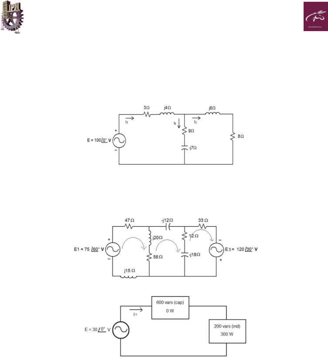 Circuitos Eléctricos Avanzados 1MV7 2do Examen Parcial Dr. Juan Manuel Peza Tapia 1 INSTITUTO POLITÉCNICO NACIONAL UNIDAD PROFESIONAL INTERDISCIPLINARIA EN INGENIERÍA Y DE TECNOLOGIAS AVANZADAS Resolver los siguientes 4 problemas mostrando las evidencias de operaciones y resultados de los mismos. En formato PDF, Word. Todas las evidencias deberán tener nombre del alumno y fecha. La duración del examen será de 90 minutos. 1) Para el circuito siguiente: Calcúlese la impedancia total ZT, el valor de IT, el factor de potencia total, el valor de I1 e I2, calcúlese la potencia activa, reactiva y aparente que se suministra al circuito y dibuje el circuito equivalente en serie en lo que se refiere a la impedancia total e IT. 2) Determine las ecuaciones matriciales de mallas para el siguiente circuito en forma polar y calcule las corrientes de malla. 3) Para el sistema de la siguiente figura: a) Encuentre el total de Watts, Vars, VA y Factor de Potencia indique si es adelantado o atrasado b) Encuentre la corriente total IT c) Trace el triángulo de potencia total d) Determine los valores típicos y su impedancia en ohms, dentro de cada caja eléctrica (Supóngase que todos los elementos están en serie dentro de las cajas) Circuitos Eléctricos Avanzados 1MV7 2do Examen Parcial Dr. Juan Manuel Peza Tapia 2 4) Determinar los valores de R y XL del siguiente circuito, sabiendo que el valor eficaz de la intensidad de corriente total que alimenta al circuito es de 29.9 A, el de la corriente que circula por la resistencia es de 15Ω es de 8 A y la magnitud de corriente que circula por la rama RL es de 22.3 A.