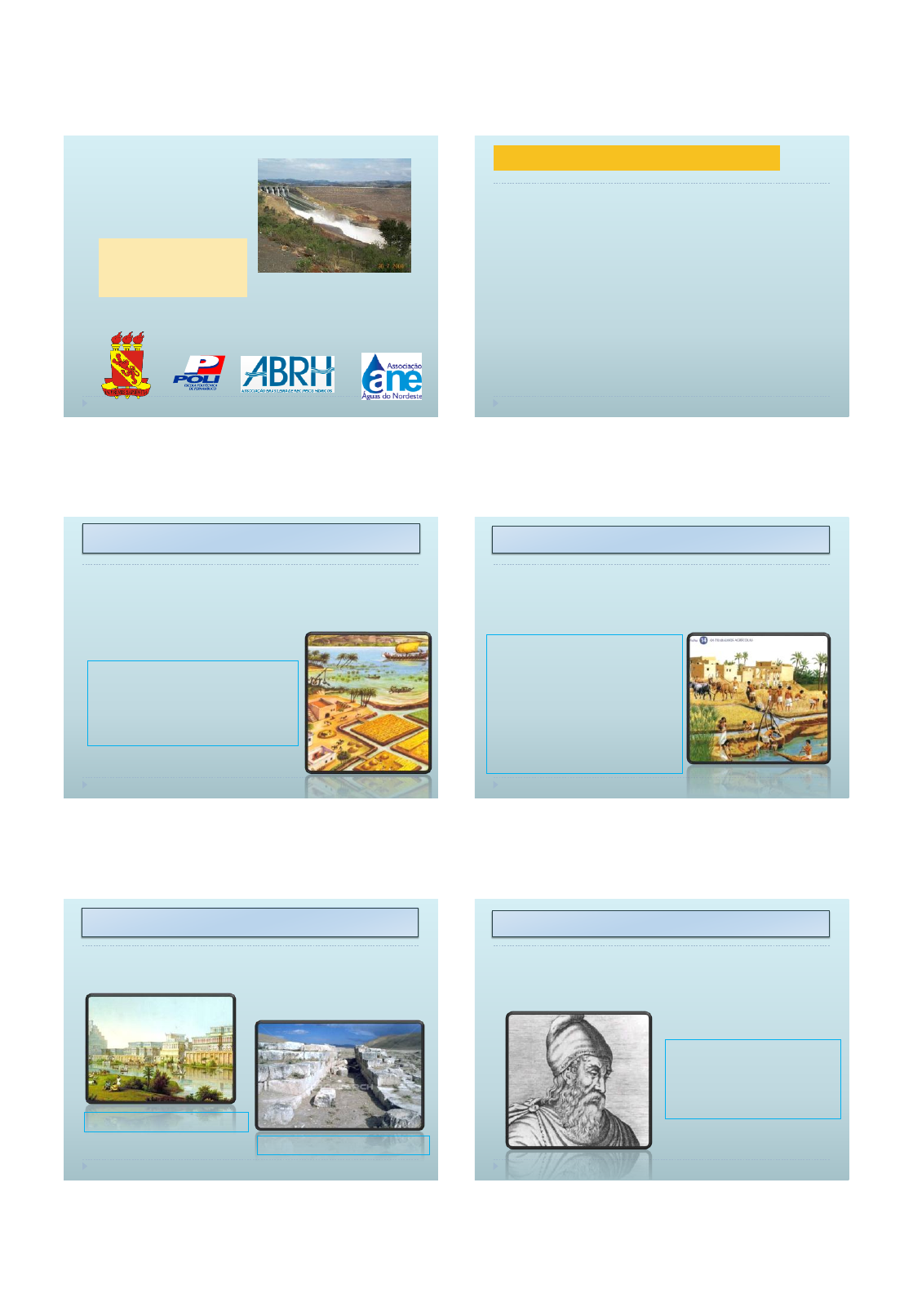 08/09/2020 1 Evolução da Hidráulica Jaime Cabral Pontos importantes para lembrar - A água é muito importante para o engenheiro civil - Todo engenheiro precisa saber transformar unidades - Em engenharia trabalha-se com medições. Toda medição contém imprecisões. Relembrar o estudo de algarismos significativos para não aumentar a propagação de erros. - A disciplina de Hidráulica é importante para disciplinas mais a frente do curso como Hidrologia, Saneamento 1, Saneamento 2, Drenagem Urbana (eletiva). Mesopotâmia e Babilônia Obras hidráulicas de certa importância remontam a antiguidade. Nipur (Babilônia), existiam coletores de esgotos desde 3750 a.C Mesopotâmia - canais de irrigação construídos na planície situada entre os rios Tigre e Eufrates obras de irrigação, construção do lago artificial Méris destinado a regularizar as águas do baixo Nilo. Egito Cheias de julho a novembro - as águas do rio eram canalizadas nas épocas de vazante e irrigavam as plantações que ficavam até cerca de 20km de distância. Aqueduto Jerwan - primeiro sistema público de abastecimento de água de que se tem notícia. Assíria, 691 a.c. Ruínas do aqueduto Jerwan. Aqueduto Jerwan, 691 a.C. Princípios de hidrostática - “Tratado sobre Corpos Flutuantes”, 250 a.C. arquimedes Arquimedes (?287 a.C. – ?212 a.C.) Famoso engenheiro e cientista da Antigüidade. 1 2 3 4 5 6 08/09/2020 2 Bomba de Pistão Bomba de Ctesibus, Grécia, 200 a.C. Azevedo, 2009 Grandes aquedutos romanos foram construídos em várias partes do mundo a partir de 312 a.C. aquedutos Romanos Pont-du-Gard. Aqueduto romano, século 1 a.C, França. No século XVI - projetos de chafarizes e fontes monumentais, tão em moda na Itália. Leonardo da Vinci apercebeu-se da importância das observações neste setor. Tratado publicado em 1586 por Stevin, Contribuições de Galileu, Torricelli e Daniel Bernoulli constituíram a base para o novo ramo científico. Século XVI - Itália Leonardo Da Vinci Leonardo Da Vinci Engenheiro, Físico, Pintor 1452 - 1519 Para trabalhar com água, consulta primeiro a experiência e depois a razão Simão Stevin Simão Stevin 1548 - 1620 -Teorema de Stevin Hidrostática P2 = P1 + r.g.h Galileu Galileu Galilei 1564 - 1642 • Mecânica e Mecânica dos fluidos •Lei de queda dos corpos • Teoria heliocêntrica • Matematização da física • Precursor do método científico 7 8 9 10 11 12 08/09/2020 3 Torricelli Evangelista Torricelli 1608 - 1647 P atm = 760 mm Hg Bernoulli Daniel Bernoulli 1700 - 1783 Z + P/r.g + v2/2g = constante Primeiras equações gerais para os movimentos dos fluídos. Hidrodinâmica teórica: estuda os fluídos perfeitos. Hidráulica empírica: cada problema era investigado isoladamente. Euler Leornado Euler (1707-1783). A hidráulica sempre constituiu fértil campo para investigações e análises matemáticas, tendo dado lugar a estudos teóricos que freqüentemente se afastavam dos resultados experimentais. Várias expressões assim deduzidas tiveram de ser corrigidas por coeficientes práticos, o que contribuiu para que a hidráulica fosse cognominada a “Ciência dos coeficientes”. Coeficientes de correção - hidráulica (Azevedo NETTO, 1998). - Século XIX - desenvolvimento da produção de tubos de ferro fundido, capazes de resistir a pressões internas relativamente elevadas. - Crescimento das cidades e a importância cada vez maior dos serviços de abastecimento de água. - Emprego de novas maquinas hidráulicas: um progresso rápido e acentuado (Azevedo NETTO, 1998). Século XIX - Progresso da hidráulica Investigações de Reynolds, Re = r.v.D / m Escoamento laminar Escoamento turbulento Re < 2000 => laminar Re > 4000 => turbulento Século XIX e a hidráulica Osborne Reynolds 1842 - 1912 13 14 15 16 17 18 08/09/2020 4 Número de Froude F < 1 – Fluvial (subcrítico) F = 1 – Crítico F > 1 –Torrencial (supercrítico) Século XIX e a hidráulica William Froude 1810 - 1879 Trabalhos de investigações de Prandtl Camada limite Século XIX e a hidráulica Ludwig Prandtl 1875 - 1953 As usinas hidrelétricas começaram a ser construídas no final do século XIX. Primeira no Brasil: usina Marmelos (Juiz de Fora (MG) 1889 Primeira no nordeste: Angiquinhos - Delmiro Gouveia, Rio S Francisco Hidrelétricas Delmiro Gouveia, 1913 Hidrelétrica Delmiro Gouveia Para construir Angiquinho, Delmiro Gouveia foi à Europa adquirir o maquinário necessário, e acabou por contratar um engenheiro italiano, Luigi Borella, para projetar a empreitada. Também contratou engenheiros e técnicos franceses para montar a Usina. Aos laboratórios de hidráulica devem ser atribuídas as investigações mais recentes. Atualmente: Tecnologia de hidrelétricas bem desenvolvida Hidrelétricas Itaipu, binacional Quadro de eventos históricos no Brasil Eventos Ano Cidade Primeiro sistema de abastecimento de água 1723 Rio de Janeiro - RJ Primeira cidade com rede de esgotos 1864 Rio de Janeiro – RJ Primeira hidrelétrica (para mineração) 1883 Diamantina – MG Primeira hidrelétrica (para abastecimento público) 1889 Juiz de Fora - MG Fonte: Manual de Hidráulica. NETTO , 1998. 19 20 21 22 23 24 08/09/2020 5 Aquisição de dados Armazenamento de dados Processamento de dados - abrevia cálculos e melhora a precisão Contribuição para solução de problemas técnico- econômicos para projeto e implantação de obras hidráulicas. Hidráulica Computacional Século XX & Século XXI Canal da Transposição 400 km de canal (dois eixos) 25 m3/s Podendo chegar até a 75 m3/s Ramal do Agreste Vazão de 8 mil litros por segundo Adutora do Agreste - abastecerá mais de 70 cidades, garantindo água de qualidade para cerca de 2,2 milhões de habitantes do sertão e do agreste do estado. Barragem Serro Azul - 1 km de extensão do paredão da barragem - 73 metros de altura - 903 hectares de área inundada - 560 litros / segundo - Água - 10 municípios do Agreste ESTAÇÃO ELEVATÓRIA