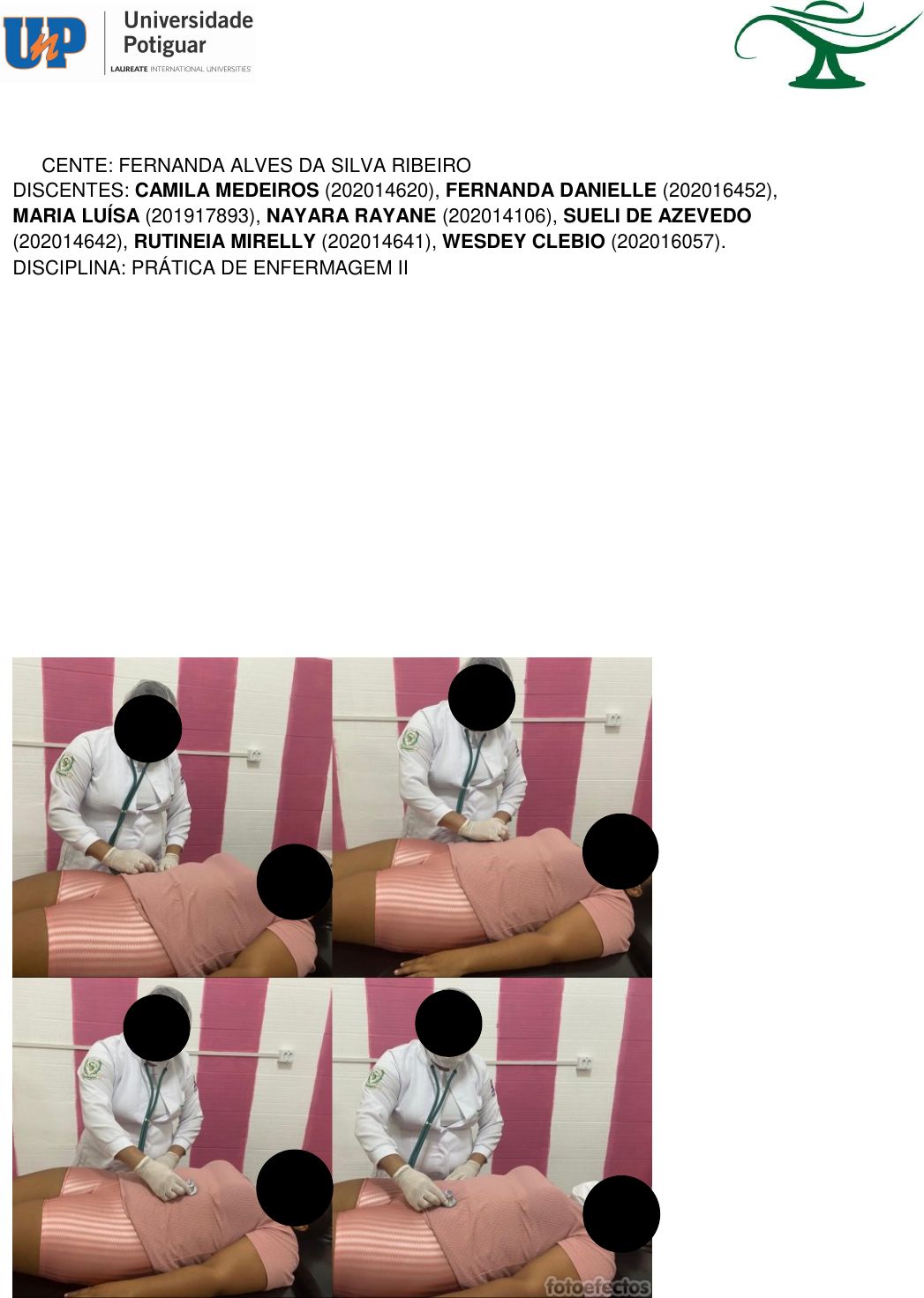 UNIVERSIDADE POTIGUAR CURSO DE GRADUAÇÃO EM ENFERMAGEM DOCENTE: FERNANDA ALVES DA SILVA RIBEIRO DISCENTES: CAMILA MEDEIROS (202014620), FERNANDA DANIELLE (202016452), MARIA LUÍSA (201917893), NAYARA RAYANE (202014106), SUELI DE AZEVEDO (202014642), RUTINEIA MIRELLY (202014641), WESDEY CLEBIO (202016057). DISCIPLINA: PRÁTICA DE ENFERMAGEM II ATIVIDADE AVALIATIVA Exame Físico do Sistema GastroIntestinal 1. PROPEDÊUTICA AUSCULTA: Iniciar a ausculta abdominal pelo quadrante inferior direito (QID), aplicando uma leve pressão e identificar a presença e a qualidade dos ruídos hidroaéreos. Podem ser necessários até cinco minutos de ausculta contínua antes de determinar a ausência de ruídos intestinais. Realizar ausculta para o exame físico do sistema digestório em paciente sem alteração. mariadino Retângulo mariadino Lápis 2. PROPEDÊUTICA PERCUSSÃO: Realizar a palpação superficial e profunda para determinar tamanho, forma, posição e sensibilidade da maioria dos órgãos, além da identificação de massas e acúmulo de fluídos. - Deve-se iniciar pelo QID e todos devem ser palpados. Realizar percussão para o exame físico do sistema digestório em paciente sem alteração. 3. PROPEDÊUTICA PALPAÇÃO: 3.1. PALPAÇÃO PROFUNDA COM A MÃO ESPALMADA Pede-se que o paciente respire pela boca, com a mandíbula entreaberta, a parede abdominal é deprimida em profundidade (aproximadamente 05 cm) a cada expiração. Procura-se tamanho, forma, consistência, localização, sensibilidade, mobilidade e pulsação de órgãos ou massas. Realizar a propedêutica da palpação para o exame físico do sistema digestório em paciente sem alteração. 3.2. PALPAÇÃO PROFUNDA TÉCNICA BIMANUAL Com a uma mão espalmada e outra mão sobreposta. Uma das mãos, em contato com a parede abdominal, percebe os achados, enquanto a outra que a cobre exerce a pressão. 4. EXAMINAR O FÍGADO: TÉCNICA BIMANUAL O examinador à direita do paciente, com a mão esquerda sob o tórax posterior direito do paciente, na altura da 11º e 12º costelas. A mão direita colocada sobre o abdome, com os dedos estendidos apontando para a cabeça e com as pontas dos dedos tocando a linha hemiclavicular, logo abaixo do rebordo costal direito. A mão direita exerce compressão para dentro e para frente, enquanto a mão esquerda pressiona o tórax poster. O fígado normal é palpável, durante a inspiração, cerca de 03 cm abaixo do rebordo costal à direita na linha hemiclavilar. 5. REALIZAR OS PROCEDIMENTOS ESPECIAIS: SINAIS DE DESCOMPRESSÃO BRUSCA E DOLOROSA Aplica-se com os dedos uma compressão lenta e profunda no abdome para, então, subitamente suspender a mão, soltando a parede do abdome. A descompressão pode ser acompanhada de dor intensa, aguda, descrita como lancinante ou em facada. 6. SINAL DE ROSVING: Palpação profunda e contínua do Quadrante Inferior Esquerdo (QIE) que produz dor intensa no Quadrante Inferior Direito (QID), mais especificamente na fossa ilíaca direita, também como sinal de apendicitie aguda.