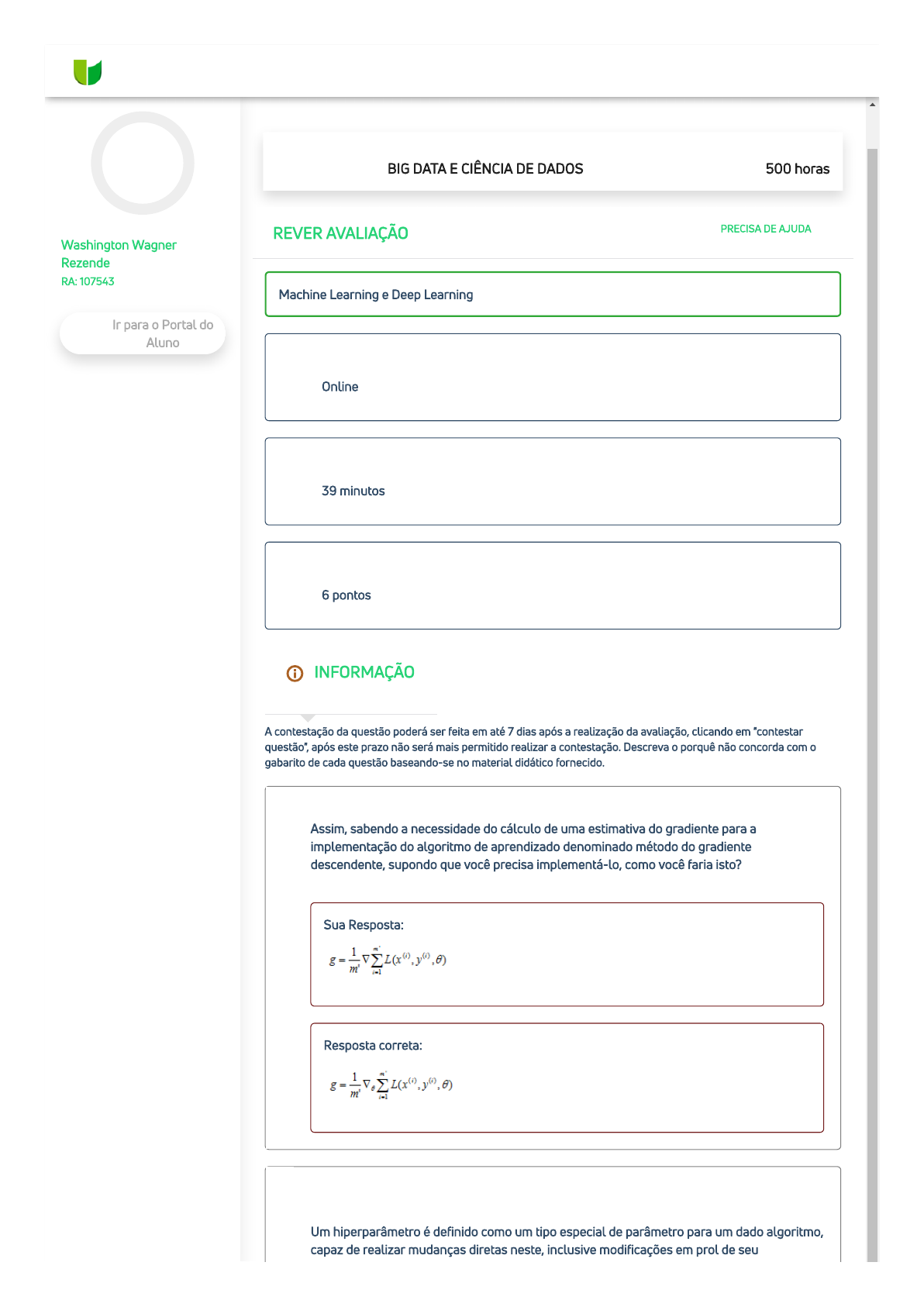 03/12/2021 22:32 Rever Avaliação https://ava.institutoprominas.com.br/notas/rever-avaliacao 1/2 Pós-Graduação Curso BIG DATA E CIÊNCIA DE DADOS Carga Horária 500 horas REVER AVALIAÇÃO PRECISA DE AJUDA Machine Learning e Deep Learning Tipo de avaliação: Online Tempo utilizado: 39 minutos Sua nota de avaliação 6 pontos A contestação da questão poderá ser feita em até 7 dias após a realização da avaliação, clicando em "contestar questão", após este prazo não será mais permitido realizar a contestação. Descreva o porquê não concorda com o gabarito de cada questão baseando-se no material didático fornecido. 1 Assim, sabendo a necessidade do cálculo de uma estimativa do gradiente para a implementação do algoritmo de aprendizado denominado método do gradiente descendente, supondo que você precisa implementá-lo, como você faria isto? Sua Resposta: Resposta correta: Um hiperparâmetro é definido como um tipo especial de parâmetro para um dado algoritmo, capaz de realizar mudanças diretas neste, inclusive modificações em prol de seu INFORMAÇÃO Contestar questão Ir para o Portal doAluno Washington Wagner Rezende RA: 107543 Início Avaliações TCC Material Didático Notas Agenda Educacional Simulados Curso Preparatório Sala de Estudos https://ava.institutoprominas.com.br/dashboard https://ava.institutoprominas.com.br/notas https://alunos.institutoprominas.com.br/ https://ava.institutoprominas.com.br/dashboard https://ava.institutoprominas.com.br/atividades javascript:; https://ava.institutoprominas.com.br/material-didatico https://ava.institutoprominas.com.br/notas https://ava.institutoprominas.com.br/agenda-educacional https://ava.institutoprominas.com.br/simulados https://ava.institutoprominas.com.br/preparatorio https://ava.institutoprominas.com.br/sala-de-estudos https://ava.institutoprominas.com.br/ 03/12/2021 22:32 Rever Avaliação https://ava.institutoprominas.com.br/notas/rever-avaliacao 2/2 2 funcionamento e pode ser baseado em informações importantes acerca do problema real. Além disso, sabe-se com relação aos hiperparâmetros que: Sua Resposta: A maior parte dos algoritmos de aprendizado de máquina possui hiperparâmetros. Resposta correta: A maior parte dos algoritmos de aprendizado de máquina possui hiperparâmetros. 3 O método do gradiente descendente fundamenta-se em premissas como a estimação do gradiente, considerando-se pequenas amostras de um lote maior. Por outro lado, quando analisa-se o gradiente estocástico estima-se a seguinte relação com a taxa de aprendizado , ou seja: Sua Resposta: A diferença dos dados com a taxa de aprendizado tendem a ser os próprios dados. Resposta correta: A diferença dos dados com a taxa de aprendizado e o gradiente tendem a ser os próprios dados. 4 A capacidade dentro da aprendizagem do algoritmo, dentro da área de Machine Learning, pode estar associada a uma série de fatores. O estabelecimento do cenário é um exemplo, mas também podem ser apontadas características físicas como: Sua Resposta: A capacidade do computador Resposta correta: A capacidade do computador 5 Tanto a distribuição de Bernoulli, como a distribuição de Gauss, servem como parâmetros nas análises estatísticas dos dados, considerando-se os estimadores. Assim, um exemplo válido de estimador baseado nas médias é visto em: Sua Resposta: Contestar questão