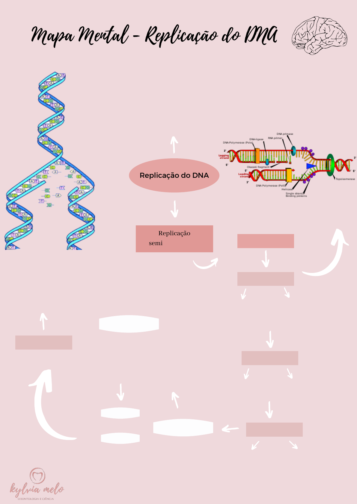 Mapa Mental - Replicação do DNA Replicação do DNA Replicação semiconservativa Processo pelo qual são formadas duas novas fitas de DNA, a partir da fita original, em que uma das fitas é recém-formada e a outra é mantida a partir do DNA molde. Processo de replicação Formação da forquilha de replicação (formado pela interação entre o complexo proteíco - DNA polimerase, ligase, helicase, primase etc., e as origens) a partir das forquilhas, os complexos proteícos partem em sentidos opostos . Cada bolha é responsável pela polimerização de uma parte do DNA chmada de replicon. Separação das fitas de DNA a dupla fita é desnaturada pela enzima DNA helicase as enzimas DNA girase rompem as ligações fosfodiéster e permitem o giro das fitas, deixando-as aptas para a replicação Iniciação da replicação para iniciar o processo é necessário que uma molécula iniciadora se ligue a porção 5,́ essa molécula é o RNA primase, que vai sintetizar um primer para sinalizar o local onde a replicação inicia. Posteriormente os primers são removidos e substituídos por outros nucleotídeos através da DNA polimerase I a partir da ligação do primer vem outra enzima que é responsável pela construção da nova fita, a DNA polimerase III Fita líder Fita retardada construída de maneira continua é construída em fragmentos (fragmentos de okazaky), necessitando assim de vários primers em diferentes porções da fita a construção da nova fita será sempre no sentido 5 ́ para 3´ AS FITAS APRESENTAM ANTIPARALELISMO a orientação antiparalela da cadeia dupla e a incapacidade das enzimas em polimerizar no sentido 3´̀ para 5, faz com que uma das novas fitas ocorra normalmente de forma contínua, pois segue no sentido 5 ́para 3 e não precisa de mais de um iniciador; Enquanto que na outra fita 3 para 5 será sintetizada a partir de pedaços descontínuos (fragmentos de Okazaki) Finalização e ligase Para finalização do processo, a enzima DNA ligase fará a união dos fragmentos de Okazaki aos nucletídeos recém-adicionados através de ligações fosfodiéster. O filamento contínuo possui apenas um primer que também será substiuído pela DNA polimerase @kylviameloodontologia
