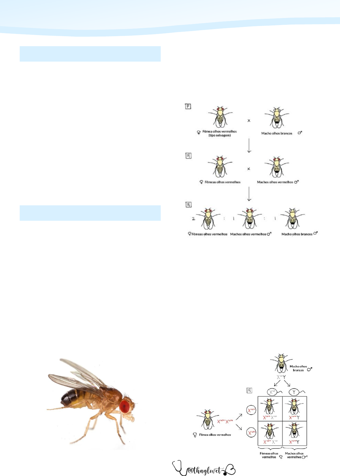 O que é? ↪A teoria cromossômica da herança afirma que os genes são encontrados em locais específicos nos cromossomos, e que o comportamento destes cromossomos durante a meiose pode explicar as leis propostas por Mendel; ↪ A teoria foi firmada por Walter Sutton e Theodor Boveri e confirmada pelo geneticista Thomas Hunt Morgan; ↪ Segundo a teoria, assim como os genes, os cromossomos vêm em pares homólogos, onde um membro do par é herdado da mãe e o outro do pai; ↪Vale ressaltar que esses pares homólogos são separados durante a meiose, de forma que cada óvulo ou espermatozoide receba apenas um membro. T.H. Morgan ↪Os estudos genéticos de Morgan foram realizados na mosca de fruta, Drosophila melanogaster, já que são animais baratos, fáceis e de rápido crescimento; ↪Os experimentos iniciaram quando Morgan descobriu uma mutação em um gene que determinava a cor do olho da mosca, tornando-os brancos, em vez de vermelhos; ↪ Ele descobriu que o gene da cor do olho é herdado em padrões diferentes para machos e fêmeas, ou seja, um padrão de herança ligada ao sexo; Experimento ↪A primeira mosca de olho branco encontrada era macho e quando esta mosca foi cruzada com uma fêmea normal de olhos vermelhos, a F1 foi 100% de olhos vermelhos, mostrando que o alelo branco era recessivo; ↪Entretanto, quando as moscas foram cruzadas umas com as outras todas as moscas fêmeas tinham olhos vermelhos, enquanto cerca da metade das moscas macho tinham olhos brancos, o que mostrou que as moscas machos e fêmeas estavam herdando a característica em padrões diferentes; ↪ Enquanto as moscas fêmeas possuem um genótipo XX e as moscas machos têm um genótipo XY, colocando esses dados no quadro de Punnett temos: Teoria cromossômica da herança ↪Onde: Xw+ é equivalente à olhos vermelhos e Xw à olhos brancos. ↪ Como na F1 todas as moscas tinham olhos vermelhos independentemente do seu gênero, a prova real de que os olhos brancos eram uma herança genética só apareceu para Morgan na geração F2: ↪Na F2 é onde o X faz a diferença. No quadro de Punnett com o gene da cor do olho nos cromossomos X corretamente prevê que todas as moscas fêmeas terão olhos vermelhos, enquanto metade das moscas macho terão olhos brancos. As moscas macho têm seu único cromossomo X de sua mãe, que é heterozigota, levando à divisão meio a meio dos fenótipos; ↪Morgan realizou vários outros experimentos antes de confirmar a localização do cromossomo X para o gene da cor dos olhos, chegando a conclusão de que o gene deve estar extremamente associado ao cromossomo X ; 7,9; ↪ Vale ressaltar que ele também encontrou mutações em outros genes, que não eram ligados ao sexo. Linkage ↪É quando um gene está em linkage ou ligação gênica quando ele está em um mesmo cromossomo e não se segrega de forma independente no momento da formação de um gameta; ↪Os cromossomos são formados por uma grande sequência de genes que é responsável por determinar as características de uma espécie. Quando ocorre a formação de gametas, os cromossomos são inteiramente transmitidos para essas células juntamente aos genes que os constituem; ↪Segundo a Segunda Lei de Mendel, os genes, durante a formação dos gametas, segregam-se independentemente. Entretanto, para que isso ocorra, é necessário que os genes em questão estejam em pares de cromossomos homólogos diferentes. Quando os genes estão localizados em um mesmo cromossomo, essa segregação não acontece e todos são transmitidos durante a meiose. Esse fenômeno recebe o nome de linkage, ligamento fatorial ou ligação gênica. ↪Os genes A e B estão presentes em um cromossomo, enquanto o a e b estão no seu homólogo. Os genes A e B migrarão juntos na formação dos gametas, assim como a e b. Nesse caso, teremos, portanto, um gameta AB e outro ab. ↪Percebe-se que a migração independente ocorre apenas quando os pares de genes estão em cromossomos diferentes. Quando esses genes estão no mesmo cromossomo de um par de homólogos, eles permanecem juntos quando acontece a meiose. Sendo assim, dizemos que o linkage é uma exceção à Segunda Lei de Mendel. https://mundoeducacao.uol.com.br/biologia/segunda-lei-mendel.htm https://mundoeducacao.uol.com.br/biologia/meiose.htm ↪Genes localizados em um mesmo cromossomo podem, no entanto, não ser transmitidos juntos no momento da meiose. Para que isso aconteça, é necessário que durante esse processo de divisão ocorra uma recombinação gênica, também chamada de permuta ou crossing-over. ↪Quanto maior a distância entre os genes, maior a quantidade de gametas recombinantes (originado do crossing-over): Tx. de rec = dist. entre genes. FR = nº de recombinantes Total de descendentes do cruzamento teste ↪Recombinantes < 50% ↪Existem duas formas de os alelos estarem arranjados em um indivíduo duplo-heterozigoto (AaBb) com pares de genes em linkage: ↪ Arranjo cis: Em um cromossomo existe apenas alelos dominantes (AB), enquanto no outro encontramos alelos recessivos (ab). ↪ Arranjo trans: Em cada cromossomo homólogo encontramos um alelo dominante e outro recessivo (Ab/Bb). Mapas genéticos ↪Os mapas genéticos ou mapas de cromossomos de uma espécie são representações das posições e das distâncias relativas do lócus gênico ou marcadores genéticos, ou seja, a região ocupada por um gene ao longo da molécula cromossômica, transmissora das características hereditárias. ↪Halldame (h): h= -1n (1- 2r) 2 Arranjo CIS e TRANS X 100 Resultado em Morgam (M) em cM multiplica por 100; r é a frequência de recombinação. https://mundoeducacao.uol.com.br/biologia/permutacao.htm