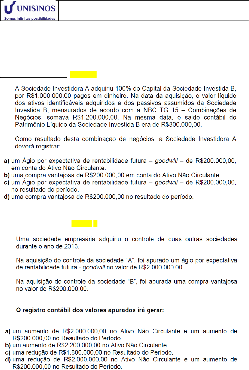 Unisinos – Graduação em Ciências Contábeis – Campus São Leopoldo Contabilidade Internacional – Semestre 2020/2 INVESTIMENTOS E COMBINAÇÃO DE NEGÓCIOS Resolva as questões e apresente os cálculos, se for o caso. Questão 1 (12; 2012-1): LETRA D Questão 2 (5; 2014-1): LETRA A Questão 3 (29; 2013-2): LETRA C Questão 4: A empresa “a” adquiriu em 02/01/2015 uma participação equivalente a 70% da empresa “b”. Na data de aquisição o valor pago foi de R$ 700.000 e o PL da investida era de R$ 1.000.000,00. Em 31/12/2015 a investida “b” apurou um Lucro Líquido de R$ 100.000,00 e destinou 40% deste valor em dividendos. Pede-se: 4.1) Por qual valor estará registrado este investimento da empresa “a” após estas operações? 742.000,00 4.2) E se a empresa “b” tivesse um prejuízo de R$ 80.000 em 2015. Como ficaria o valor do investimento da empresa “a”?? registrado pelo valor de 644.000,00 Questão 5: A empresa Alfa comprou 100% de Beta por R$ 1.000,000,00. Os dados da empresa beta são os seguintes: Item Valor Contábil Valor Justo Item Valor Contábil Valor Justo Ativo Circulante R$ 500.000 R$ 500.000 Passivo R$ 500.000 R$ 500.000 Imobilizado R$ 400.000 R$ 500.000 PL 500.000 900.000 Intangível R$ 100.000 R$ 400.000 Com base nesses dados pede-se: a) Houve compra vantajosa ou a aquisição gerou um goodwill? GEROU b) Demonstre os cálculos para justificar sua resposta. VL PG 1.000.000 Questão 6: (18; 2017-1) Em 31.12.2015, a Sociedade Anônima “A” possuía 60% de participação na Sociedade Anônima “B”. Nessa mesma data, o Patrimônio Líquido da Sociedade Anônima “B” apresentava a seguinte composição: Contas Saldo Capital Social R$ 320.000,00 Reservas de Lucro R$ 120.000,00 Ao final do exercício de 2016, a Sociedade Anônima “B” apresentou Lucro no valor de R$40.000,00. Para este caso hipotético, considerar que não há dividendo mínimo obrigatório e que todo o lucro foi destinado para Reservas de Lucro. Em 2016, não houve alteração no percentual de participação e nem houve registro de Outros Resultados Abrangentes. Até 31.12.2016, não foram observados indicativos de perda com redução ao valor recuperável. Considerando-se apenas as informações apresentadas e o Resultado da Equivalência Patrimonial, e de acordo com a NBC TG 18 (R2) – INVESTIMENTO EM COLIGADA, EM CONTROLADA E EM EMPREENDIMENTO CONTROLADO EM CONJUNTO, o saldo contábil, em 31.12.2016, que deve ser apresentado no Balanço Patrimonial individual da Sociedade Anônima “A” na conta Participação em Controladas é de: a) R$ 192.000,00. b) R$ 216.000,00. c) R$ 264.000,00. d) R$ 288.000,00. Questão 7: (12; 2015-2) Uma Sociedade Empresária Investidora apresentava, em 31.12.2014, as seguintes informações relativas às suas participações societárias. Empresa Tipo de Participação Participação no Capital da Investida Resultado da Investida, apurado em 31.12.2014 B Sem influência significativa 15% R$ 600.000,00 C Coligada 25% (R$ 200.000,00) D Controlada 60% R$ 900.000,00 E Coligada 30% R$ 100.000,00 No ano de 2014, não existiam resultados não realizados de transações entre a sociedade e suas investidas, e não foi observada nenhuma outra movimentação no Patrimônio Líquido das investidas, além do Lucro ou Prejuízo apurado em 31.12.2014. Considerando-se os dados informados, o Resultado de Equivalência Patrimonial apurado pela Investidora, em 31.12.2014, é de: a) R$ 660.000,00. b) R$ 610.000,00. c) R$ 540.000,00. d) R$ 520.000,00. 1