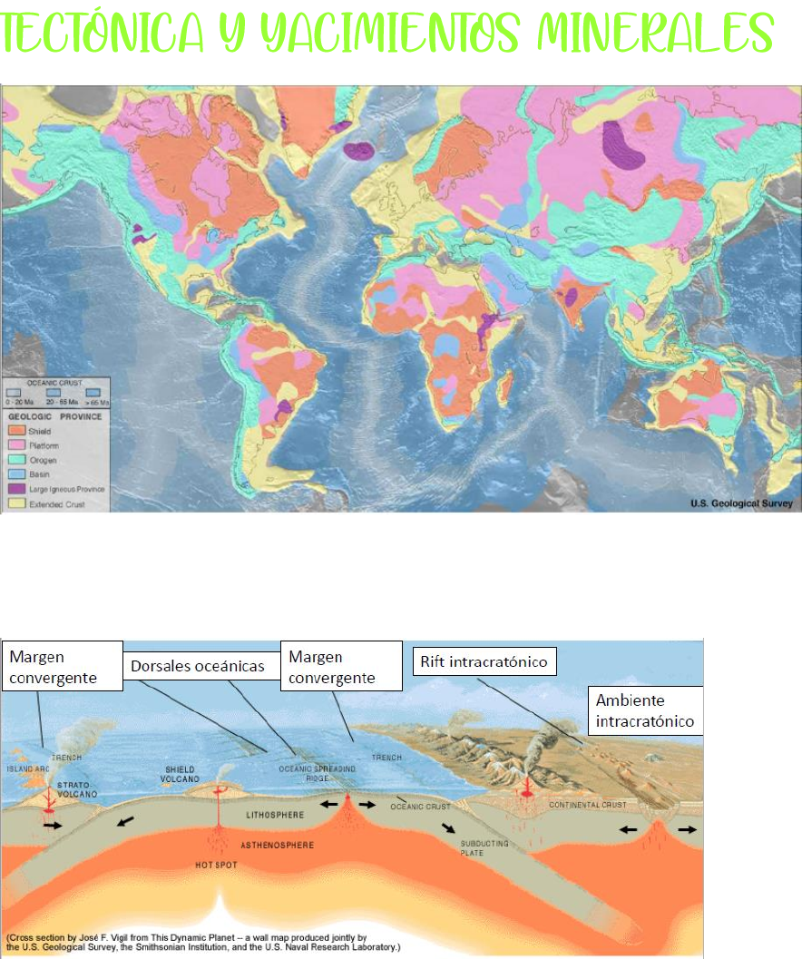 Hablaremos sobre la relación entre el ambiente tectónico (orógeno, arco, plataforma, escudo, cratones, ambientes de cuencas extensionales) y la formación de distintos tipos de yacimientos. Vimos que hubo intentos por usar lo ambientes tectónicos como una herramienta de clasificación de yacimientos, pero era difícil porque metíamos dentro de una sola categoría varios tipos de yacimientos que se forman en mismos ambientes, pero con génesis muy distintas, no es útil englobar tantos yacimientos dentro de una misma categoría. Sin embargo, es importante comprender cuales yacimientos se forman preferentemente en determinados ambientes tectónicos. En esta figura tenemos los yacimientos que se esperan encontrar en cada tipo de ambiente. Arco: pórfidos, epitermales. En zonas más profundas aparecen vetas de oro, se forman en las raíces de los orógenos, también se les llama vetas de oro orogénico, se forman en rocas metamórficas en las raíces de los orógenos y a veces en los prismas de acreción. Volcanismo submarino: VHMS (sulfuros masivos) Cuencas continentales: yacimientos de ambiente sedimentario. Lo anterior era el cuadro de la Tierra actual (todo el Fanerozoico), pero en la Tierra antigua hubo periodos muy distintos, el gradiente geotérmico era mayor, había mayor calor remanente de la acreción del planeta, había más fusión parcial en el manto y mayores tasas de magmatismo máfico y ultramáfico, ese tipo de magmas son favorables para formar yacimientos magmáticos primarios, donde los sulfuros precipitan directamente desde el magma. Esquema para la tectónica de yacimientos formados durante el Arcaico y Proterozoico, donde aparecen yacimientos de Ni-Cu, son yacimientos magmáticos primarios asociados a magmatismo primitivo. En el Proterozoico hubo periodos bastante largos donde hubo supercontinentes estables, entonces se formaban yacimientos anorogénicos (no asociados a orógenos), como yacimientos asociados a cuencas, depósitos sedimentarios en cuencas, magmatismo asociados a rift al interior de los continentes. Tipos de yacimientos muy distintos a los que se forman hoy en día. Esta evolución en el tiempo se ha usado para tratar de hacer inferencias acerca de cuales tipo de yacimientos se están formando hoy en día, si se formaron en la Tierra temprana, o si no se formaron ¿Por qué no se formaron? En la figura aparecen categorizados distintos tipos de yacimientos: Yacimientos de ambiente orogénico: que se forman en arcos volcánicos donde tenemos márgenes convergentes o márgenes divergentes pero asociados a grandes periodos de actividad tectónica, donde los continentes colisionan o se separan. Se forman sulfuros masivos, porque hay dorsales activas, y a la vez hay continentes colisionando, formando arcos volcánicos y vamos a encontrar yacimientos de ambiente de arco, como los de oro orogénicos (vetas de oro en las raíces de los orógenos) y pórfidos. Yacimientos de tipo anorogénico o sedimentario: todos los de la familia SEDEX (todos los yacimientos de ambientes sedimentario en cuencas), se forman preferentemente en periodos de super continentes estables, donde tenemos cuencas al interior de estos continentes. IOCG: se forman en el ambiente intra-cratónico (al interior de los continentes), también se pueden formar en el ambiente de arco (en Los Andes tenemos), pero los que aparecen aquí son de ambiente intra-cratónico. En la Tierra temprana hubo periodos de mucha actividad tectónica donde se formaron grandes yacimientos de oro orogénico, pero prácticamente no tenemos pórfidos de esa edad. Los pórfidos los tenemos concentrados en el periodo reciente, cuando se empieza a separar Pangea, todo este periodo reciente de gran actividad tectónica después de que se separa Pangea se asocia a la formación de casi todos los yacimientos tipo pórfidos que conocemos hoy en día. Conocemos relativamente pocos yacimientos de tipo oro-orogénico asociados a este periodo de gran actividad tectónica reciente. Si asumimos que los yacimientos de oro-orogénico se forman en ambiente profundo y los pórfidos en ambiente somero dentro de un mismo ambiente tectónico, podemos pensar que quizá en estos periodos de la tierra temprana se formaron muchos yacimientos tipo pórfido por encima de estos yacimientos de oro orogénicos que conocemos, pero que no se preservaron porque fueron erosionados. Si tenemos expuestos estos yacimientos de oro orogénicos que se forman a 10-15 km de profundidad, todo lo que estaba encima, donde podrían haber estado estos yacimientos tipo pórfido, ya se perdieron por la erosión. Lo contrario pasa en rocas recientes asociadas a periodos orogénicos mas actuales, donde los yacimientos tipos pórfidos todavía están preservados y los vemos en la superficie o a poca profundidad, en cambio los yacimientos de oro orogénico probablemente se están formando y se formaron durante este periodo reciente de act. tectónica, pero no los vemos todavía porque están muy profundos, todavía no han sido exhumados, así que nos los vemos en o cerca de la superficie. Se ha propuesto utilizar la formación de los sistemas de oro orogénico como marcadores de evolución tectónica. Asumiendo que donde tenemos mucha formación de vetas de oro en las raíces de los orógenos indican periodos de mucha actividad tectónica. Aquí se muestra la correlación entre la formación del oro orogénico y su contenido de oro en millones de onzas y su correlación con los periodos de mayor crecimiento de la corteza continental, que son periodos donde hay mucha actividad tectónica. Esos periodos de crecimiento de la corteza continental se correlacionan muy bien con los periodos donde se formaron la mayoría de los depósitos de oro orogénico. Por ejemplo, a 2.7Ga, 2.9 Ga y luego durante todo el periodo reciente después de la fragmentación de Pangea. Grupos de depósitos minerales que se formaron durante un mismo periodo de tiempo, contienen tipo de yacimient
