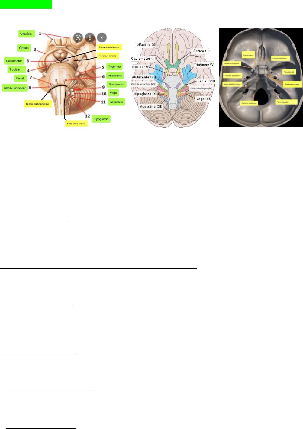 Acadêmica: Melline Ribeiro Alencar SemioNeuro – P1 Nervos cranianos: quando algum deles é lesado, será manifestado do lado afetado, ou seja, ipsilateral. Importante se atentar às artérias, como a artéria cerebelar média Mesencéfalo: núcleo rubro, nervos 3, 4, 5. Ponte: nervos 5, 6, 7, 8 Bulbo: nervos 9, 10, 11 e 12. O 5 também está aqui como núcleo do trato espinhal OBS: cabe lembrar que as fibras simpáticas estão no tórax e lombar, bem como existem fibras que passam pela carótida e inervam o olho. Já as fibras parassimpáticas estão presentes no tronco encefálico e no sacro. Se uma é inativada, a outra sobressai. Lesão de base de bulbo: compromete a piramide e o nervo hipoglosso. Como compromete a piramide, o trato corticoespinhal é comprometido, causa uma hemiparesia do lado oposto da lesão. Quando atinge outros tratos, é hemiplegia. Lesão do hipoglosso causa paralisia de metade dos musculos da lingua do lado lesado, atrofiando-os, e na protusao, lingua para lado lesado. Síndrome da arteria cerebelar posterior/ Síndrome de Wallemberg: essa arteria irriga a parte dorsolateral do bulbo. Tromboses dessa arteria pode lesar o pedunculo cerebelar inferior, o trato espinhal do trigêmeo (ipsi), o trato espinotalamico lateral (contralateral) e o nucleo ambiguo ( degluticao e fonação afetadas). Síndrome bulbar medial: lesa nervo hipoglosso, lemnisco medial (grácil e cuneiforme) e corticoespinhal. Lesão da base da ponte: compromete o trato corticoespinhal e nervo abducente, tendo uma hemiparesia do lado oposto do corpo ao lesado, e paralisia do musculo reto lateral do lado ipsilateral a lesão. Individuo com diplopia. Lesão a nivel de trigêmeo: compromete o trato corticoespinhal e nervo trigêmeo. Causa hemiplegia do lado oposto e a lesão do trigêmeo causa pertubação motora, como paralisia na mastigação, e sensitiva, como anestesia da face. A lesão pode estender ao lemnisco medial, perdendo propriocepcao consciente e tato do lado oposto ao lesado. A síndrome de encarceramento é um estado de vigília e consciência com tetraplegia e paralisia dos pares cranianos inferiores, resultando em incapacidade para exibir expressões faciais, movimentar-se, falar ou comunicar-se, exceto por códigos mediante movimentos oculares. A síndrome pseudobulbar caracteriza-se por disartria, disfagia e disfonia, deficiência dos movimentos voluntários da língua e músculos faciais e por labilidade emocional. Ou seja, dos nervos cranianos. Acadêmica: Melline Ribeiro Alencar I- Olfatório: - sensitivo - origem aparente no crânio: lâmina crivosa do osso etmoide - origem aparente no encéfalo: bulbo olfatório Lesões: geram quadro de anosmia (perda do olfato), hiposmia ( diminuição do olfato), cacosmia (odor desagradável). Meningioma de goteira olfatória: Os meningiomas da goteira olfatória são tumores benignos na grande maioria das vezes, porém quando adquirirem tamanhos maiores, podem causar compressão de estruturas nervosas, causando déficits neurológicos motores ou até mesmo cegueira II- Óptico: - sensitivo - origem aparente no crânio: canal óptico - origem aparente no encéfalo: quiasma óptico ( um tumor de hipófise pode comprimir) OBS: Papila edema é causado por aumento da pressão intercraniana que causa dores, alterações visuais e vômitos. OBS: escotoma caracteriza-se pela perda total ou parcial da visão numa região do campo visual, que geralmente se encontra rodeada por uma área onde a visão está preservada, criando um efeito de "buraco negro" na imagem enxergada. Tumor hipofisario que comprime o quiasma optico que é por onde cruza retina nasal, resulta em hemianopsia bitemporal. O adenoma pode aumentar secrecao de gh e gerar acromegalia. Lesões na via optica: Acadêmica: Melline Ribeiro Alencar Reflexo pupilar: Aferência: pelo nervo optico Eferência: oculomotor Se lesar a via aferente/optica de onde colocou a luz, não terá o reflexo nem direto e nem indireto/consesual. Se lesar o nervo oculomotor do olho que pos a luz, não terá o reflexo direto, mas terá o indireto/consensual. Se lesar o oculomotor do outro olho, não terá o reflexo consensual O reflexo fotomotor direto ocorre quando a luz incide sobre o olho, e a partir da retina, pelo nervo optico, vai passar pelo quiasma e trato optico, dirigindo-se ao corpo geniculado lateral, até a área pre-tectal. A via eferente desse reflexo se origina da conexa no núcleo de Edinger-Westphal que envia fibras pelo oculomotor, o que vai provocar a contração do musculo esfíncter da pupila, causando miose. O reflexo fotomotor indireto/consensual corresponde ao reflexo fotomotor de forma bilateral. O olho contralateral ao estimulado pela luz tambem terá a miose. Reflexo de piscar: é no mesmo entendimento que o reflexo acima. A diferença é que a aferencia é do nervo optico e a eferencia do nervo facial. III- Oculomotor: - motor da maior parte dos músculos, exceto oblíquo superior e reto lateral - origem aparente no crânio: fissura orbitária superior - origem aparente no encéfalo: fossa interpeduncular Midríase: palavra maior; aumento das pupilas; dilatação; Miose: palavra pequena; diminuição das pupilas; retração OBS: lesão/paralisia aqui pode causar midríase (dilatação da pupila), estrabismo divergente, ptose palpebral. - Midriase tem ação do simpático e paralisia dele, prevalece o parassimpático. - No caso de oculomotor quase não dá diplopia pq o olho totalmente lesionado costuma estar fechado. OBS: Oftalmoparesia é uma doença neurológica caracterizada pelo enfraquecimento de um ou mais músculos do olho, dificultando assim alguns ou todos movimentos dos olho. A oftalmoplegia é perda total. Oftalmoplegia total e internuclear: a total tem a ver com o nervo, perdendo reflexo pupilar direto. Já a internuclear Acadêmica: Melline Ribeiro Alencar tem relação com o fasciculo longitudinal medial, uma vez que as fibras que coordenam o movimento dos olhos es