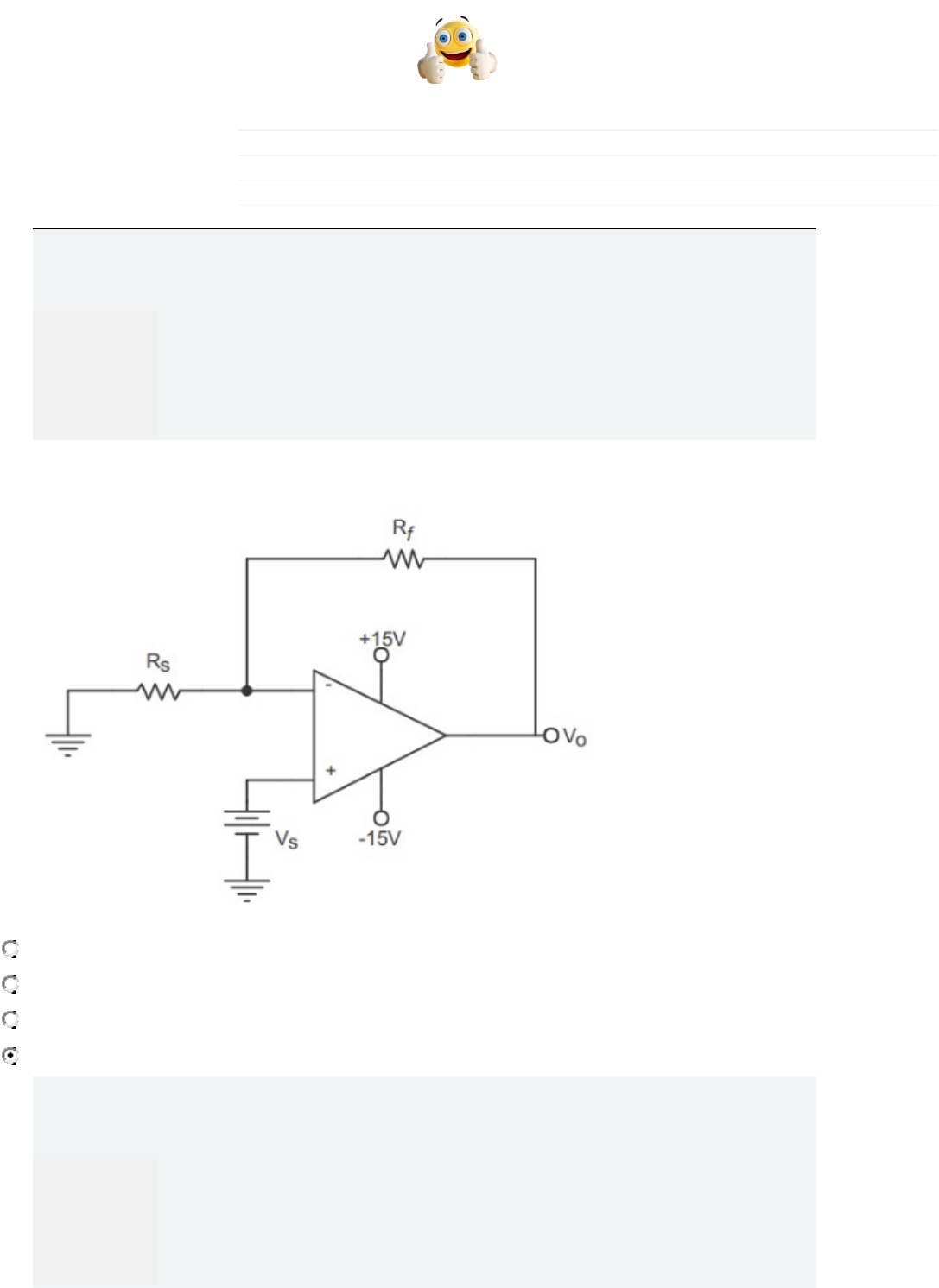 Amigo se o conteúdo foi útil para você dê o seu, vai me ajudar bastante. Obrigado! Iniciado em terça, 23 Nov 2021, 20:40 Estado Finalizada Concluída em terça, 23 Nov 2021, 20:46 Tempo empregado 6 minutos 4 segundos Avaliar 10,00 de um máximo de 10,00(100%) Parte superior do formulário Questão 1 Completo Atingiu 2,00 de 2,00 Marcar questão Texto da questão Para o circuito a seguir, determine Vo para Vs = 2V, considerando Rf = 10,0 kΩ e Rs = 5,0 kΩ; Escolha uma opção: 4,0 V 7,0 V 5,0 V 6,0 V Questão 2 Completo Atingiu 2,00 de 2,00 Marcar questão Texto da questão Para o circuito a seguir, considere Rf = 10kΩ e Rs = 10kΩ, Ra = 60kΩ e Rb = 30kΩ; Qual o valor de Vo para Va = 2V e Vb = 4,5V? Escolha uma opção: 3,0 V 1,0V 4,0 V 2,0 V Questão 3 Completo Atingiu 2,00 de 2,00 Marcar questão Texto da questão Para o circuito a seguir, considerando Rf = 10,0 kΩ e Rs = 4,0 kΩ; Calcule o valor de Vo para Vs = 2V; Escolha uma opção: 50 v -50 v 5,0 v -5,0 v Questão 4 Completo Atingiu 2,00 de 2,00 Marcar questão Texto da questão Para o circuito a seguir, determine o valor de Vo para Va = 2V, Vb = 10V e Vc = ‐3V; Escolha uma opção: 12,0 V 10,0 V 11,0 V 9,0 V Questão 5 Completo Atingiu 2,00 de 2,00 Marcar questão Texto da questão Para o circuito a seguir, determine o valor de Vo para Va = 4V e Vb = ‐2V; Escolha uma opção: 0,0 V 3,0 V 4,0 V 1,0 V Parte inferior do formulário Amigo se o conteúdo foi útil para você dê o seu, vai me ajudar bastante. Obrigado!
