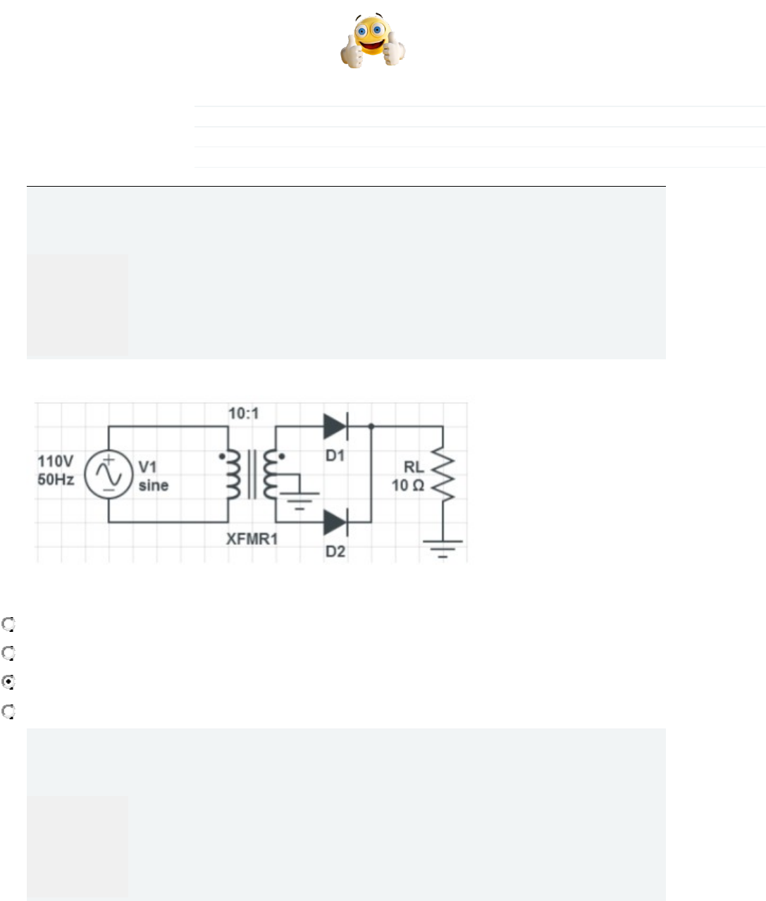 Amigo se o conteúdo foi útil para você dê o seu, vai me ajudar bastante. Obrigado! Iniciado em terça, 23 Nov 2021, 20:13 Estado Finalizada Concluída em terça, 23 Nov 2021, 20:19 Tempo empregado 5 minutos 46 segundos Avaliar 10,00 de um máximo de 10,00(10%) Parte superior do formulário Questão 1 Completo Atingiu 2,00 de 2,00 Marcar questão Texto da questão Qual a Tensão e a Corrente RMS na Carga do Circuito abaixo. Vrms = 5,5V e Irms = 550mA Escolha uma opção: Vrms = 5,5V e Irms = 550A Vrms = 55V e Irms = 5,50A Vrms = 5,5V e Irms = 550mA Vrms = 5,5A e Irms = 550mV Questão 2 Completo Atingiu 2,00 de 2,00 Marcar questão Texto da questão Calcule a corrente eficaz na Carga RL: Resposta: Questão 3 Completo Atingiu 2,00 de 2,00 Marcar questão Texto da questão O que é Tensão Eficaz (ou Tensão RMS) ? Escolha uma opção: É o valor médio de uma tensão alternada ao longo do tempo É a É a tensão máxima de um sinal ACtensão máxima de um sinal AC É o valor de tensão que um sinal alternado teria se ele fosse contínuo puro É o valor de pico de um sinal DC Questão 4 Completo Atingiu 2,00 de 2,00 Marcar questão Texto da questão Para o circuito retificador abaixo: Qual a tensão Média e Eficaz na Carga? Escolha uma opção: 1,05 A 1051 V 1,051 V 10,51 V Questão 5 Completo Atingiu 2,00 de 2,00 Marcar questão Texto da questão Ripple é o componente de corrente alternada (Vca) que se sobrepõe ao valor médio da tensão de uma fonte de corrente contínua (Vcc). A origem da ondulação normalmente está associada à utilização de carregadores baseados em retificadores. Escolha uma opção: Verdadeiro Falso Parte inferior do formulário Amigo se o conteúdo foi útil para você dê o seu, vai me ajudar bastante. Obrigado! 1,09A