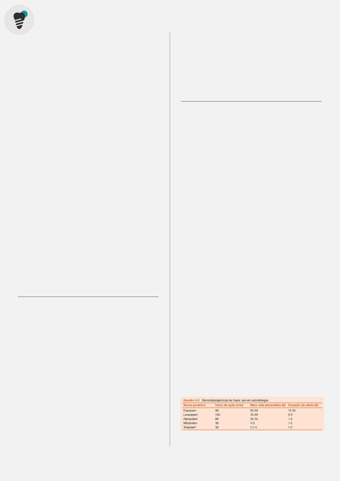 Vinícius Bandeira | @viniciusbdentista Como controlar a ansiedade do paciente odontológico Os métodos de controle da ansiedade podem ser farmacológicos ou não farmacológicos. Os farmacológicos, que podem ser desde a sedação mínima até a anestesia geral, podem ser classificados em sedação mínima, moderada e profunda. A sedação moderada envolve a combinação de vários agentes sedativos e o uso de sedativos por via parenteral. A sedação profunda é obtida com altas doses de sedativos por via oral, inalatória ou parenteral. Já a sedação mínima, é definida como “uma discreta depressão do nível de consciência, produzida por método farmacológico, que não afeta a habilidade do paciente de respirar de forma automática e independente e de responder de maneira apropriada à estimulação física e ao comando verbal”. Na clínica odontológica, os benzodiazepínicos (BDZ) são os ansiolíticos mais empregados para se obter a sedação mínima por via oral, pela eficácia, boa margem de segurança clínica e facilidade posológica. A técnica de sedação mínima pela inalação da mistura de óxido nitroso (N2O) e oxigênio (O2), por sua vez, está gradativamente conquistando mais espaço na odontologia, sendo um recurso terapêutico seguro quando corretamente empregada por cirurgião-dentista habilitado. Indicações para a sedação farmacológica em odontologia Quando o quadro de ansiedade aguda não for controlável apenas por meio de métodos não farmacológicos. Nas intervenções mais invasivas (drenagem de abscessos, exodontia de inclusos, cirurgias periodontais, perirradiculares ou implantodônticas, etc.), mesmo em pacientes normalmente cooperativos ou que aparentarem estar calmos e tranquilos. No atendimento de pacientes portadores de doença cardiovascular, asma brônquica ou com história de episódios convulsivos, com a doença controlada, com o objetivo de minimizar as respostas ao estresse cirúrgico. obs.: nesses casos, sempre que possível, deve-se entrar em contato com o médico que trata do paciente, para troca de informações e avaliação conjunta dos riscos e benefícios da sedação mínima por via oral ou inalatória. Logo após traumatismos dentários acidentais, situações que requerem pronto atendimento, muitas vezes em ambiente ambulatorial. Benzodiazepínicos Eles se ligam a estruturas ligadas ao SC e ao sistema límbico, onde facilitam a ação do GABA, que é um neurotransmissor inibitório primário do SNC. O gaba induz a abertura dos canais de Cloro da membrana dos neurônios, aumentando a entrada do Cloro para o interior da célula, o que resulta na diminuição dos impulsos excitatórios, tendo como objetivo controlar a reações somáticas e psíquicas geradas pela ansiedade. Vantagens Reduz o fluxo salivar e o reflexo do vômito, provoca o relaxamento da musculatura, mantém a pressão arterial ou a glicemia e induz a amnésia anterógrada. A amnésia anterógrada é outro efeito colateral dos benzodiazepínicos, que pode ocorrer mesmo quando empregados em dose única. É definida como o “esquecimento dos fatos que se seguiram a um evento tomado como ponto de referência”. Geralmente coincide com o pico de atividade do medicamento, sendo mais comum com o uso do midazolam e do lorazepam. Efeitos colaterais Os benzodiazepínicos apresentam baixa incidência de efeitos colaterais, particularmente quando empregados em dose única ou por tempo restrito. A sonolência é o mais comum desses efeitos, principalmente com o uso do midazolam e do triazolam, por conta de sua ação hipnótica (indução do sono fisiológico). Terapêutica | UFPE (2021.1) Vinícius Bandeira | @viniciusbdentista A ação dos benzodiazepínicos é praticamente limitada ao SNC, embora mínimos efeitos cardiovasculares sejam observados, como a discreta diminuição da pressão arterial e do esforço cardíaco. No sistema respiratório, podem causar leve redução do volume de ar corrente e da frequência respiratória. O midazolam, particularmente, pode provocar alucinações ou fantasias de caráter sexual. Recomenda-se, portanto, que o profissional tenha a companhia de uma terceira pessoa no ambiente do consultório. Critérios de escolha, dosagem e posologia Alguns critérios devem ser considerados, como a idade e o estado físico do paciente, o tipo e a duração do procedimento. Como a duração dos procedimentos odontológicos, em média, não ultrapassa 60 min, o midazolam é o fármaco de escolha para jovens e adultos, pelo rápido início de ação (30 min) e menor duração do efeito ansiolítico (1-2 h). Em idosos, além de serem metabolizados e excretados de forma mais lenta, os benzodiazepínicos, pela sua lipossolubilidade, depositam-se no tecido gorduroso que substitui a massa muscular nesses indivíduos. Por isso, o fármaco ideal é o lorazepam, que se constitui numa boa alternativa ao midazolam, por apresentar menor incidência de efeitos paradoxais ou amnésia anterógrada e .cuja meia-vida plasmática é intermediária entre o triazolam e o diazepam. Apenas dois benzodiazepínicos são atualmente recomendados para uso em crianças: o diazepam e o midazolam, sendo que ambos apresentam vantagens sobre outros agentes sedativos como a prometazina, a hidroxizina e o hidrato de cloral. Sedação mínima pela técnica de inalação da mistura de N2O e O2 É benéfica para pacientes que apresentam problemas de ordem sistêmica, como os portadores de doença cardiovascular ou de distúrbios convulsivos, entre outras, devido à constante suplementação de oxigênio que a mistura proporciona. É contraindicada para pacientes com respiração bucal ou obstrução nasal, nos portadores de doença pulmonar obstrutiva crônica (enfisema, bronquite severa), na presença de infecções respiratórias agudas e, ainda, no caso de sujeitos que foram submetidos à quimioterapia com bleomicina, pelo risco de desenvolvimento de fibrose pulmonar. Principa